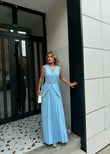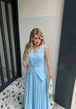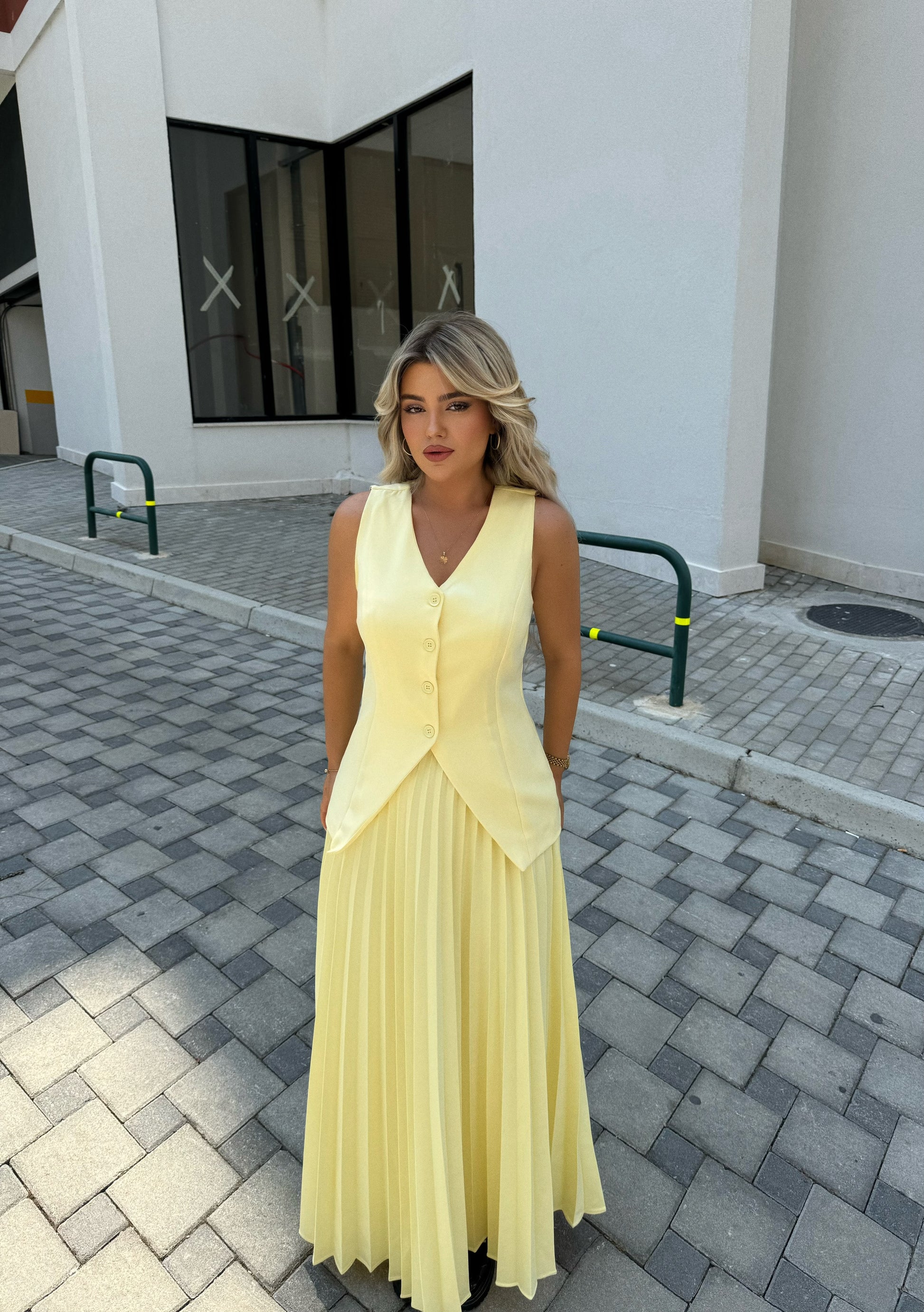 Set me dy pjese. Eshte me jelek me kopsa para dhe fund te gjate me pala. Eshte ne ngjyren e bardhe,e verdhe dhe bojeqielli. Stil dhe komod.