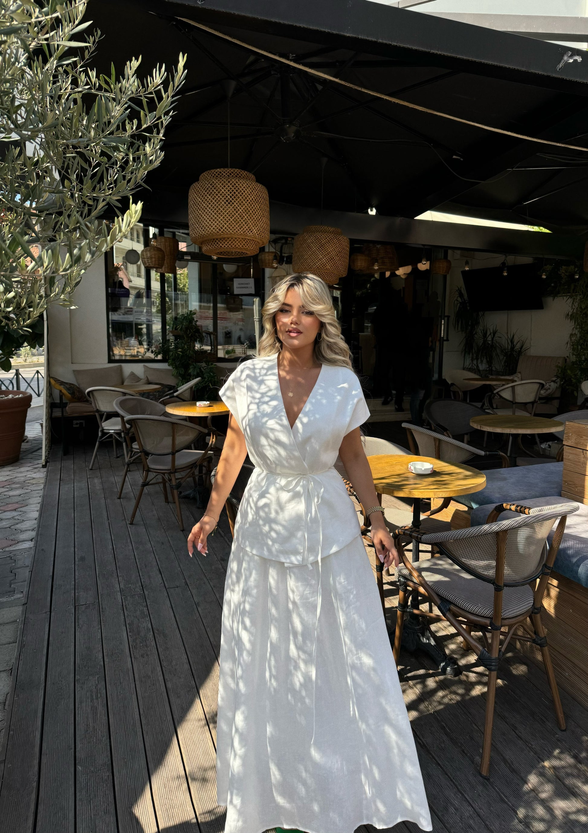 Set me dy pjese ne ngjyren e bardhe. Eshte me jelek me rrip ne bel dhe fund te gjate,te gjere. Ka material te plote dhe cilesi fantastike.