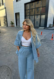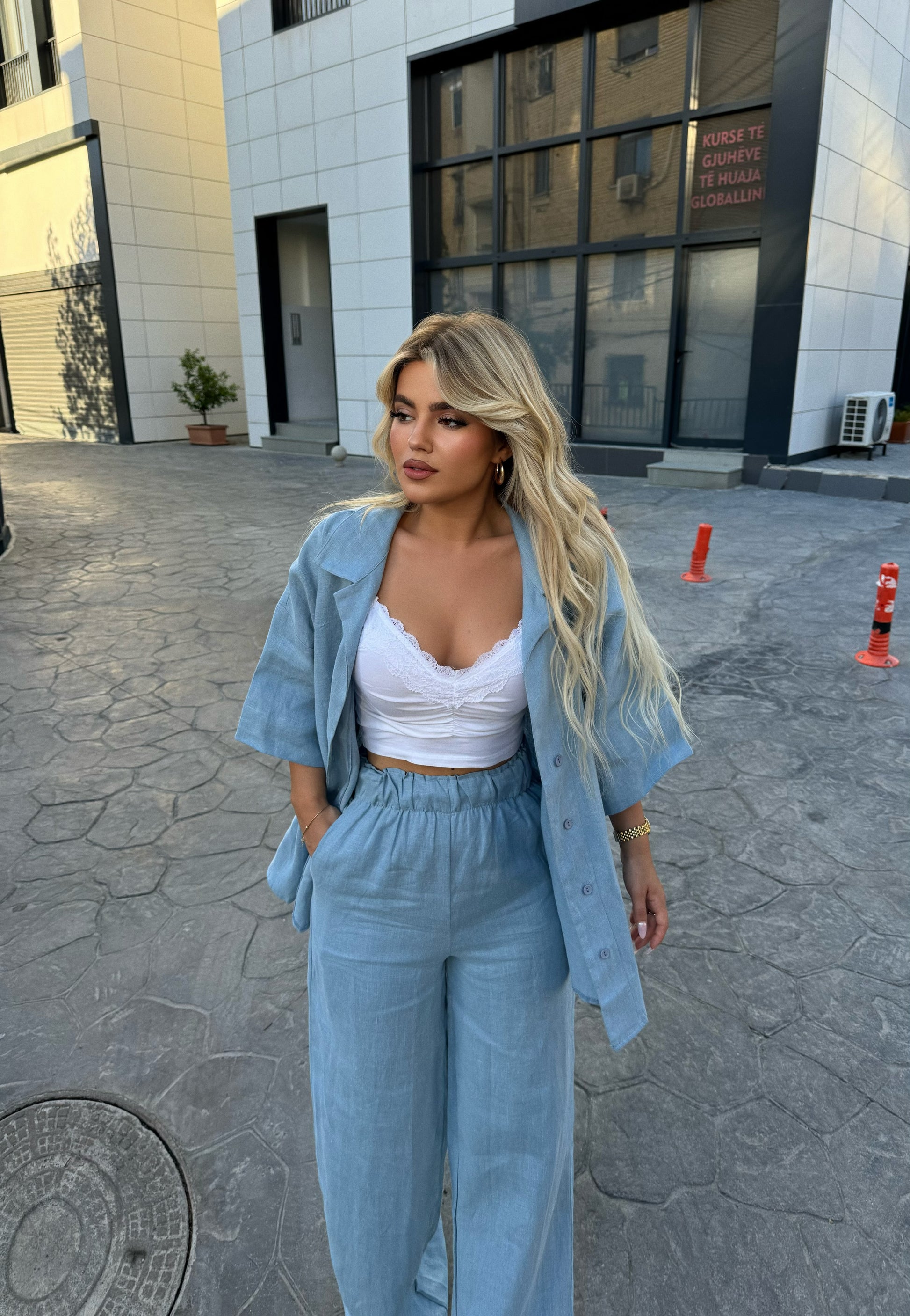 Set lino me dy pjese. Vjen me kemishe dhe pantallona te gjata. Ka material te plote , mjaft komod ne trup.