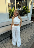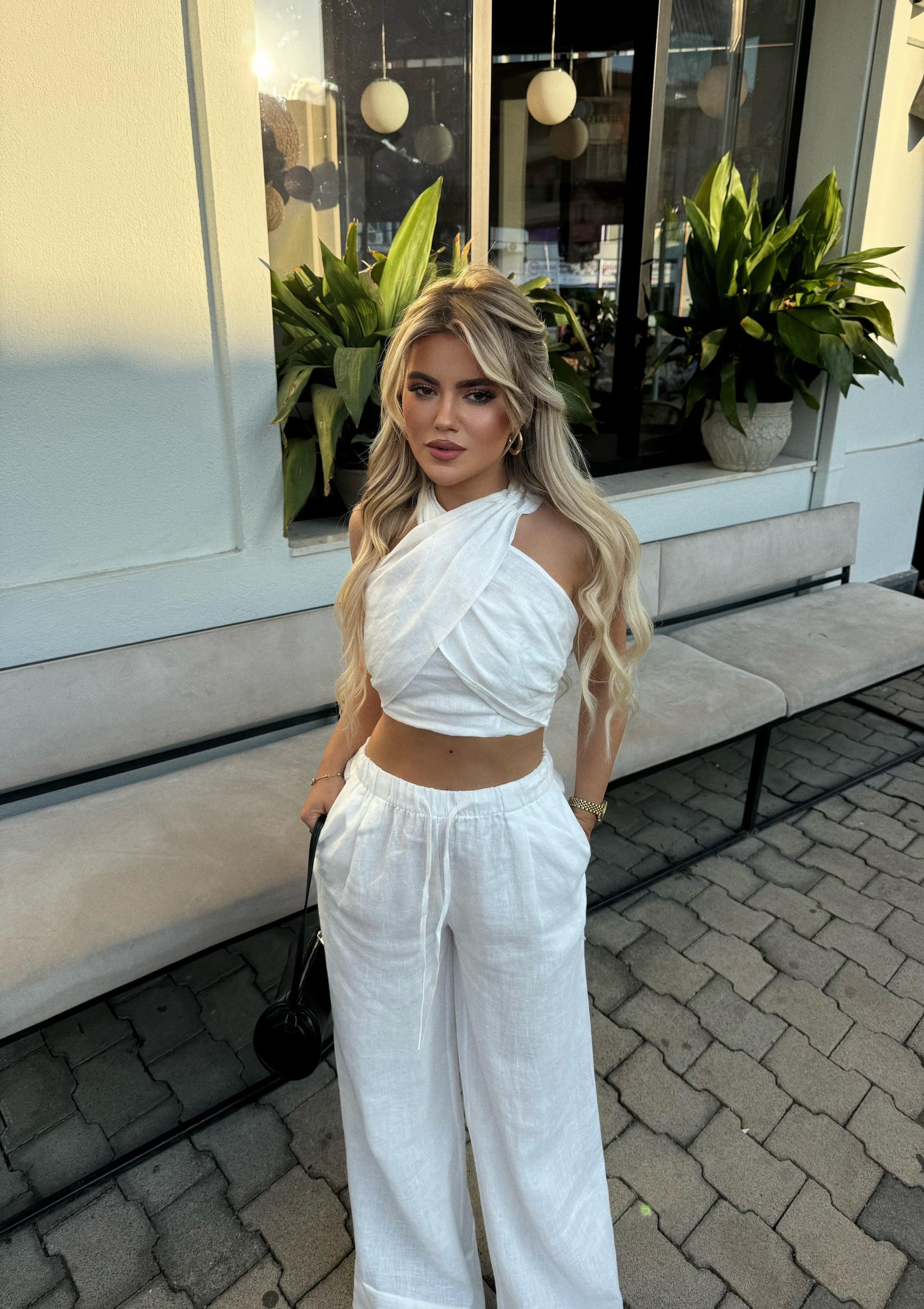 Set me dy pjese , vjen me crop i cili lidhet tek qafa dhe pantallona te gjata. Pershtatet yll ne trup.