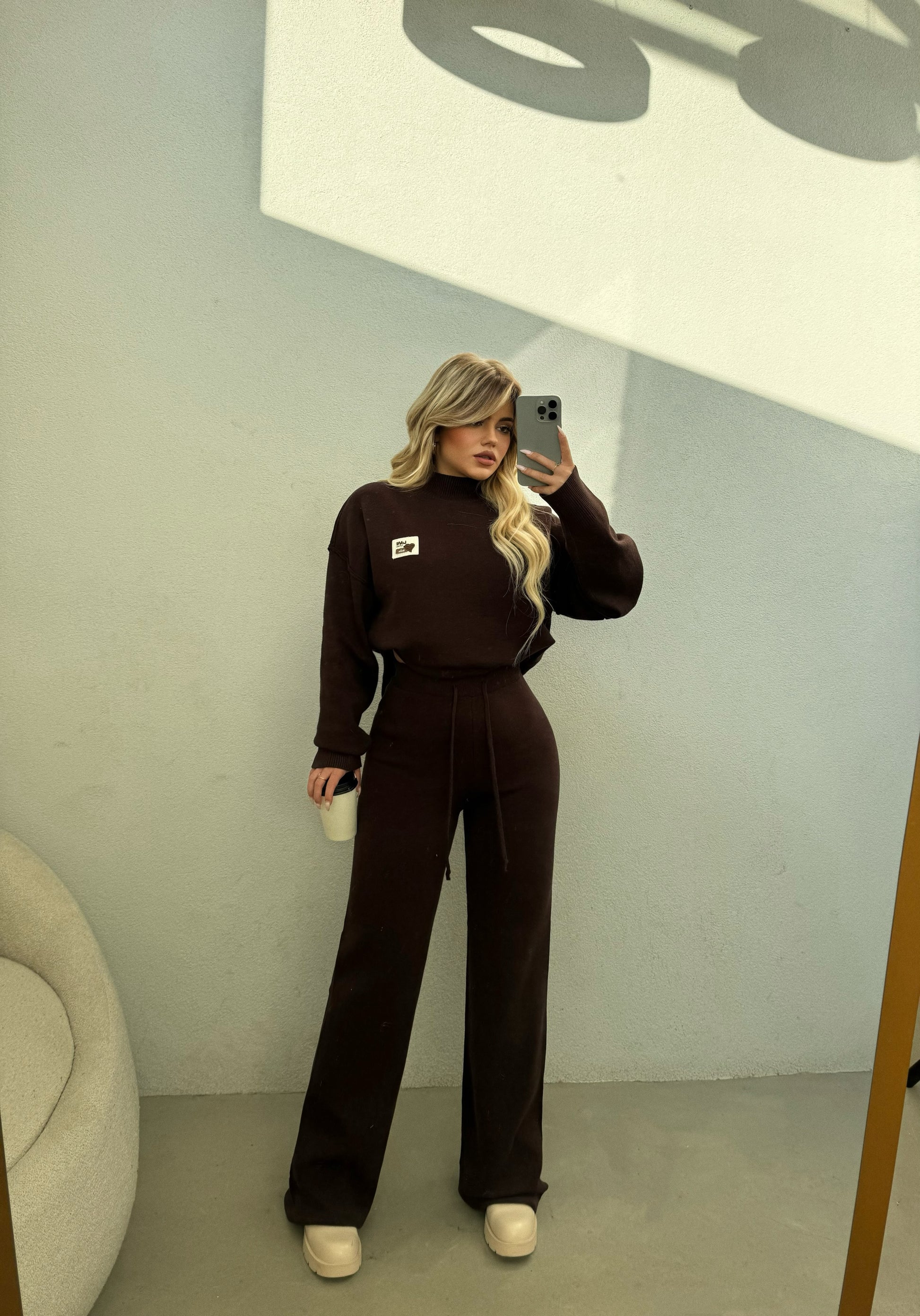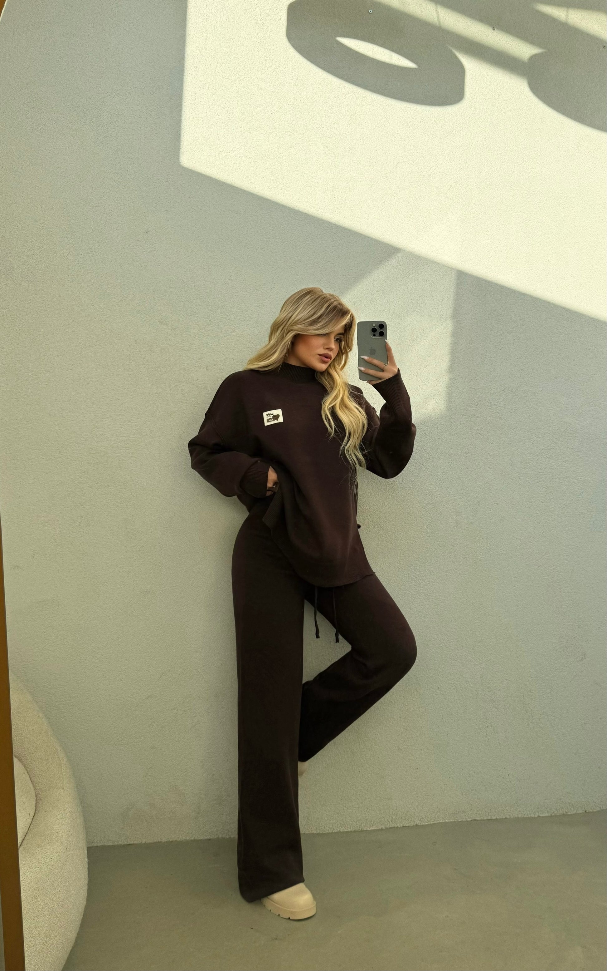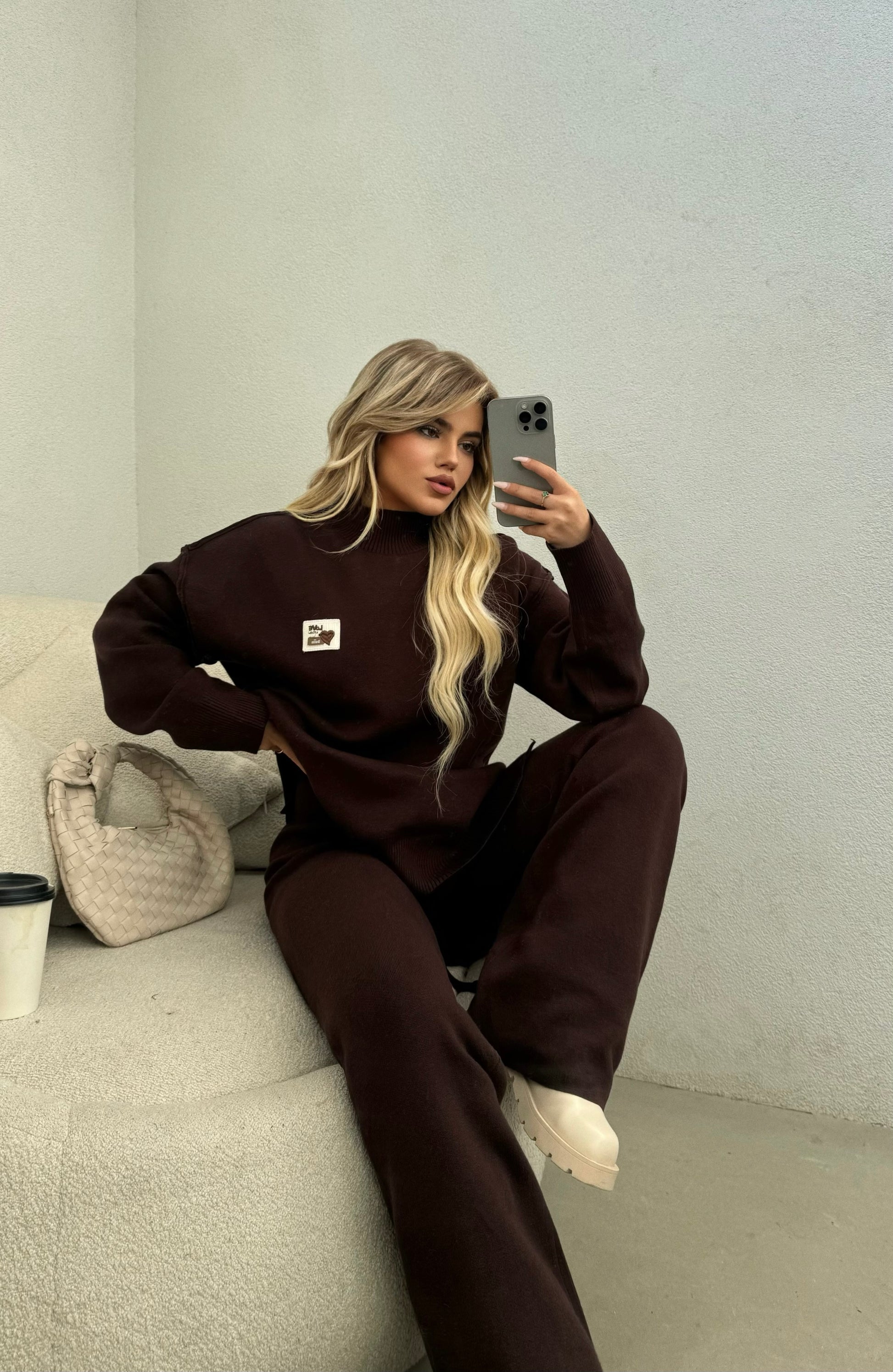 Set i trikotuar me dy pjese, golf dhe pantallona ne ngjyren kafe. Material i plote, i ngrohte perfekt per stinen. Teper komod dhe praktik ne trup.