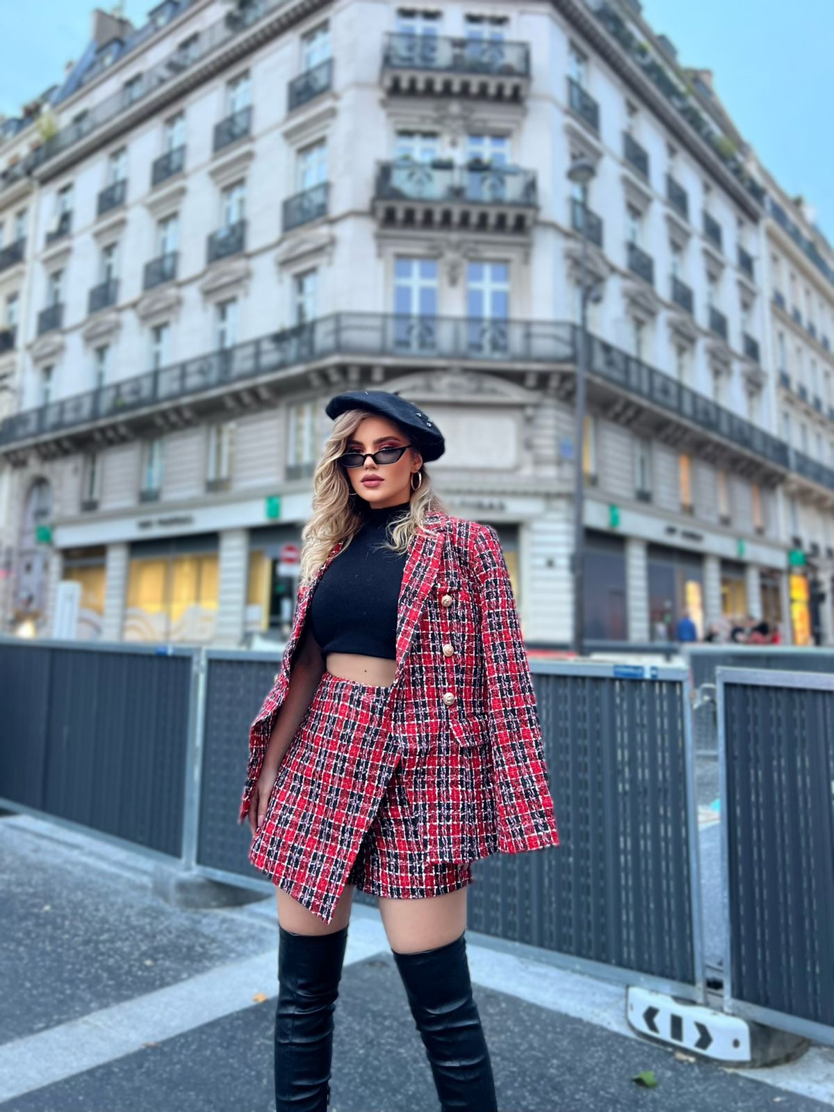 Kostum me fundpantallona me xhaket te gjate me kipsa ne pjesen e perparme. Me xhepa pllak ne pjesen e perparme. Xhaketa eshte me menge te gjata me jake me kapak.