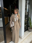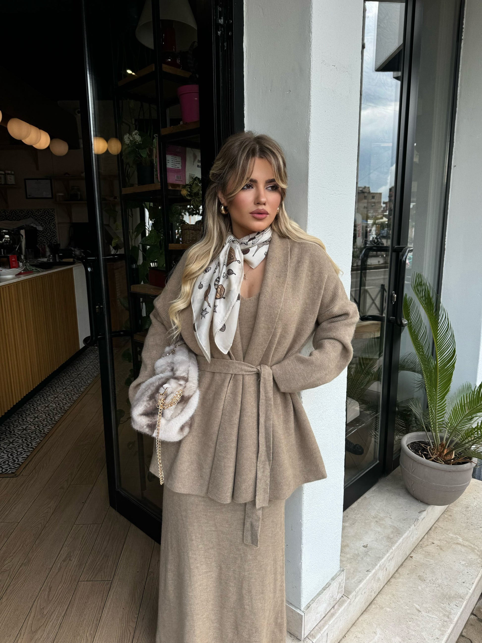 Set ne ngjyren kafe. Seti vjen me dy pjese, seti perpehet nga fustani dhe crdigani i shkurter. Teper stil dhe i ngrohte per ditet e ftohta te dimrit.