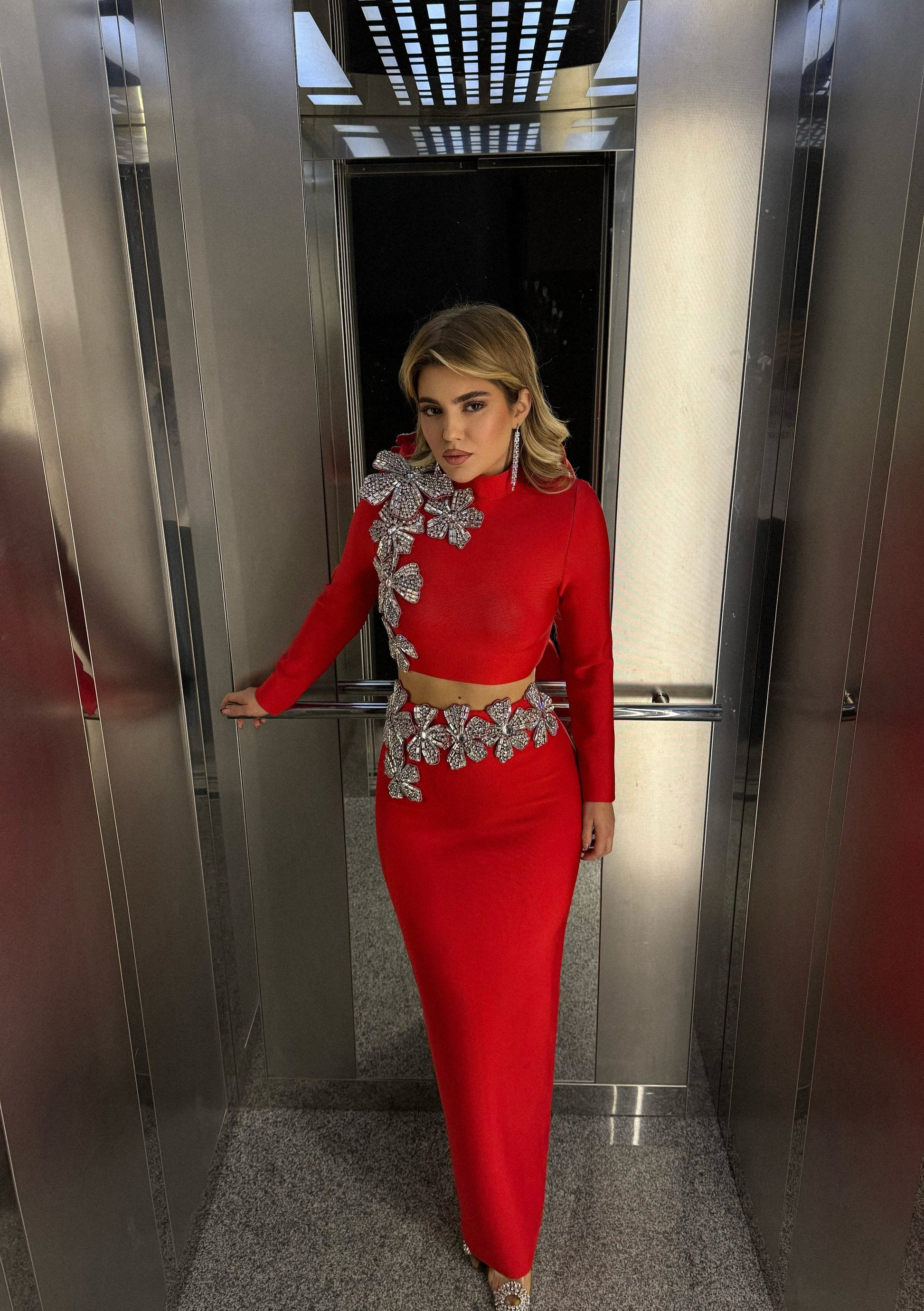 Set crop me menge te gjata me gure dhe fund i gjate me gure tek beli. Material i gomuar.