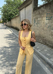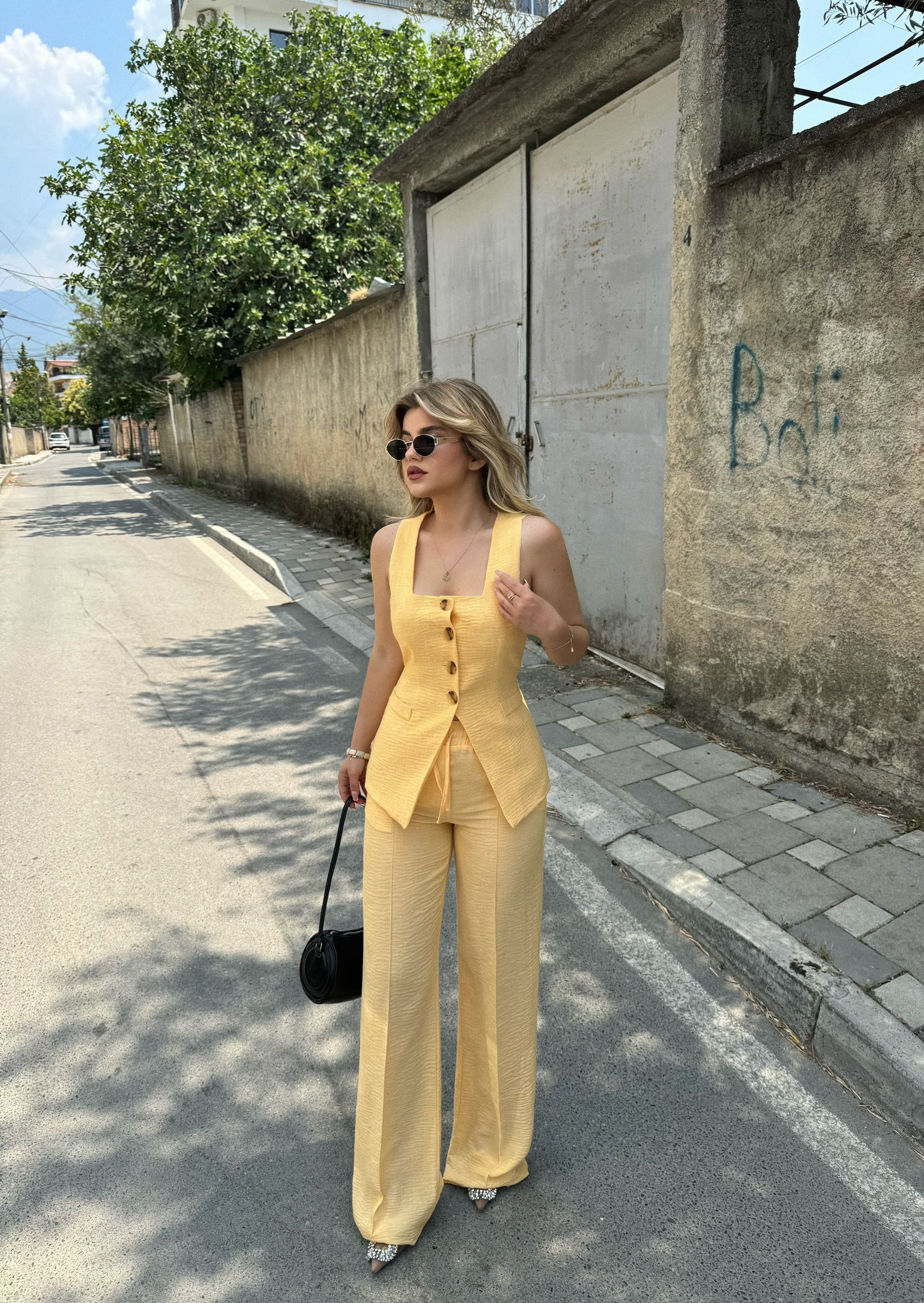 Set me dy pjese. Eshte me jelek me kopsa para dhe rrip ne bel dhe pantallona te gjata. Ka material te plote dhe cilesi fantastike. Komod dhe praktik.