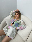 Set kemishe dhe pantallona te shkurter me lule. Kemisha eshte me krahe te gjate dhe kopsa para. Ka dizenjo lulesh dhe material te plote. Pantallonat jane me llastik ne bel.
