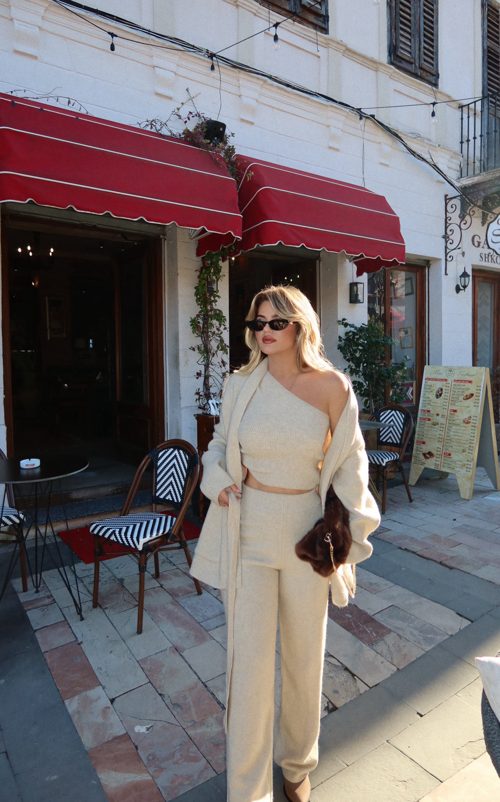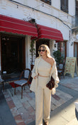 Set me tre pjese ne ngjyren bezhe, material i bute dhe i ngrohte. Lehtesishte i kombinueshem ne perditshmerin tuaj. Bluze me nje menge, tuta me llastik ne bel dhe cardigan me lidhese ne bel.