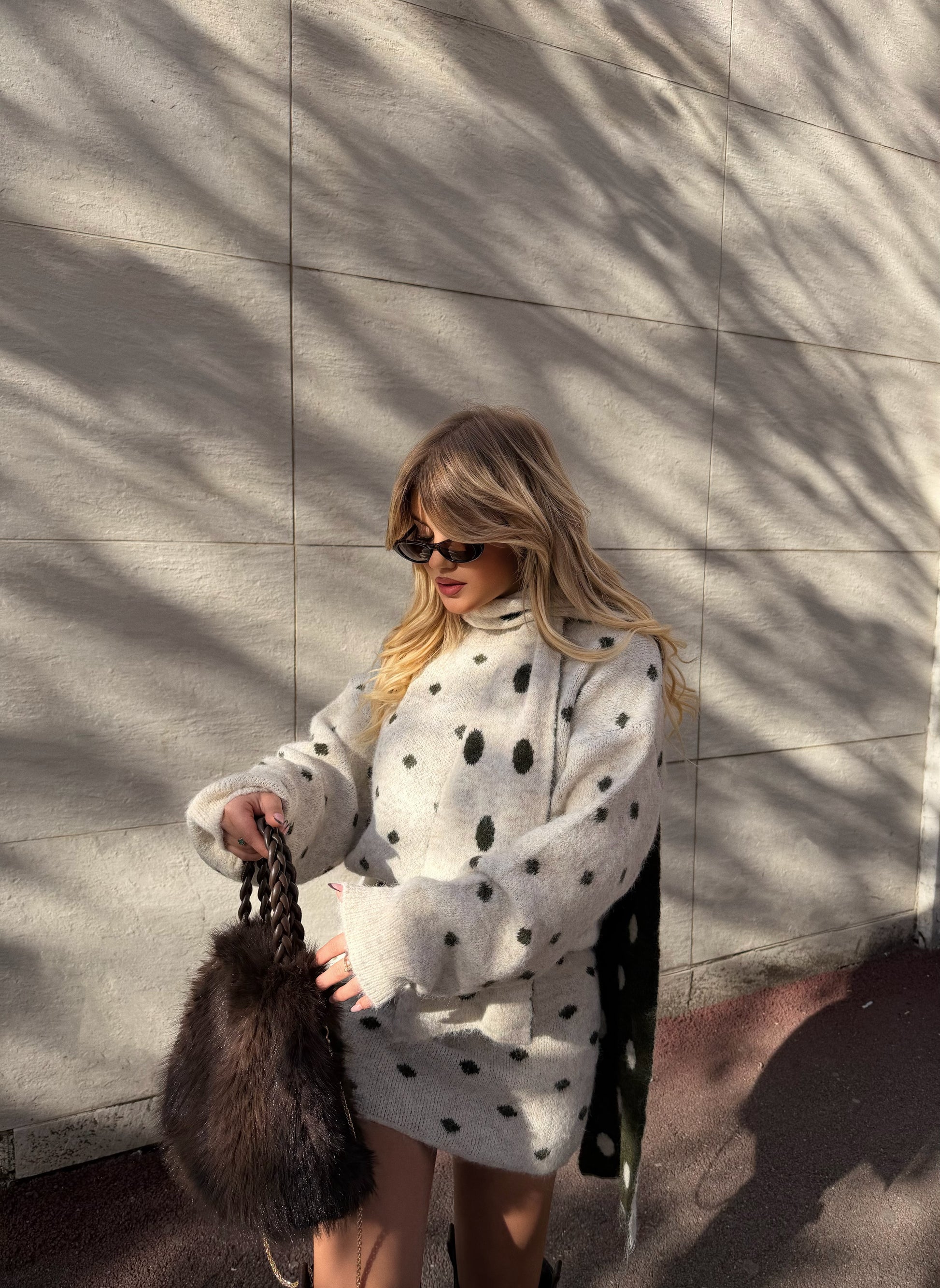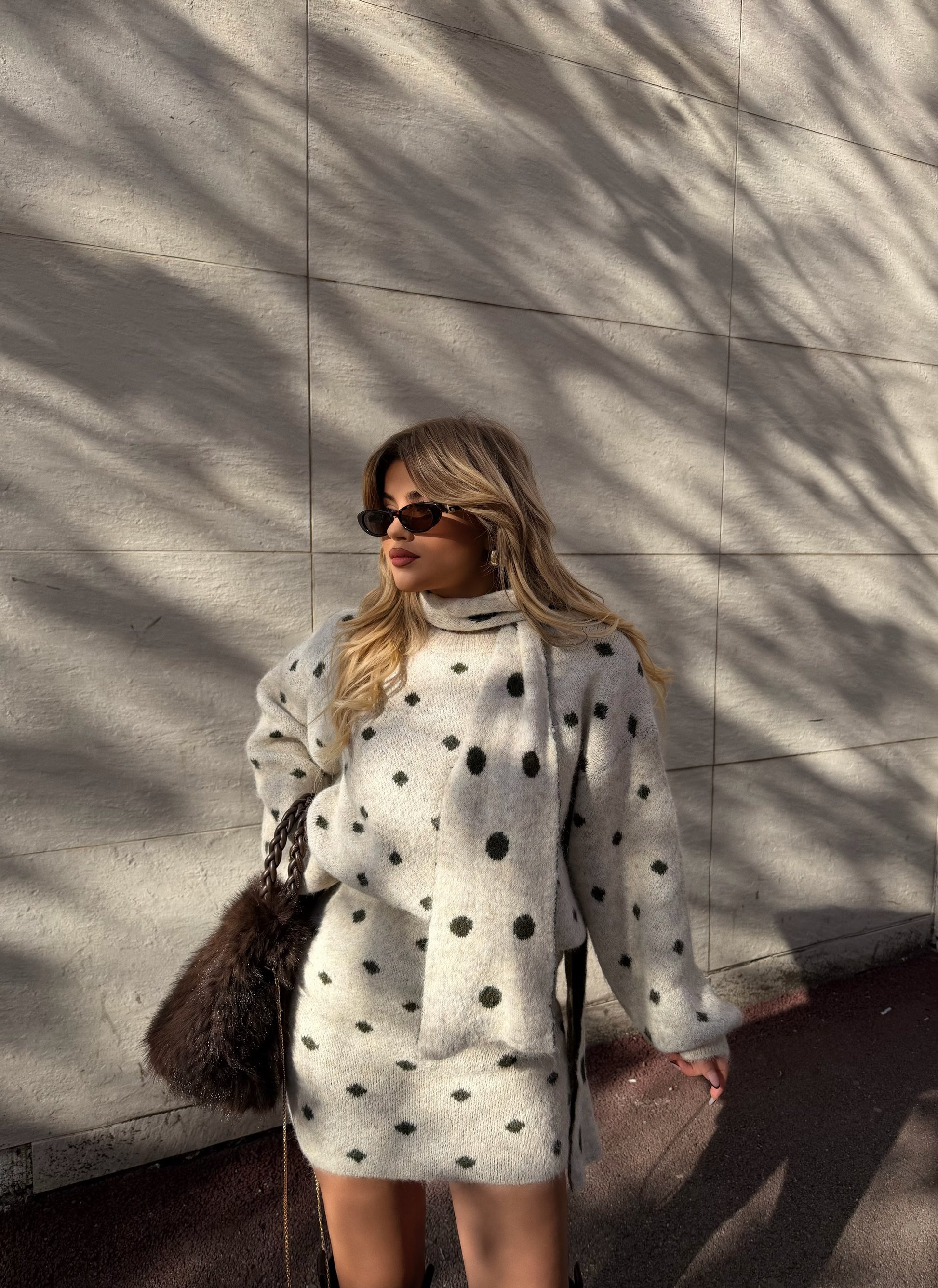 Seti bezhe me tre pjese, fund i shkurter,pulover dhe shall. Seti vjen me nje dizajn te vecante me topa jeshil. I thjeshte, por me detaje qe e bejne te vecante.