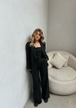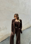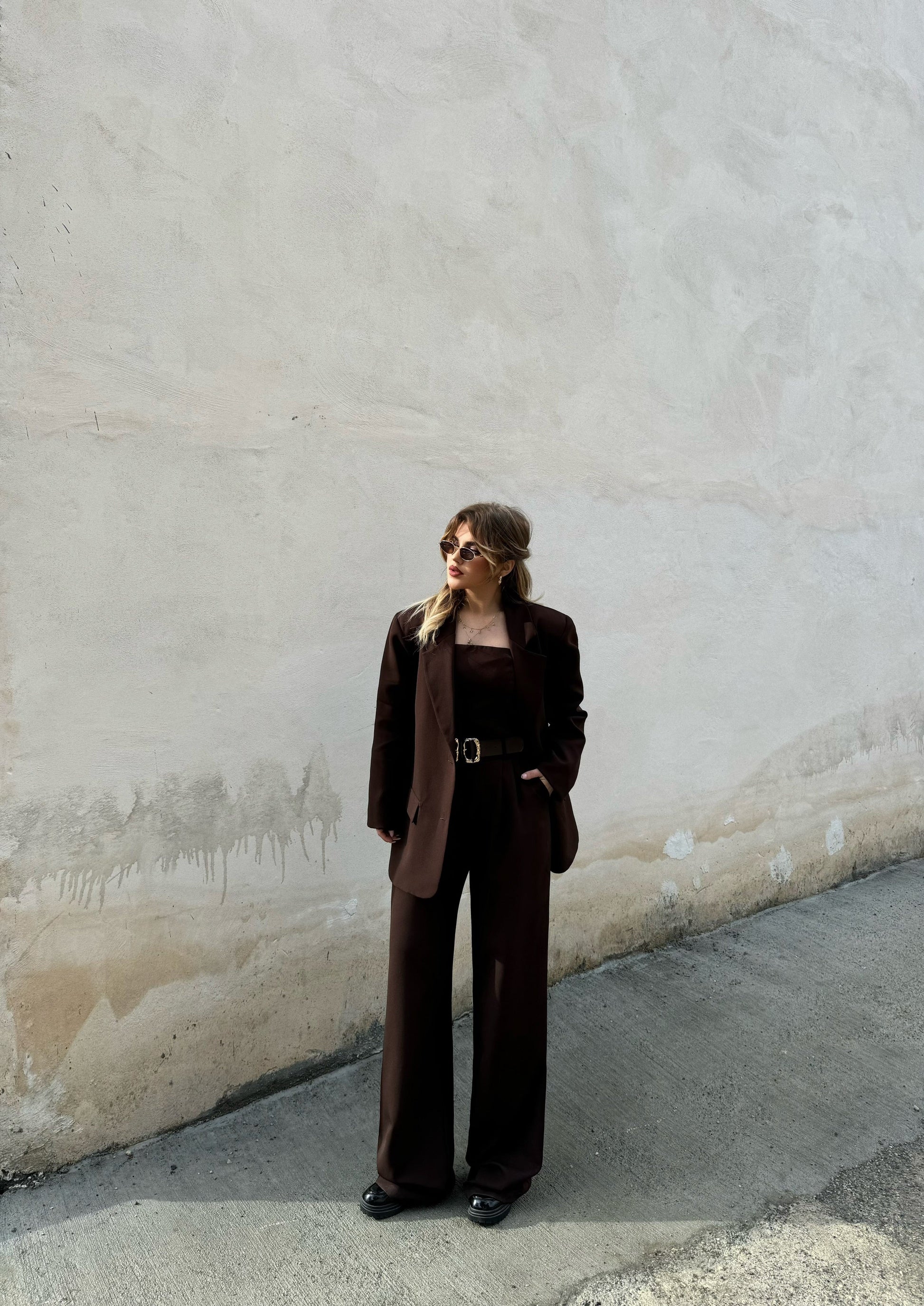 Set klasik ne ngjyren kafe. Seti perbehet nga tre pjese crop,xhaketa oversize dhe pantallonat prerje e drejte. Ideal per nje pamje elegante.