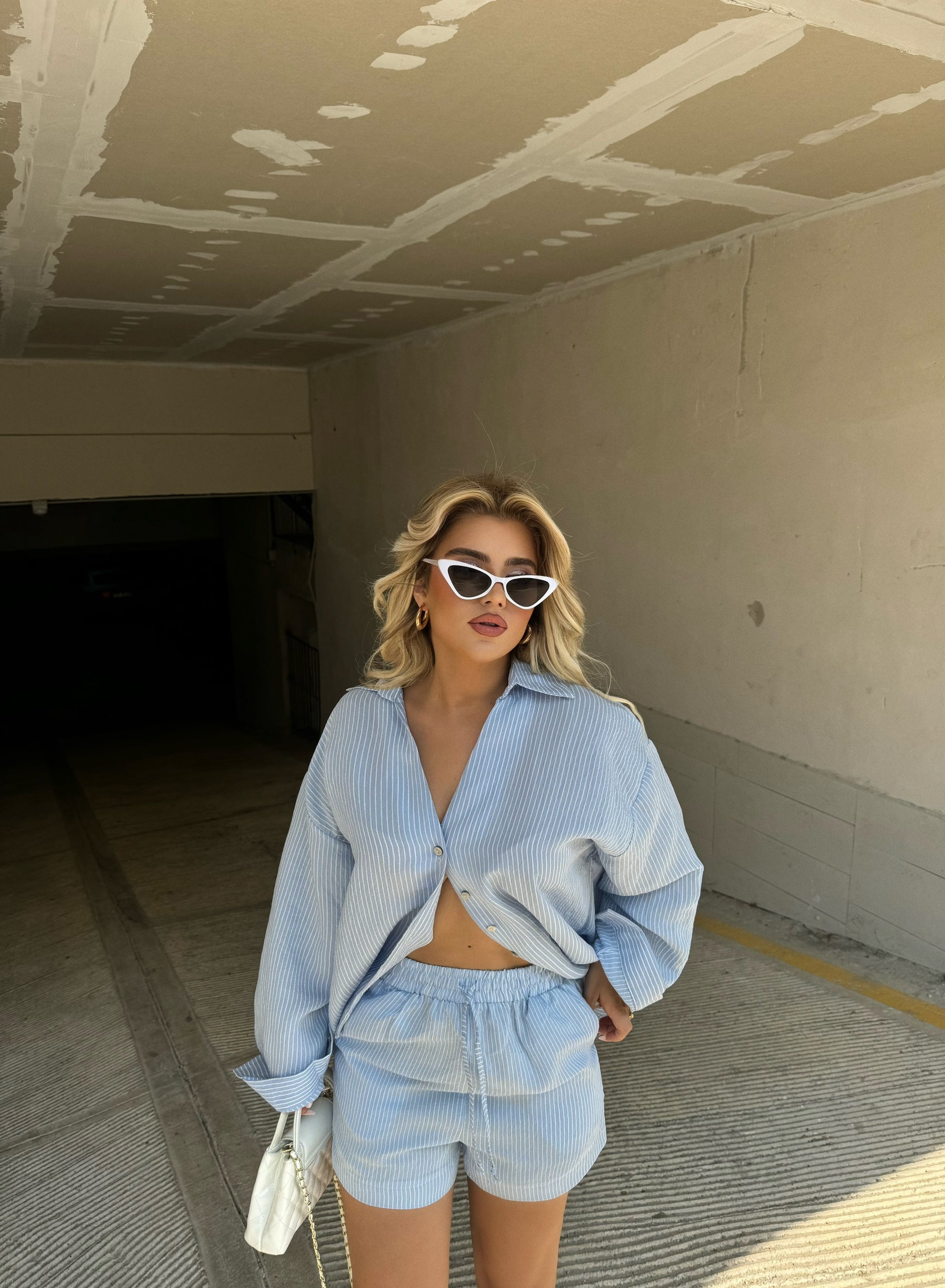 Set me dy pjese, kemishe me menge te gjata dhe pantallona te shkurtera. Pantallonat jane me llastik ne bel , pershtaten yll ne trup. Ka material te plote, shume cilesor.