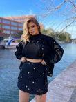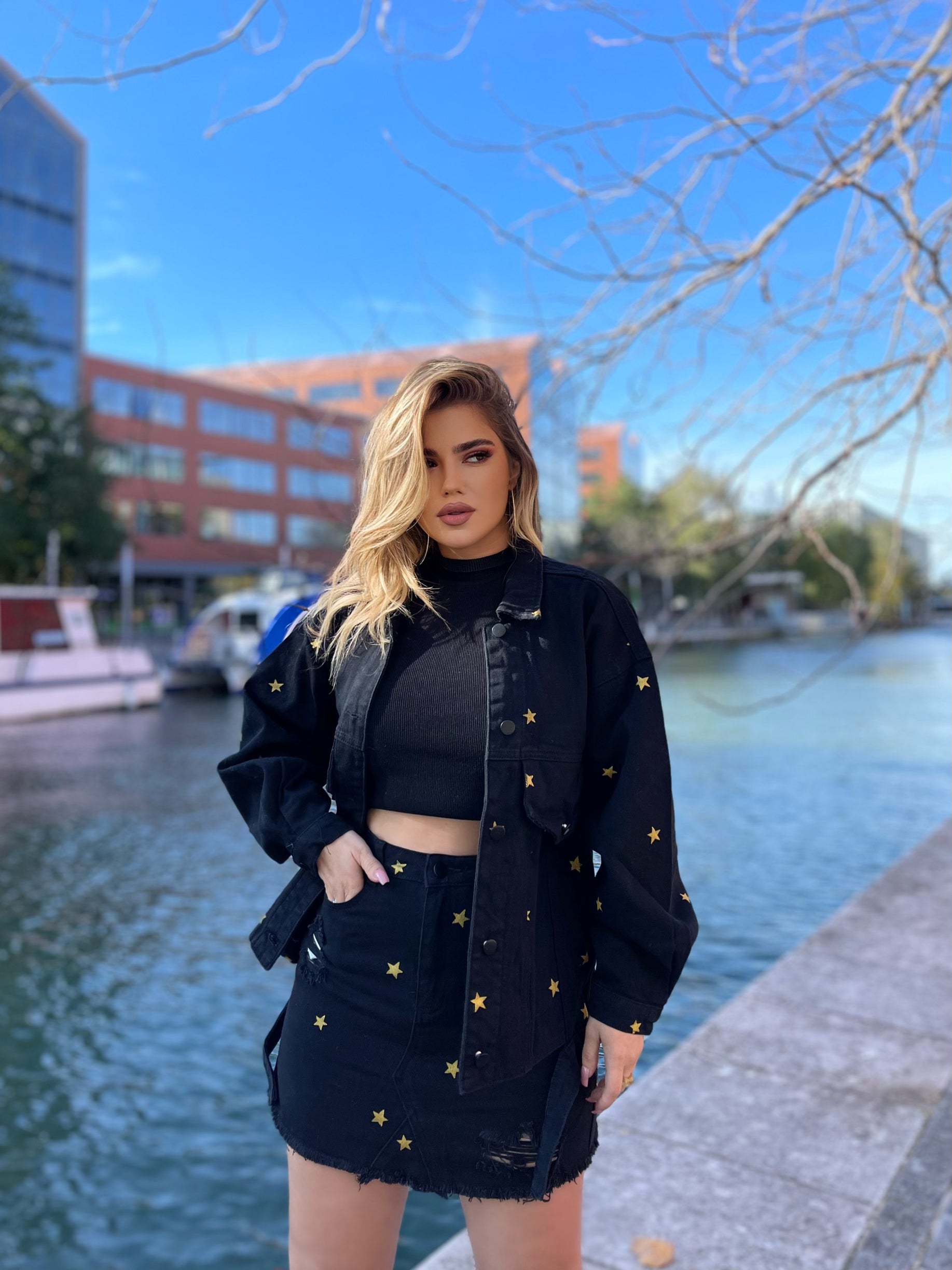 Set me yje me xhaket me fund te shkurter. Mberthimi i fundit behet me kops dhe zinxhir ne pjesen e perparme. Xhaketa eshte me jake me kapak, mberthimi behet me kopsa ne pjesen e perparme.