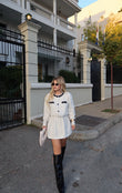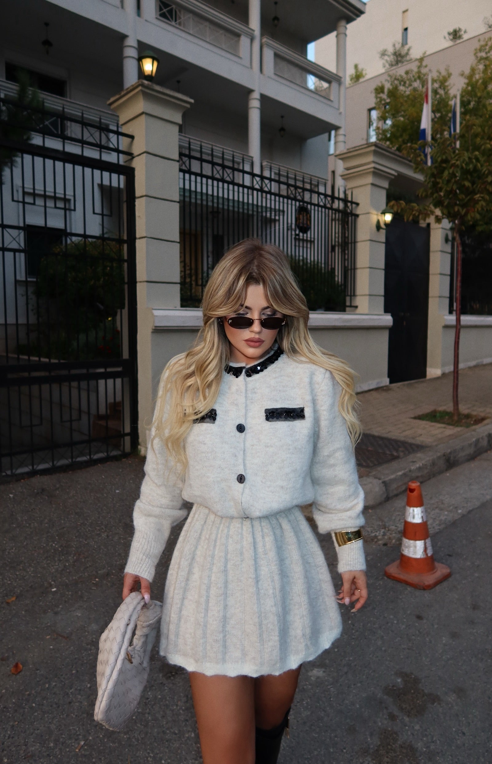 Set me dy pjese ne ngjyren gri te hapur. Seti perpehet nga fundi i shkurter dhe xhaketa me gjatesi normale me kopsa perpara.