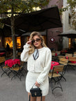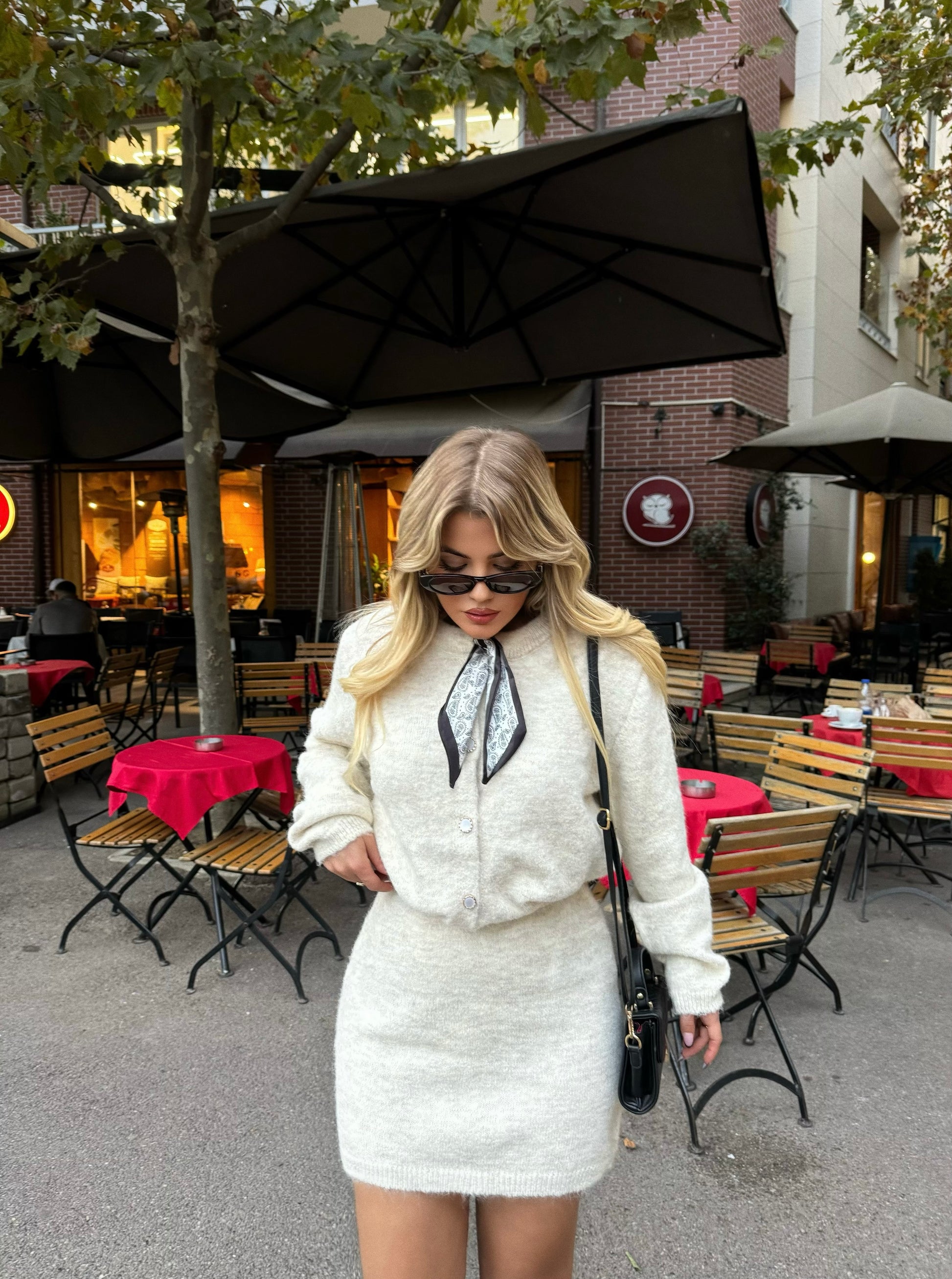 Set me dy pjese ne ngjyren bezhe. Seti perbehet nga fundi i shkurter ne ngjyren bezhe dhe pulovera me gjatesi normale me kopsa ne pjesen perpara. Material i bute dhe komode.