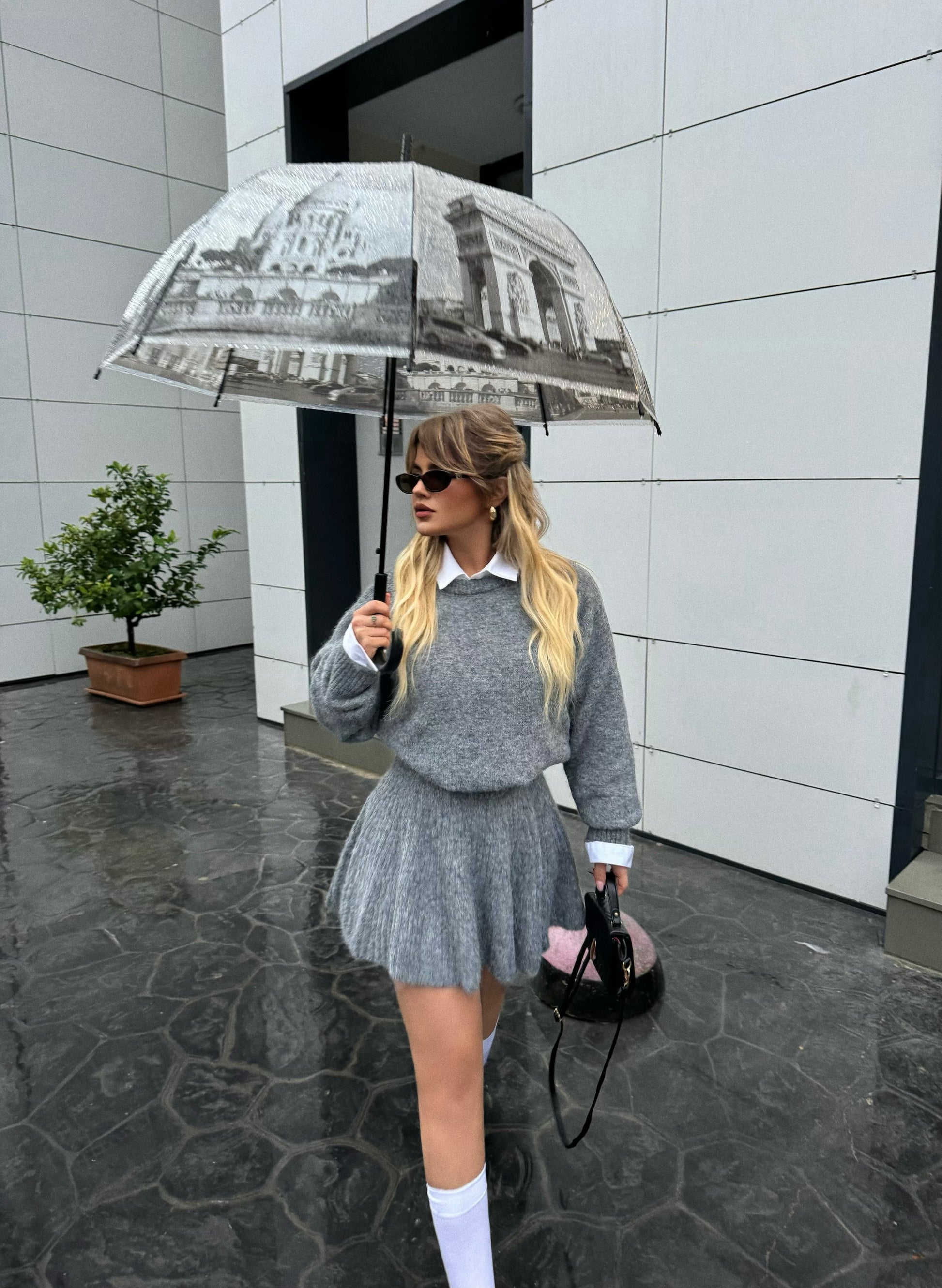 Set pulover dhe fund i shkurtër në ngjyrë gri e errët. Dizajn modern dhe komod, ideal për kombinime të stilizuara dhe të përditshme.