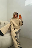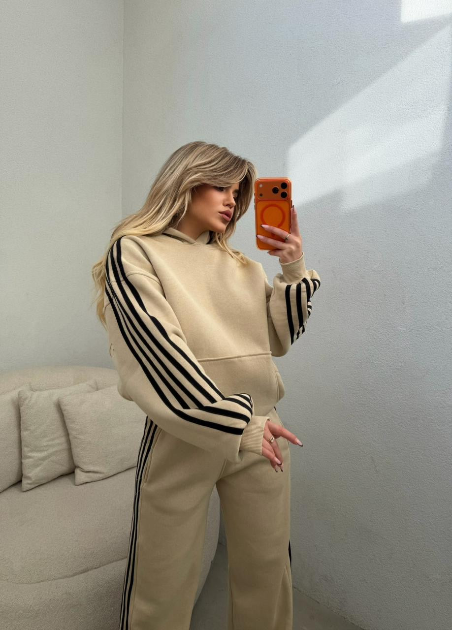 Kostum sportiv bezhë, i përbërë nga hoodie me kapuç dhe tuta me prerje të drejtë.Material i plote dhe i rehatshem. Lehtesishte i kombinueshem per perditshmerin tuaj.