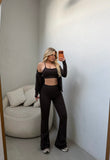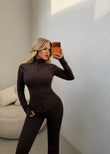 Set ne ngjyren kafe sportiv. Material i plote dhe i bute. Seti perbehet nga tre pjese: strecet stil cowboy, crop top dhe bluza me zinxhire pas trupit.