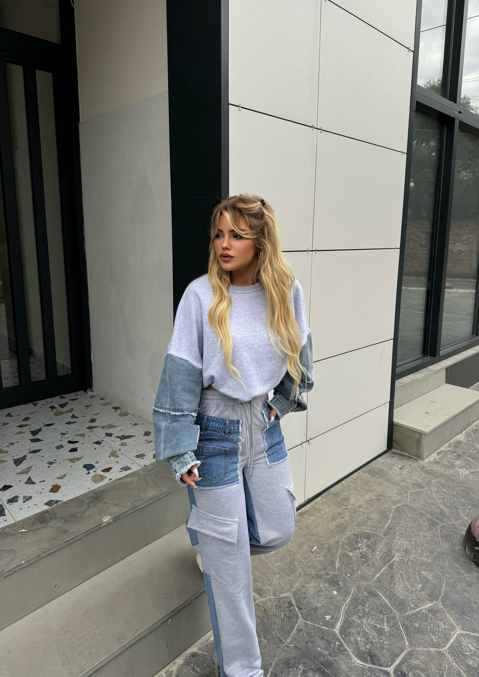 Set sportiv modern gri me detaje xhinsi, i rehatshëm dhe praktik për përditshmëri.