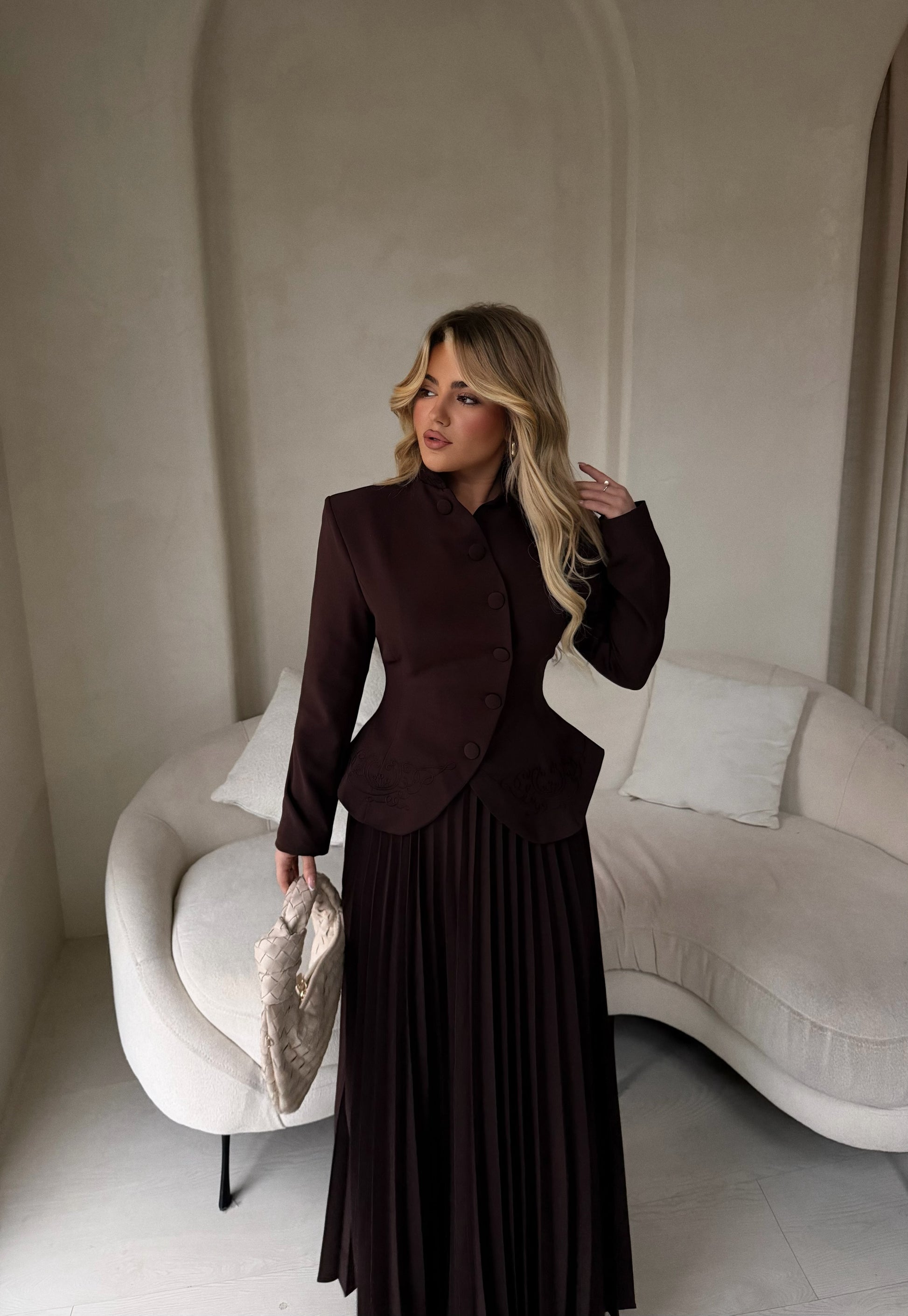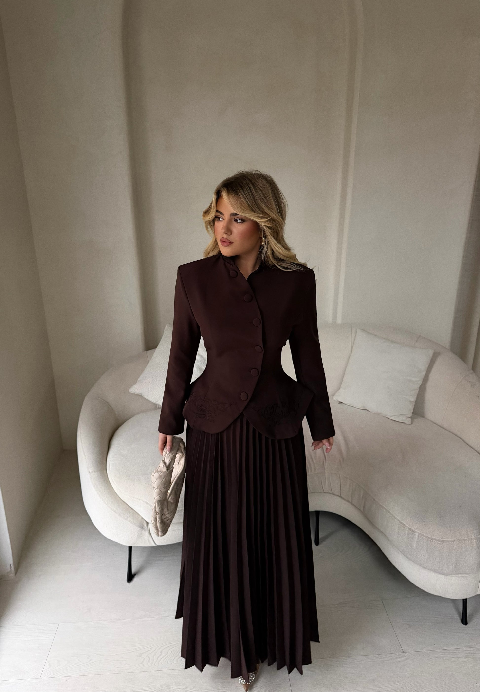 Set xhaketë dhe fund me pala të gjata në ngjyrë kafe, shumë i rehatshëm dhe elegant në të njëjtën kohë. Xhaketa rri bukur në trup, ndërsa fundi me pala lëviz lehtë dhe i jep një pamje të butë e femërore. I përshtatshëm për përditshmëri ose raste më speciale.