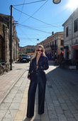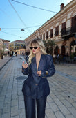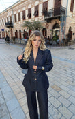 Set xhins ne ngjyren blu te erret. Seti perbehet nga dy pjese xhaketa klasike me rrip ne bel dhe pantallonat prerje e drejte.