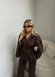 Set ne ngjyren kafe. Seti perbehet nga dy pjese xhinset ne ngjyren kafe dhe xhaketa e cial eshte e shoqeruar me rripin ne bel per te theksuar me shume silueten. Ideal per raste te vecanta dhe per ne perditshmerin.