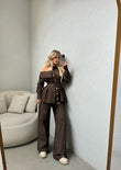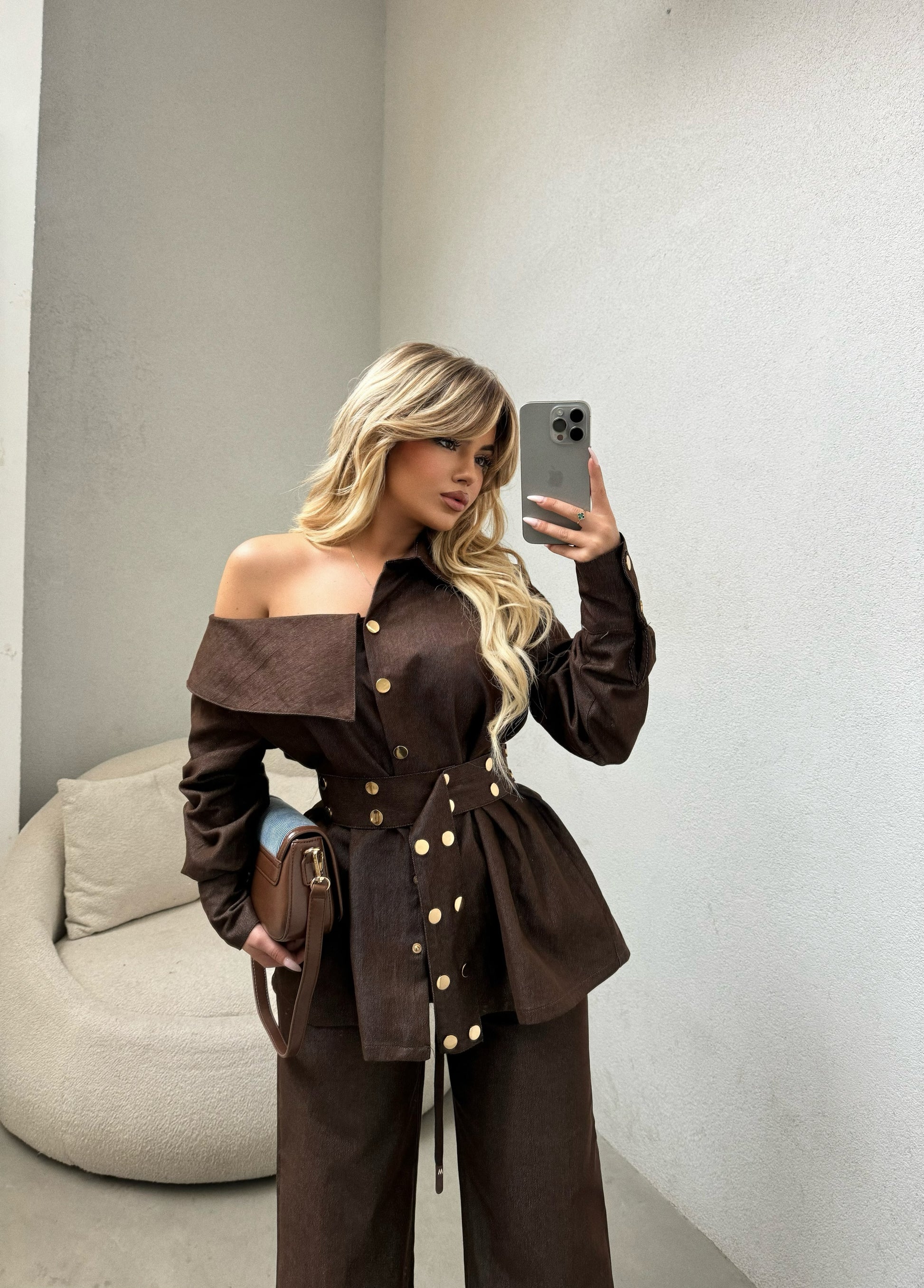 Set xhins kemishe me nje menge dhe pantallona te gjera. Pantallonat jane me llastik dhe lidhese ne bel. Mbyllet me kopsa gold perpara.