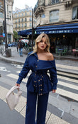 Ser xhins kemishe me nje menge dhe pantallona te gjera. Pantallonat jane me llastik dhe lidhese ne bel. Mbyllet me kopsa gold perpara.