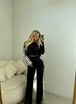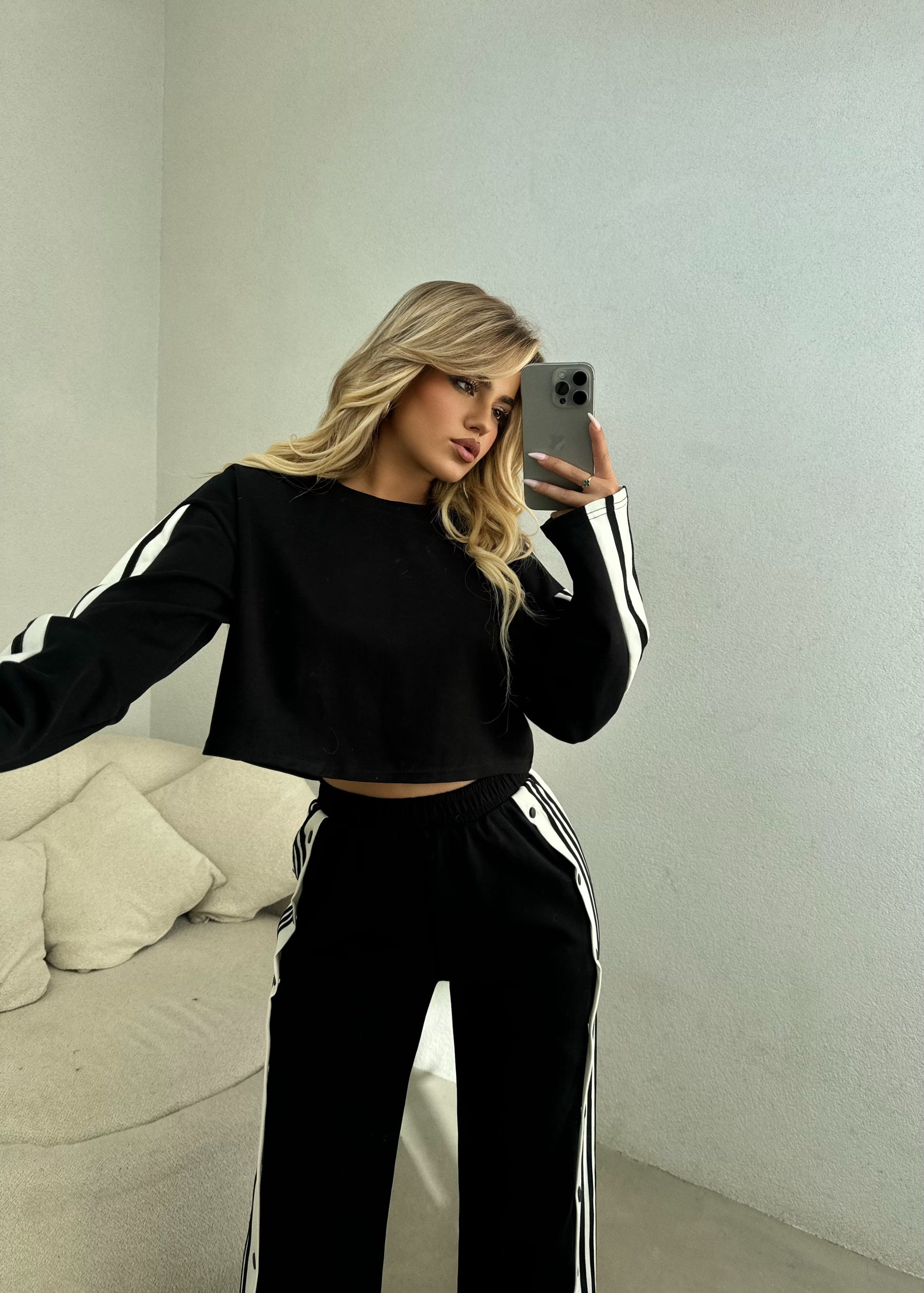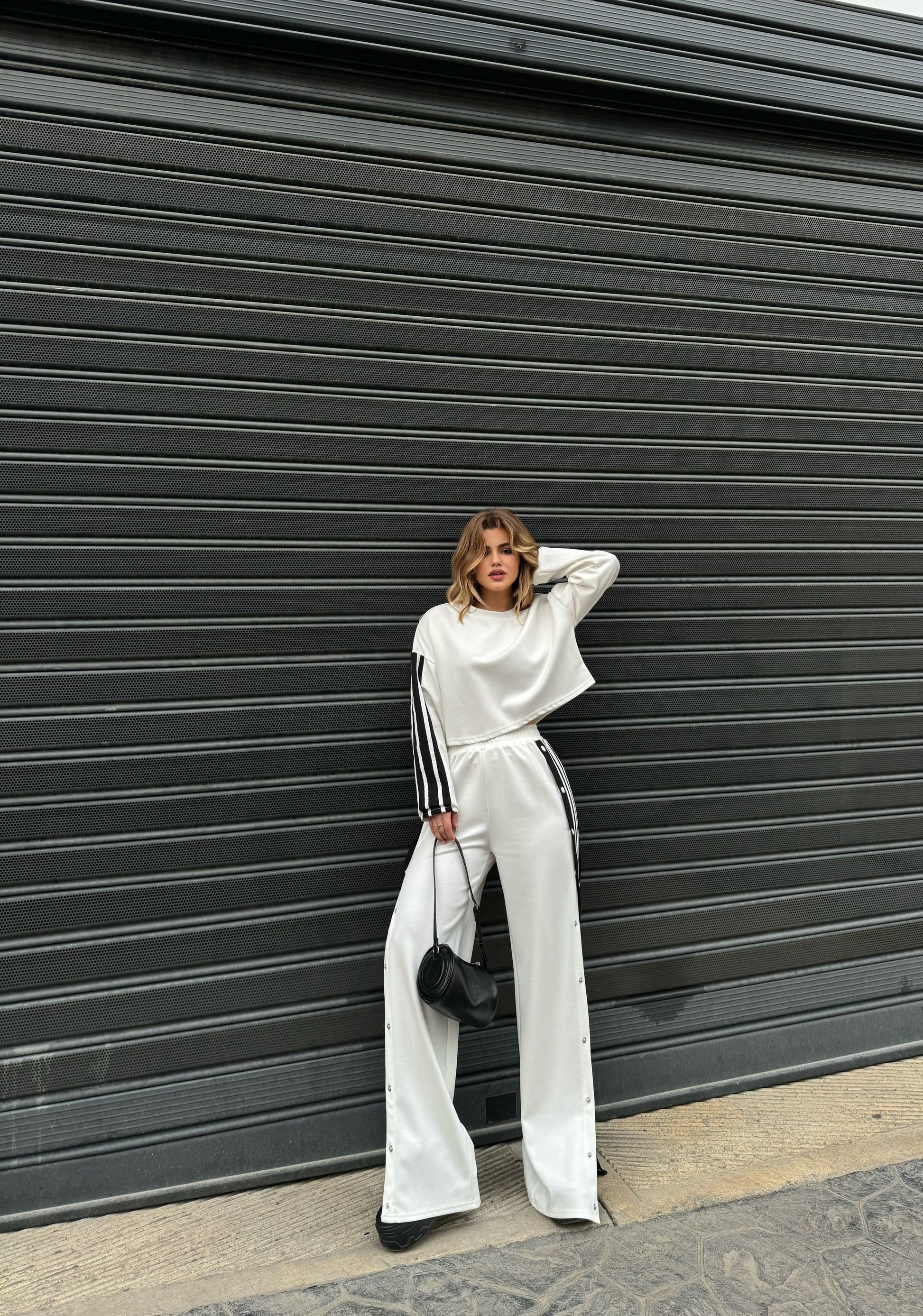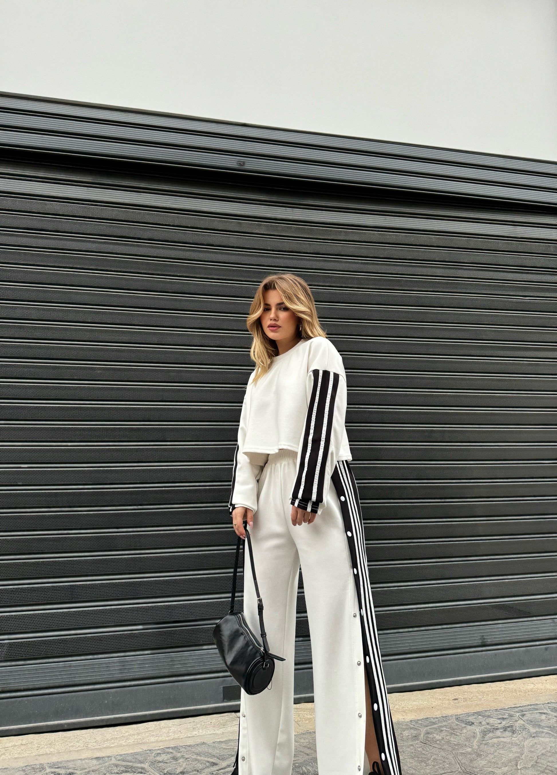 Kostum sportiv bluze dhe pantallona me kopsa anash.Bluza dhe pantallonat kane viza anash.Pantallonat vijn prerje e drejte dhe bluza eshte e shkurter.Seti ka material te plote dhe shume te mire.