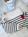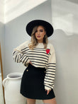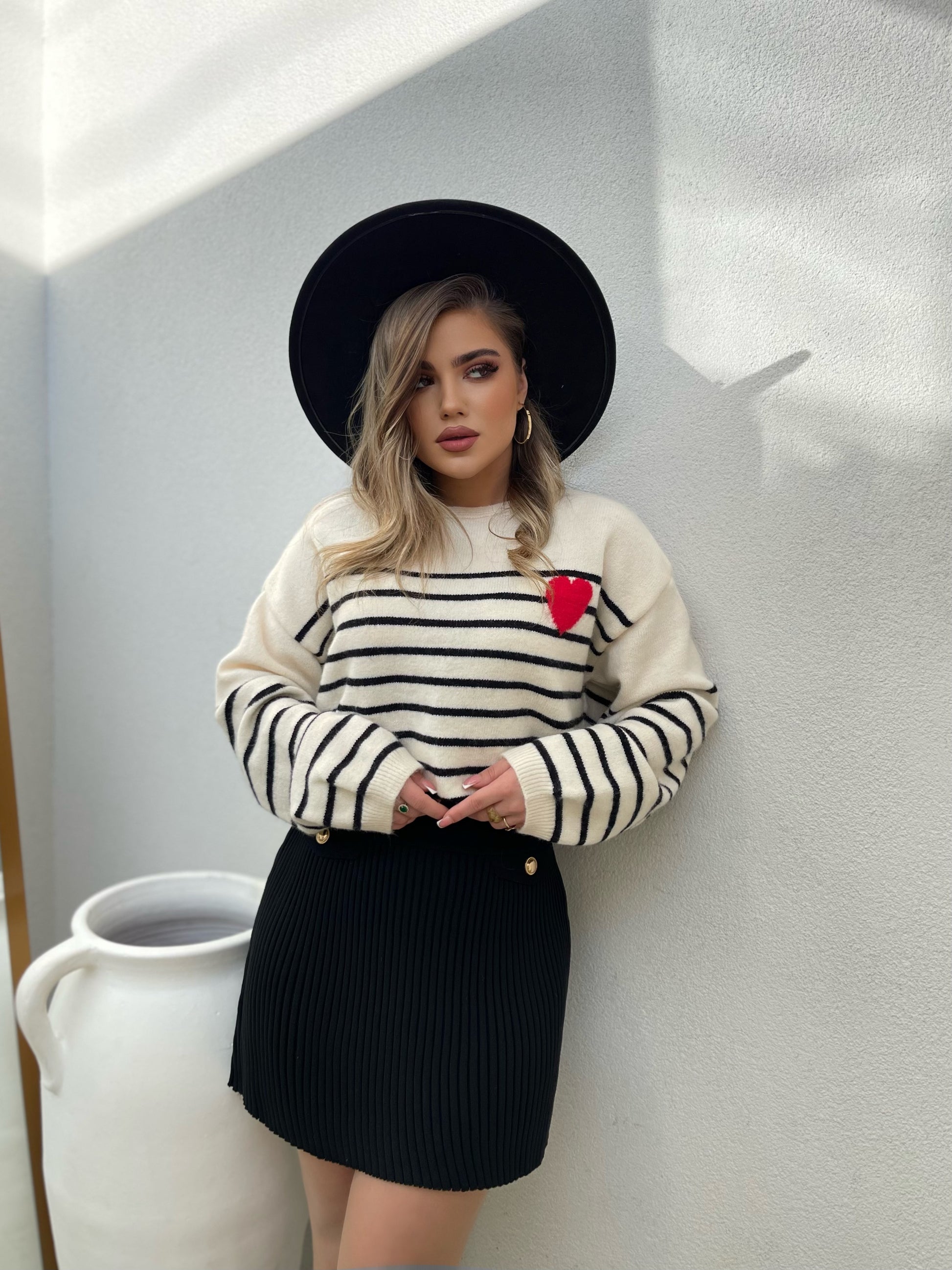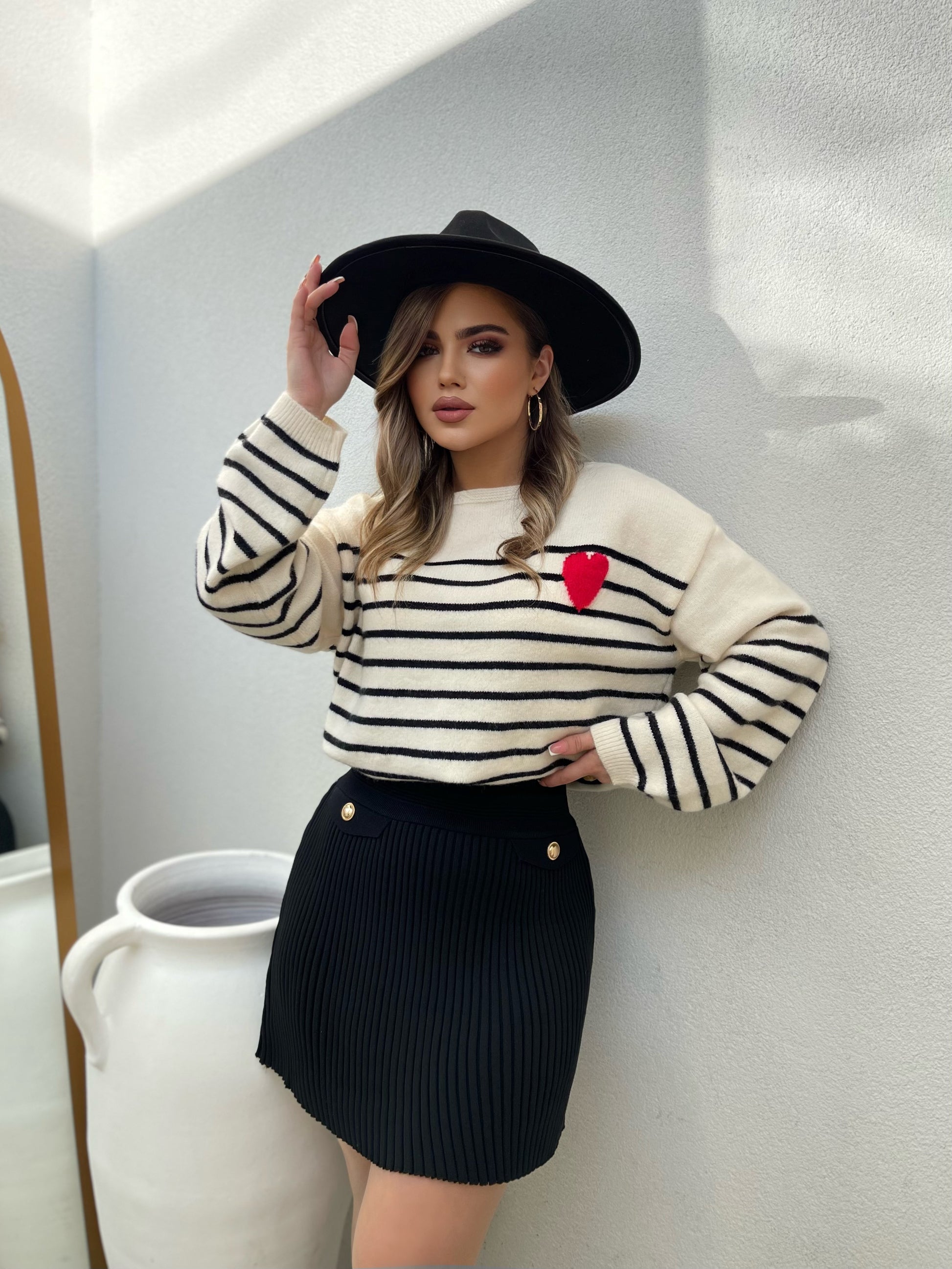 Pulover me jake te gjere me menge te gjata me doreza ne fund te mengeve. Pulovra eshte me dizenjo me viza me zemra ne pjesen e perparme. Pulovra ka gjatesi normale dhe eshte e kombinueshme.