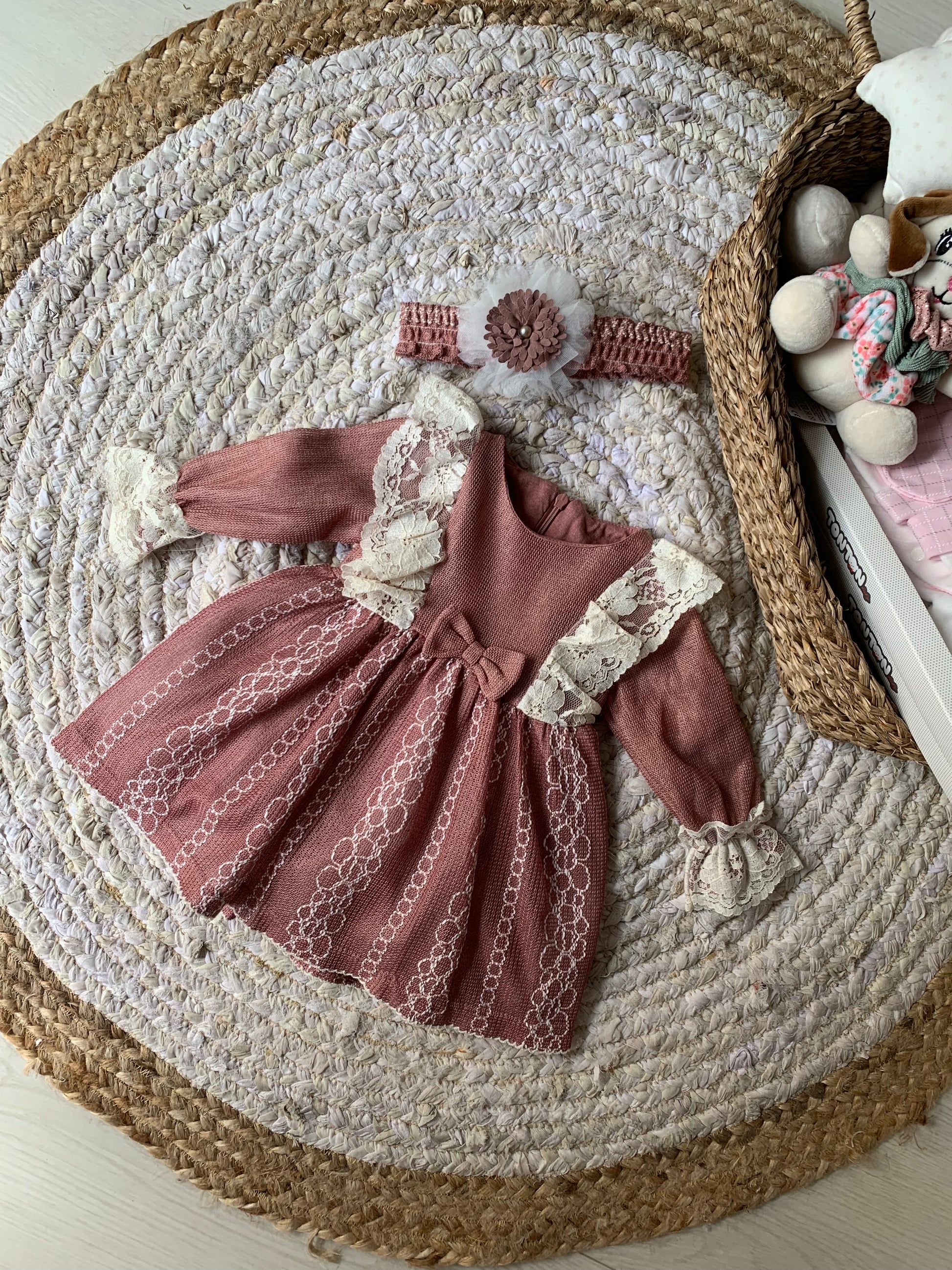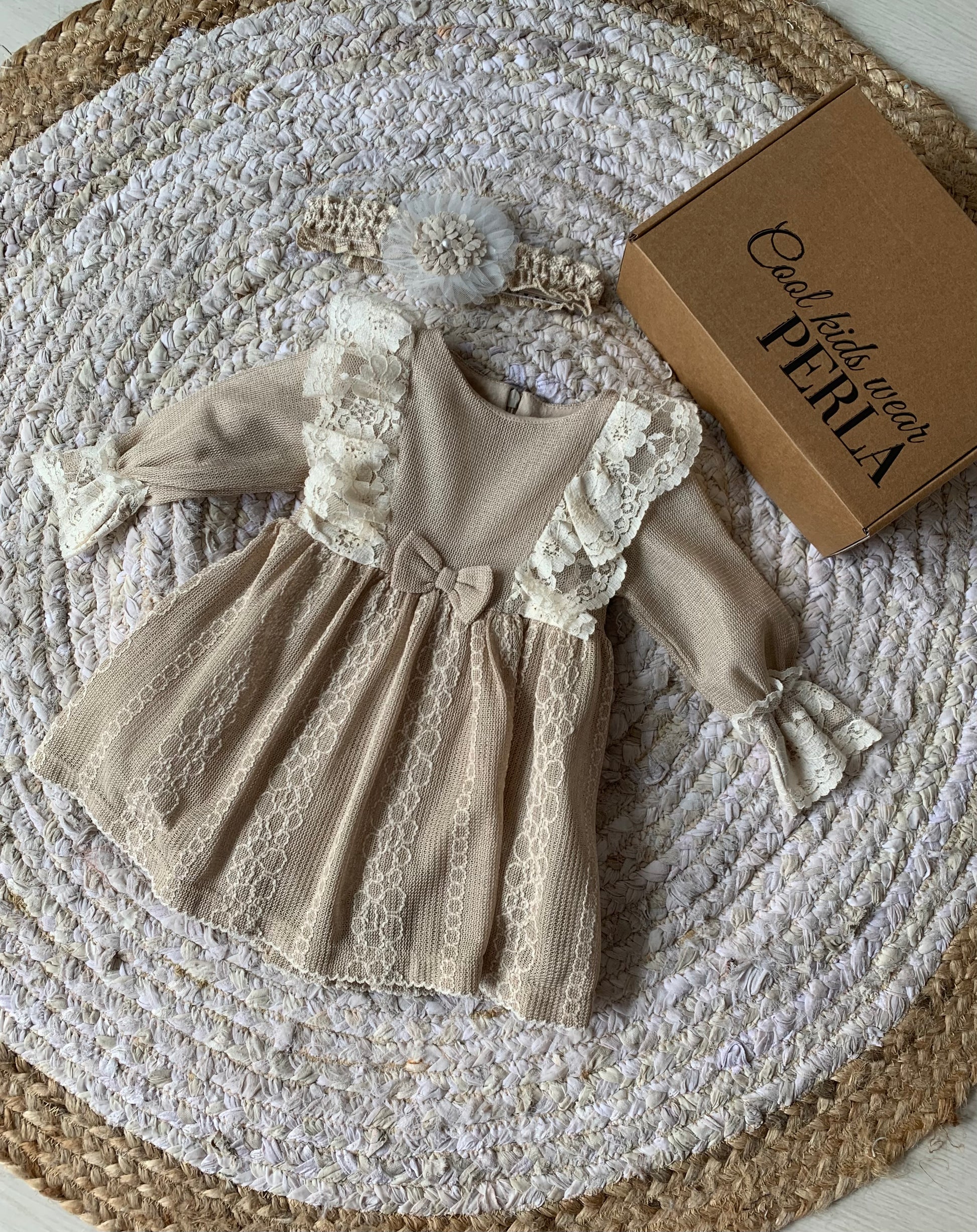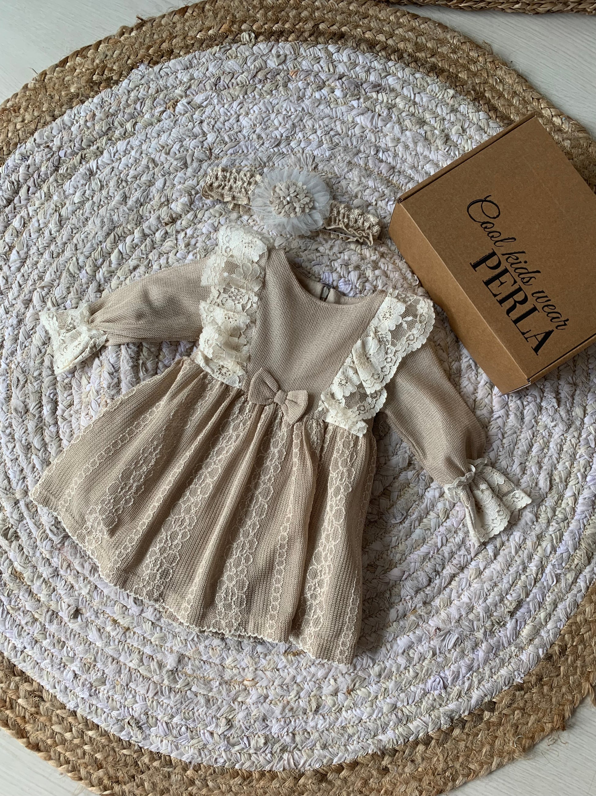 Fustan me krahe te gjate dhe me fjongo para.Shoqerohet me kordele.Fustani vjen ne ngjyre bezhe dhe lejla.Fustani ka material pambuk dhe cilesi fantastike.
