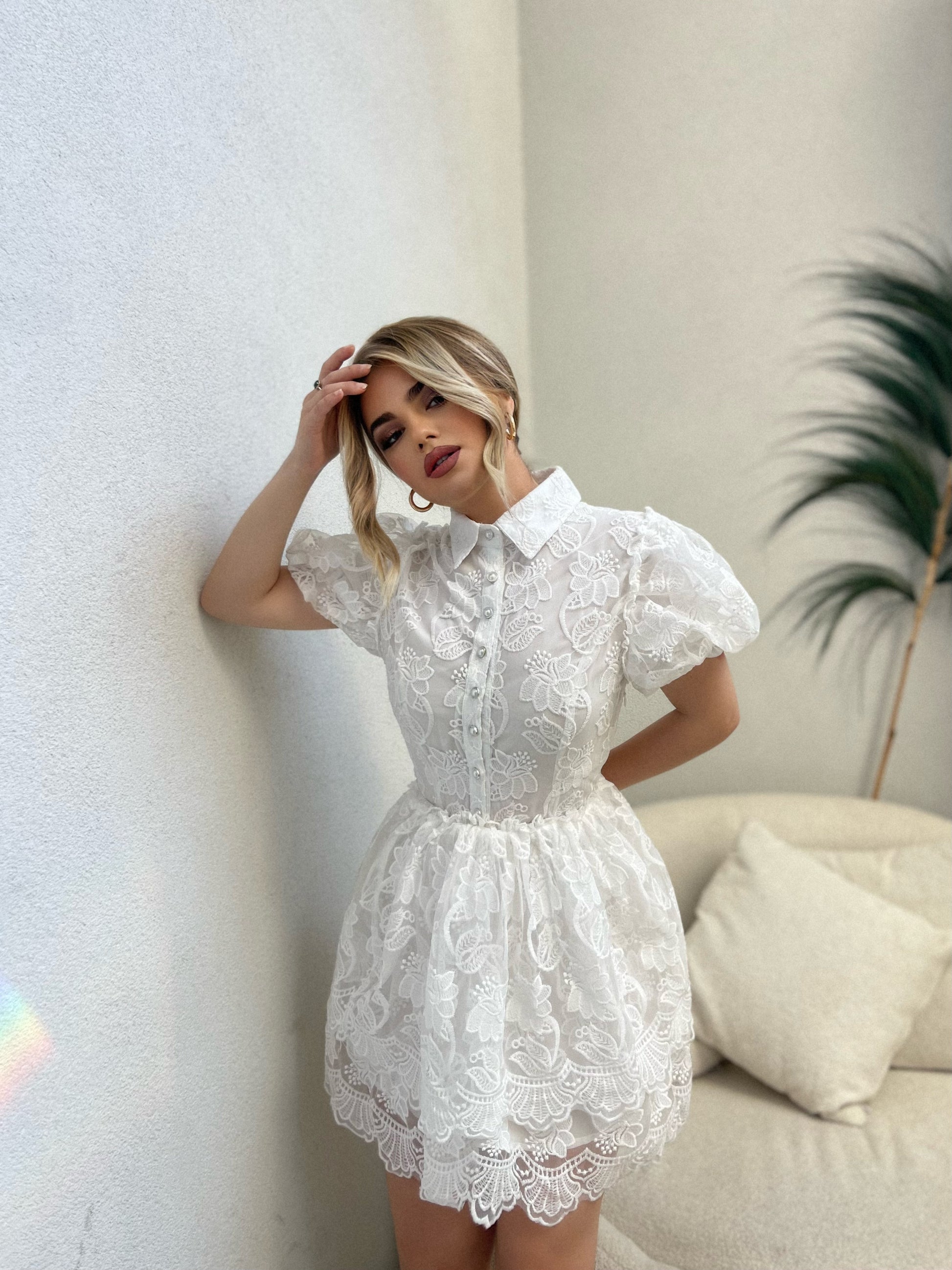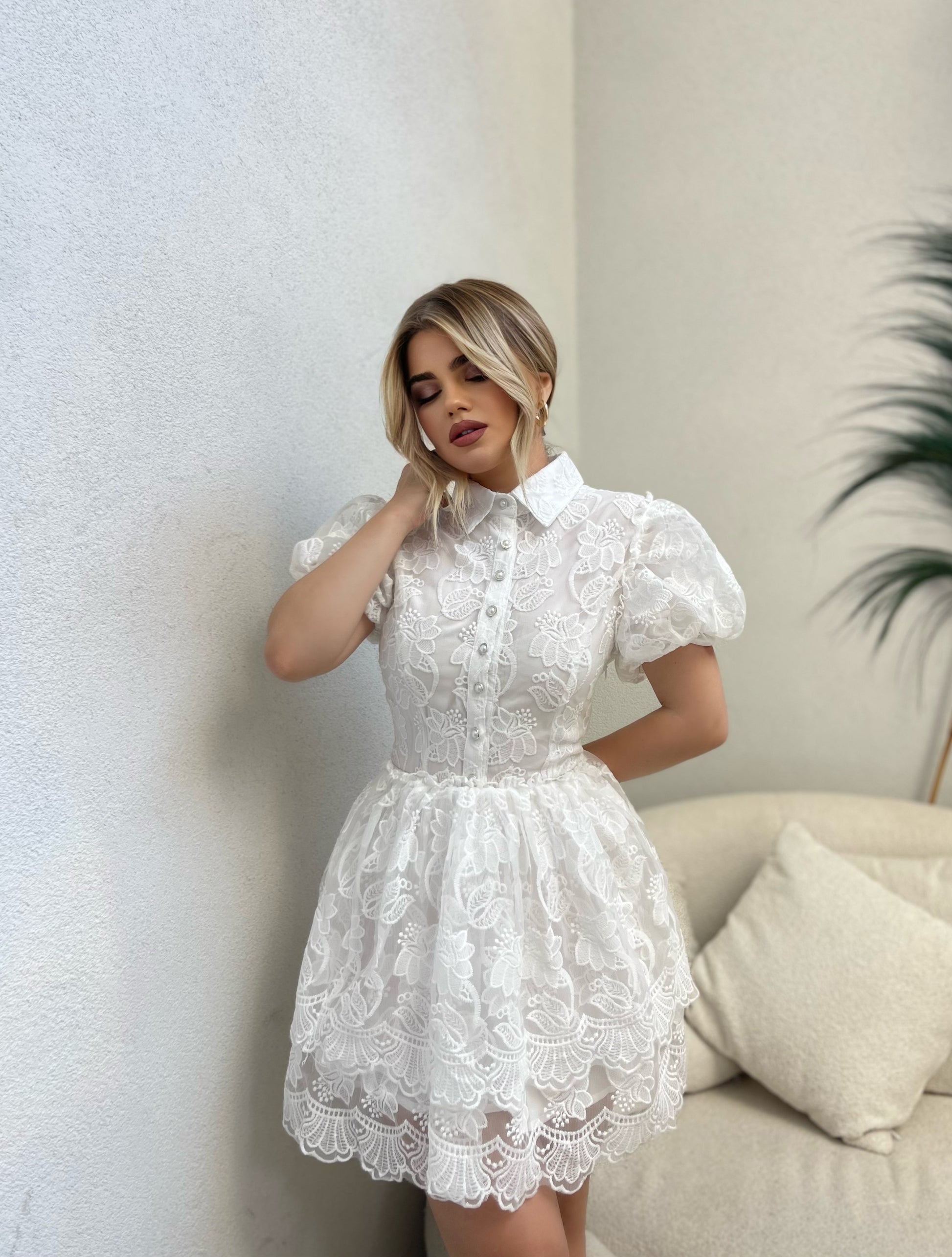 Fustan i shkurter me dantelle dhe kopsa para. Vjen me menge te fryre dhe jake ne forme V-je. Ka material te plote dhe cilesi fantastike.
