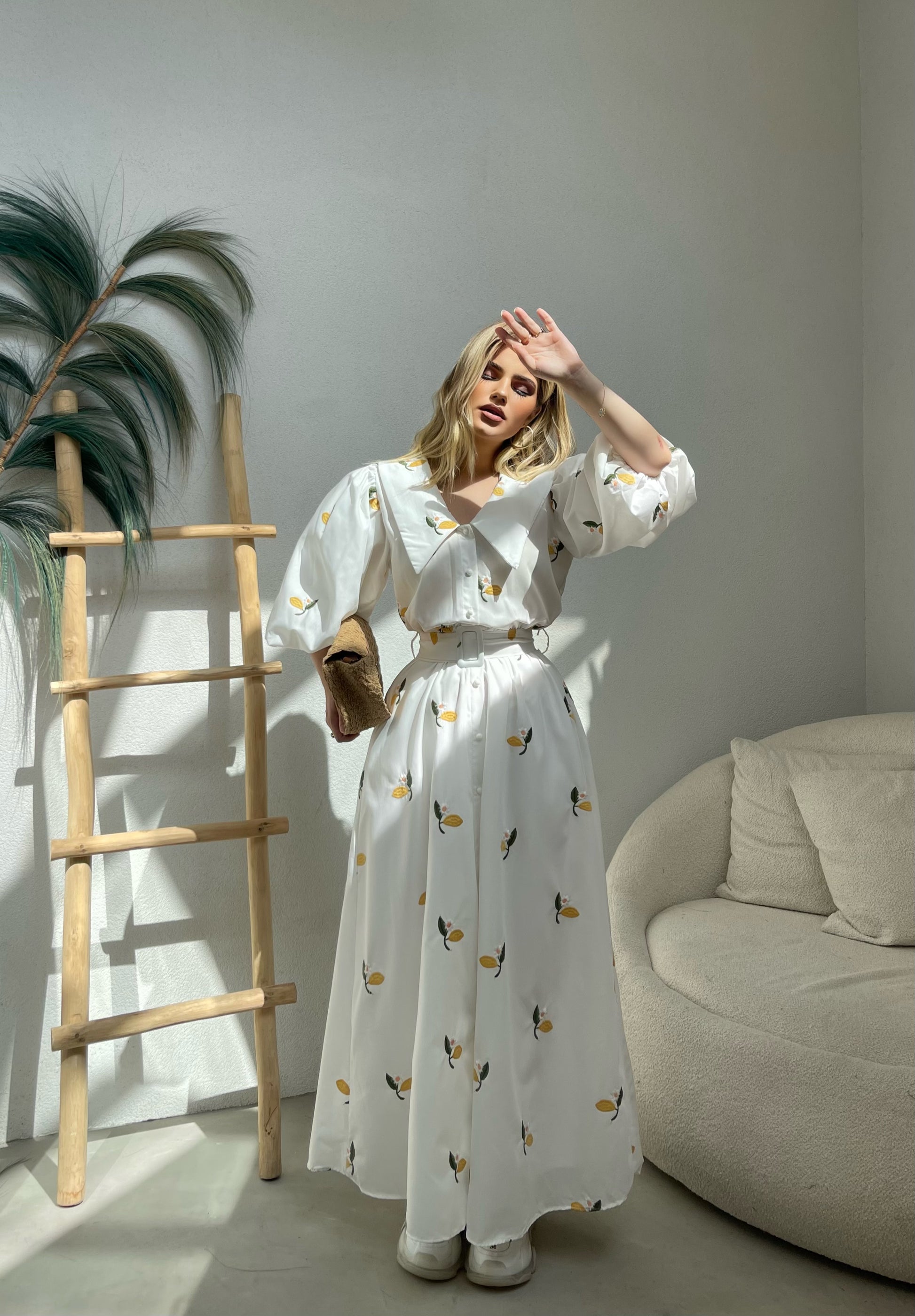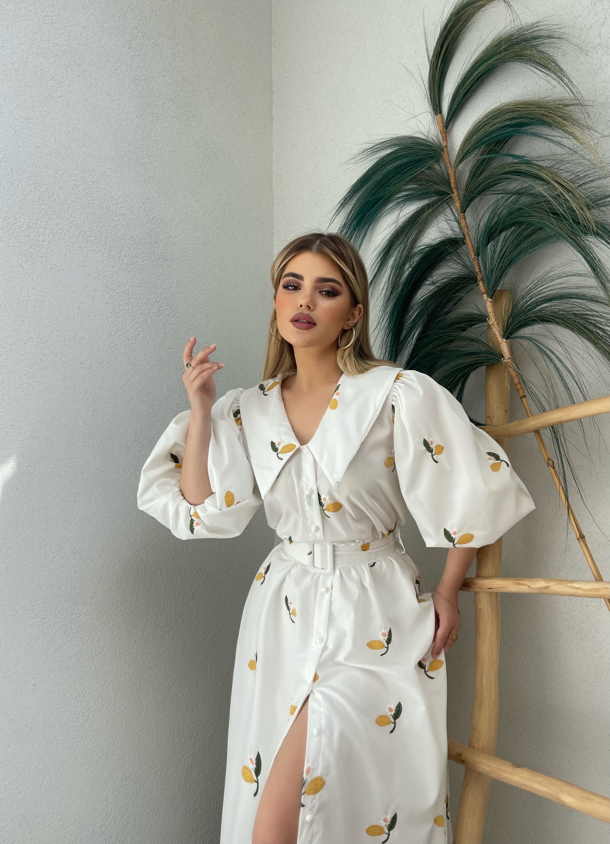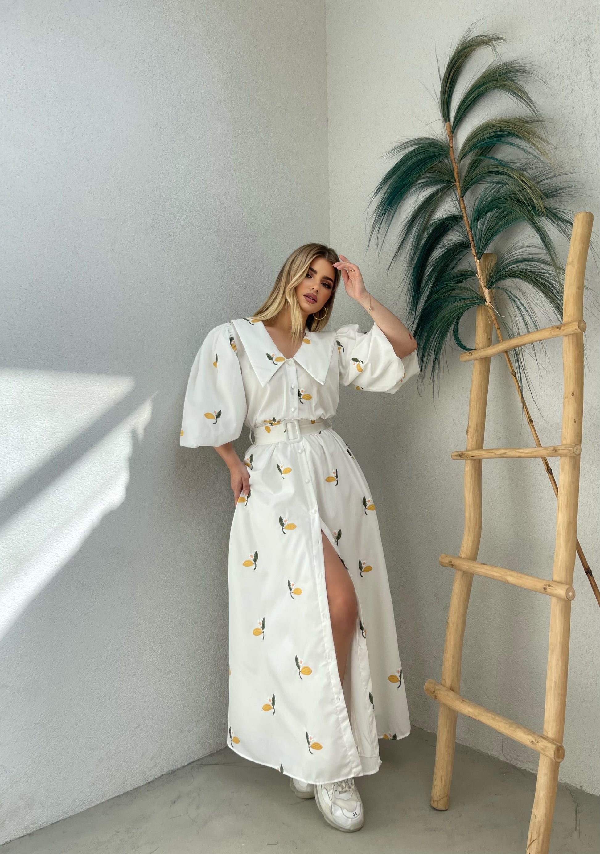 Fustan i bardhe me menge te fryra. Me lule te qendisura, me llastik dhe me rrip ne bel. Material i plote dhe i fresket, me astar. Gjatesi perfekte.