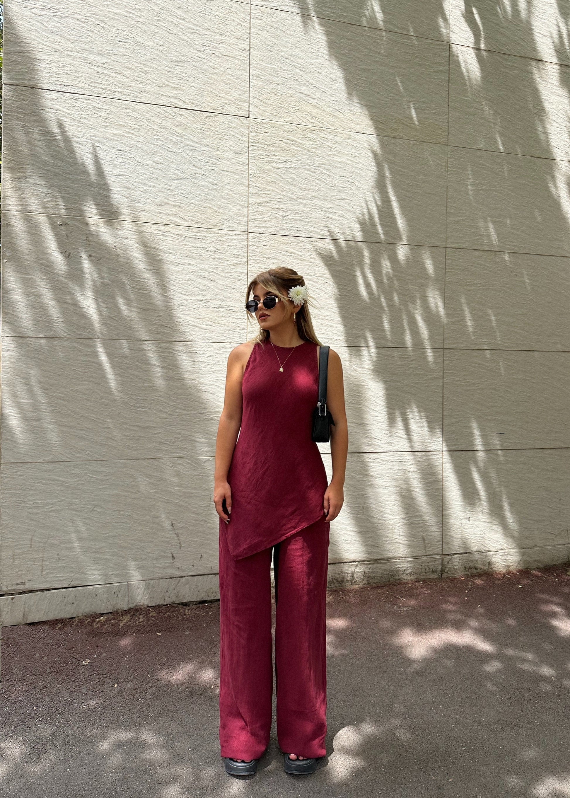 Pantallona te gjera, material lino. Vjen me llastik ne pjesen e belit. Jane me tegel ne pjesen e pantallonave.