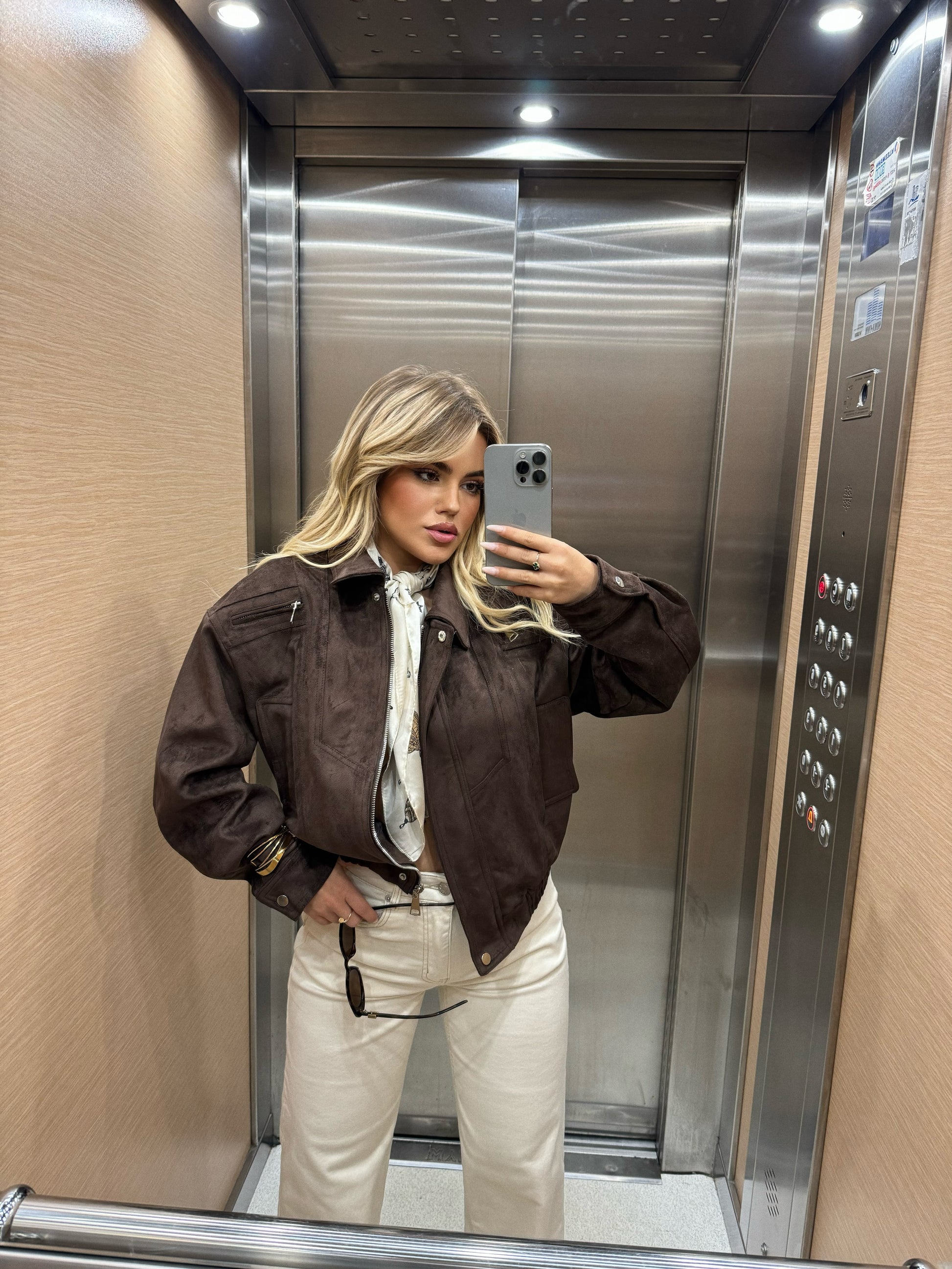 Xhaket e shkurter ne ngjyren kafe, material eshte kamosh vjen me xhepa ne pjesen perpara lehtesishte e kombinueshme.