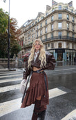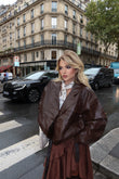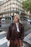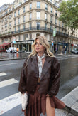 Xhakete e shkurter lekure, ngjyre kafe e erret, me prerje oversize dhe menge te gjera. Model modern dhe nje stil trendy.