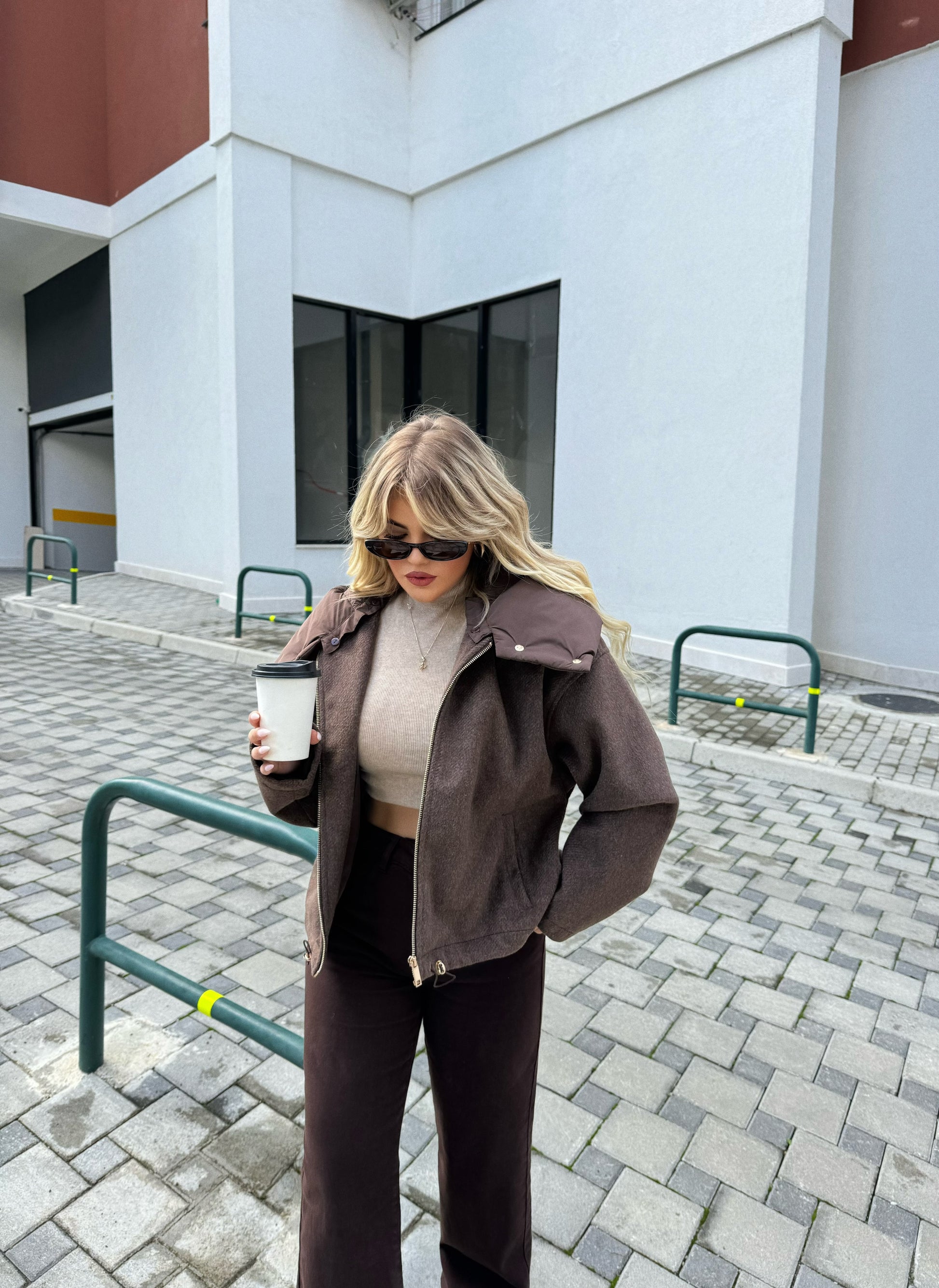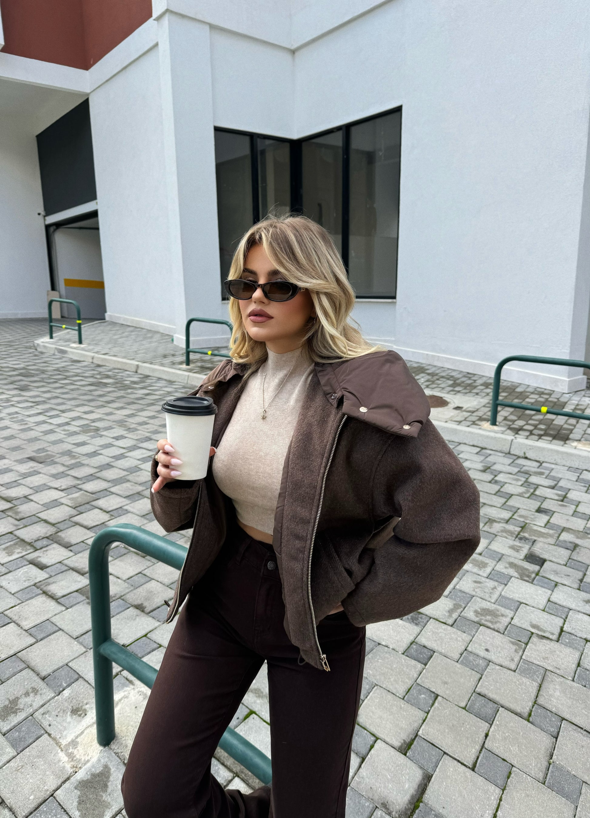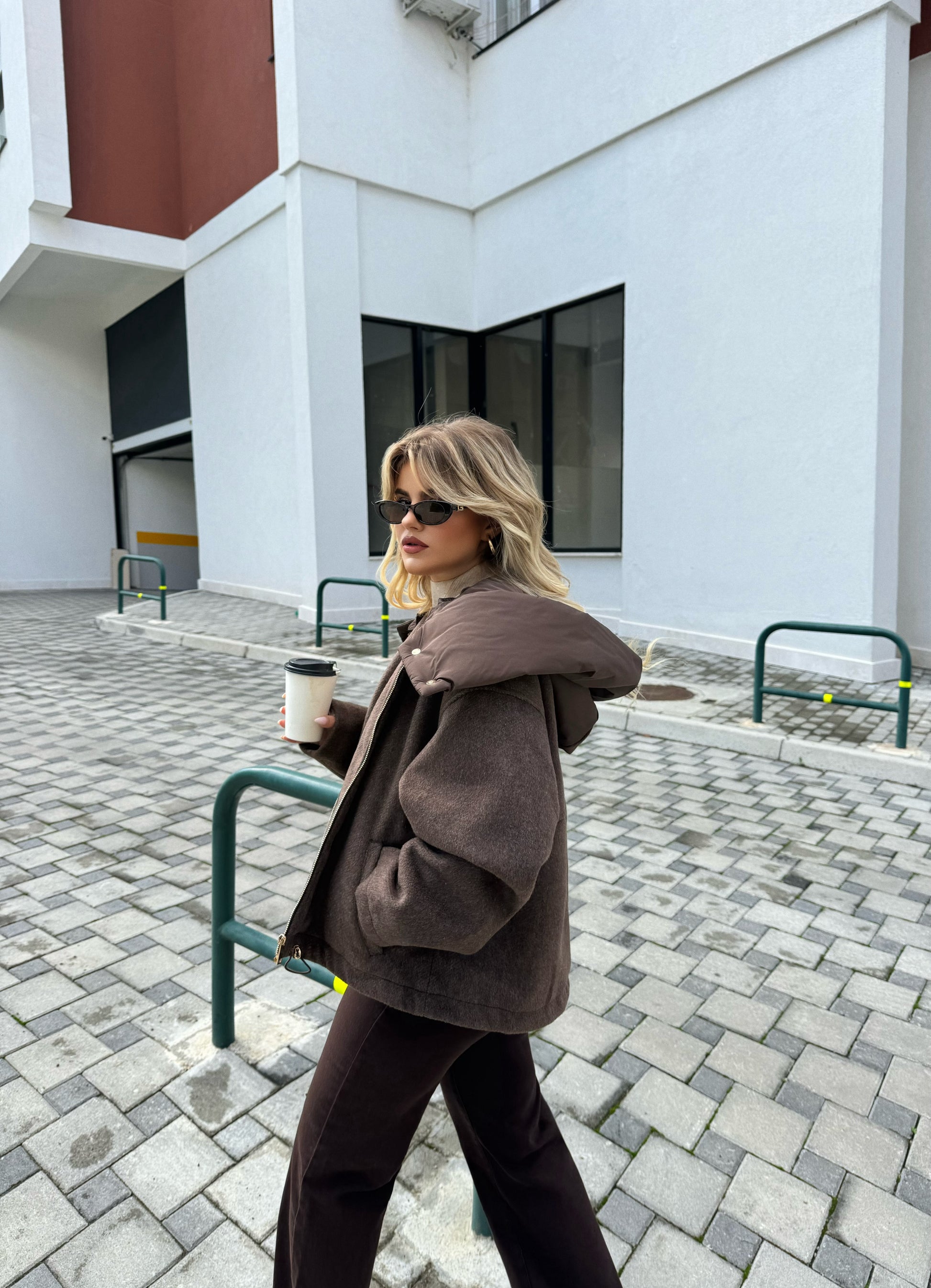 Xhup ngjyre kafe. Eshte me astar. Me kapuc i cili mund te hiqet me ane te kopsave. Xhupi eshte me zinxhir perpara. Ka material te trashe dhe lidhese ne fund per ngushtim.