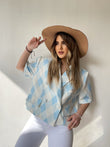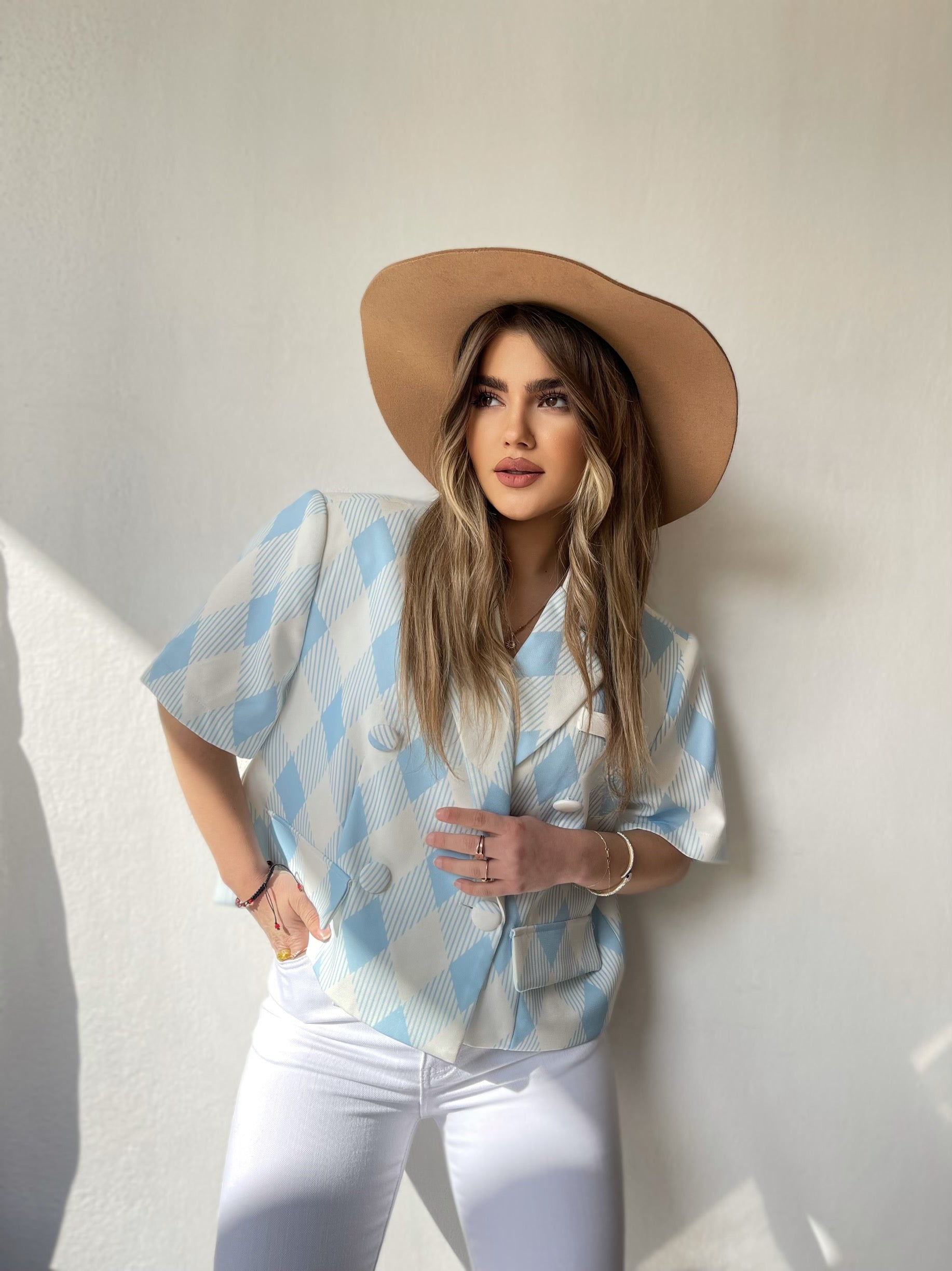 Xhekete e bardhe e shkurter me vija bojqielli.Perpara ka jake dhe mbyllet me kopsa.Material i plote dhe i fresket.