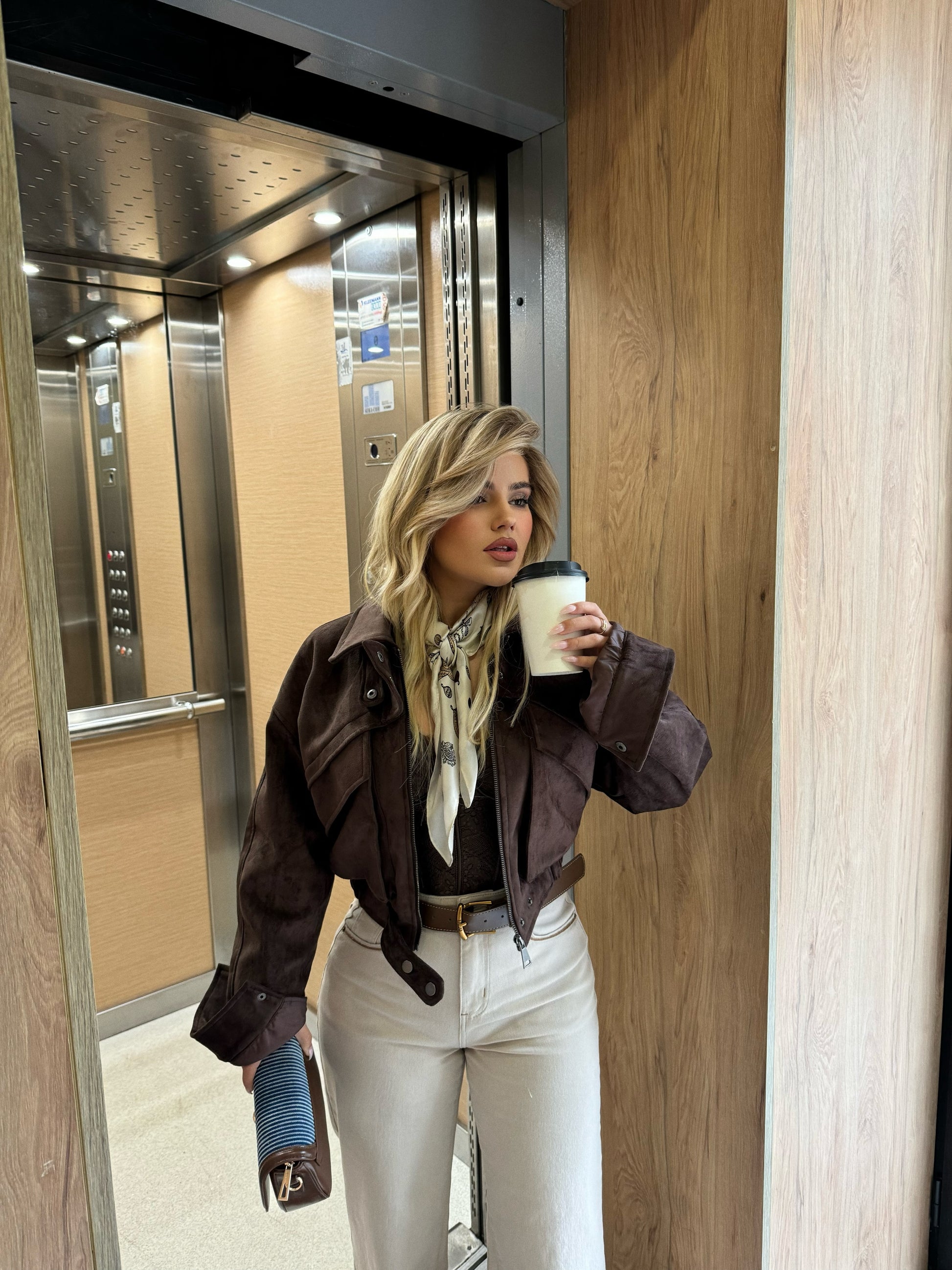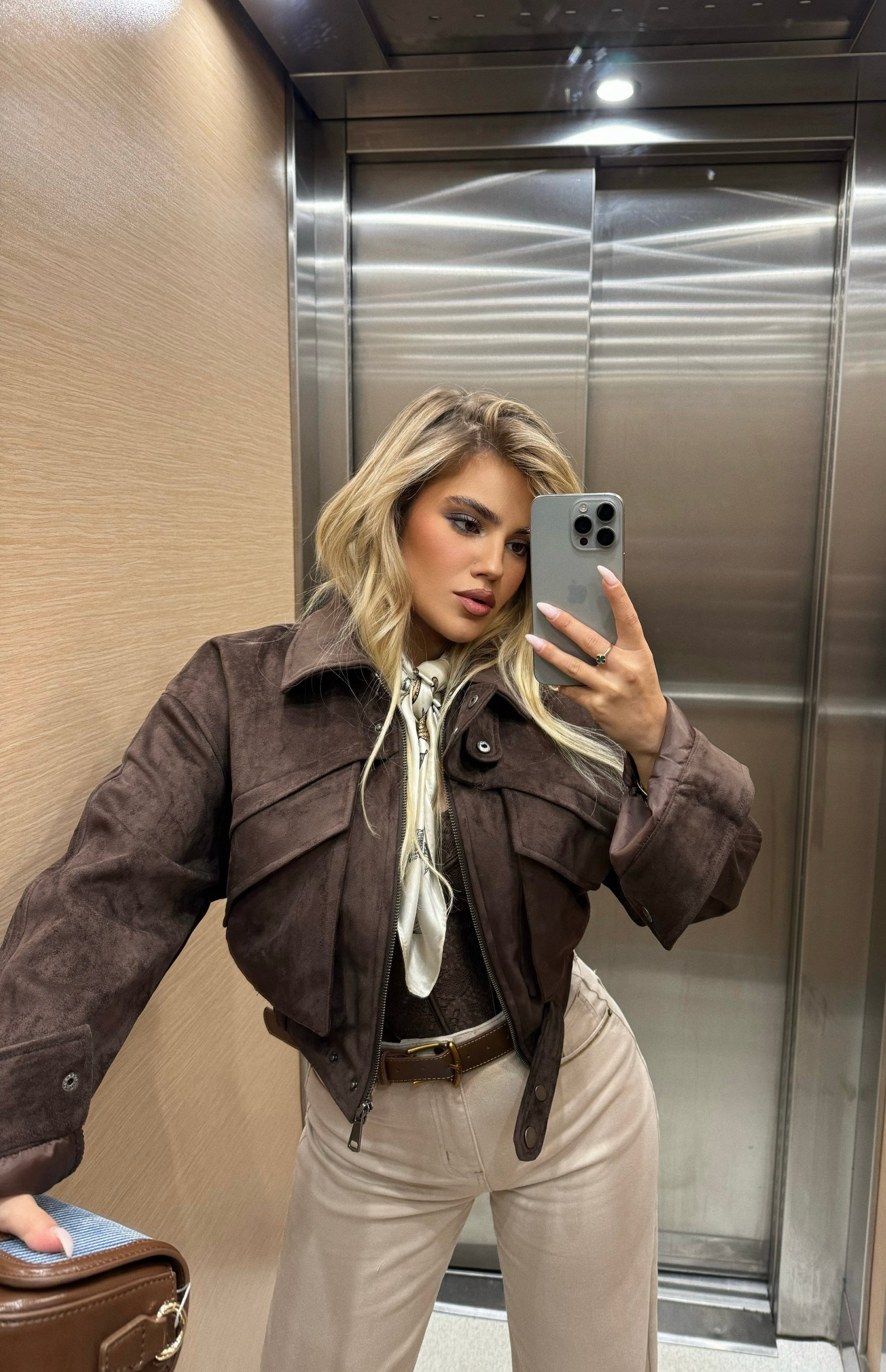 Xhakete e shkurter ne ngjyren kafe. Vjen ne material te plote kamoshi. Teper komode dhe lehtesisht e kombinueshme.