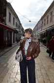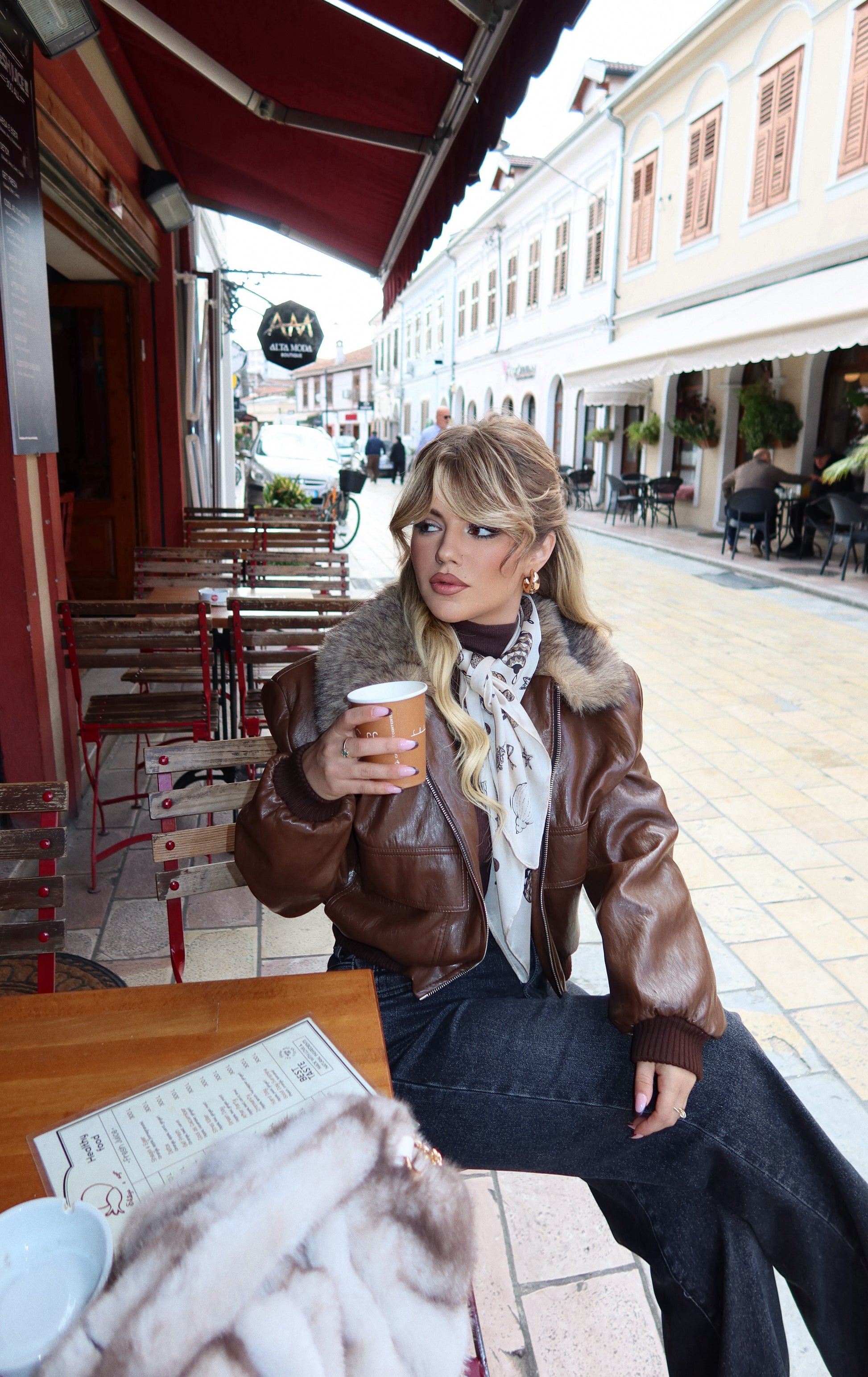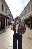 Xhakete lekure. Xhakete ngjyre kafe prej lekure te cilesise premium, rezistente dhe e bute. Prerje e shkurter me xhepa, llastike te zeze ne menge dhe pellush ne jake.