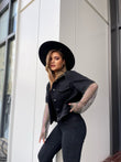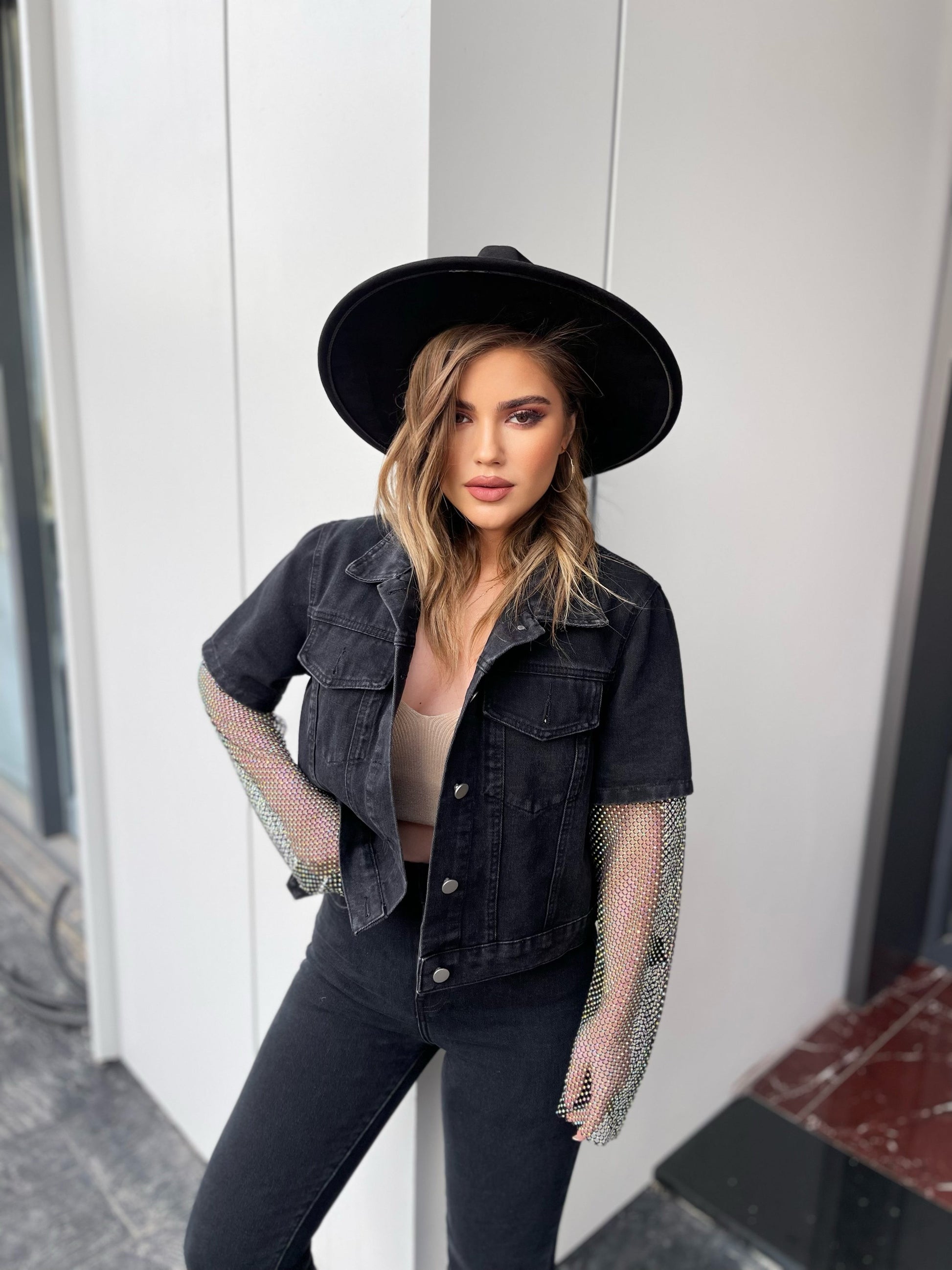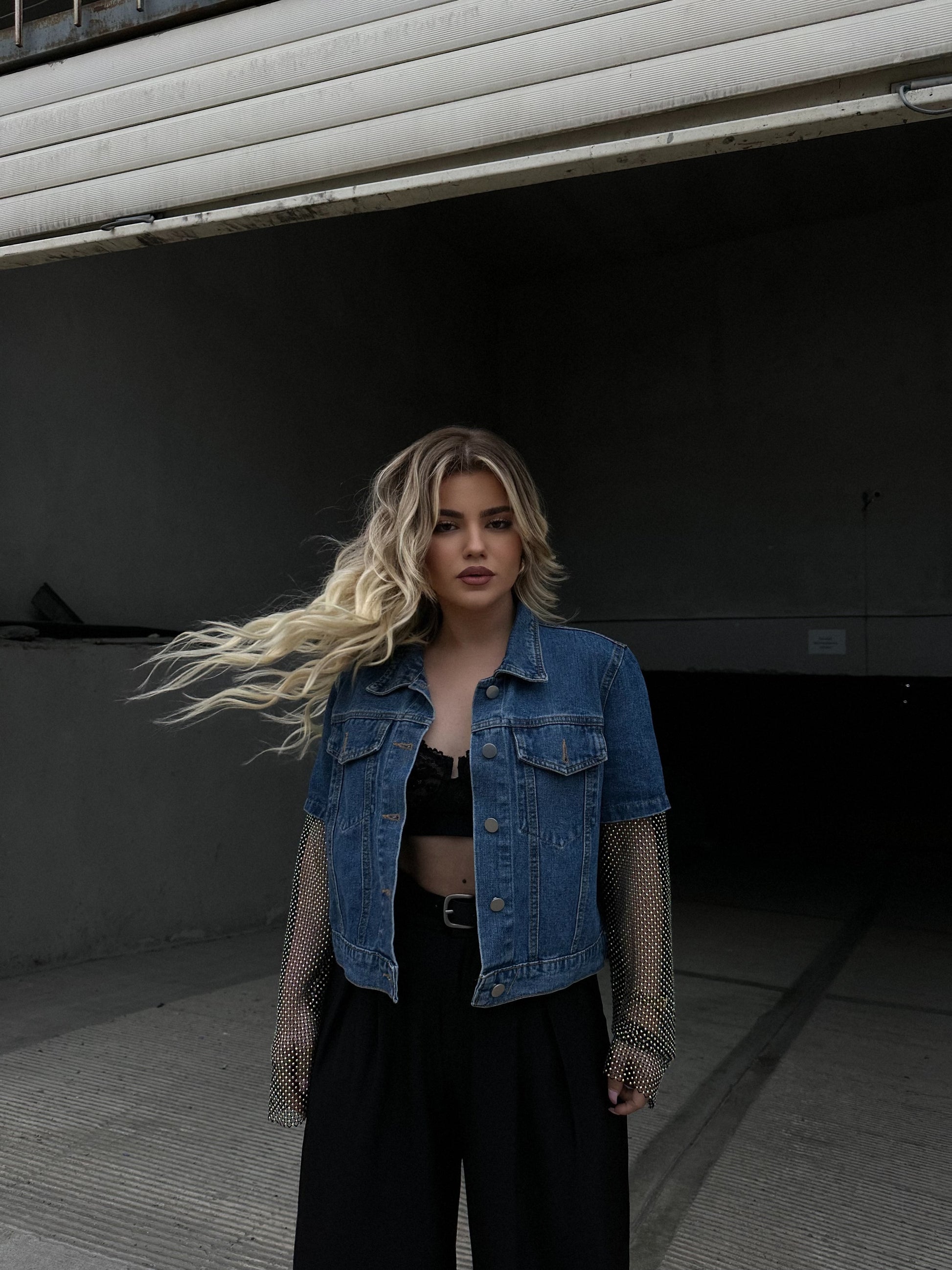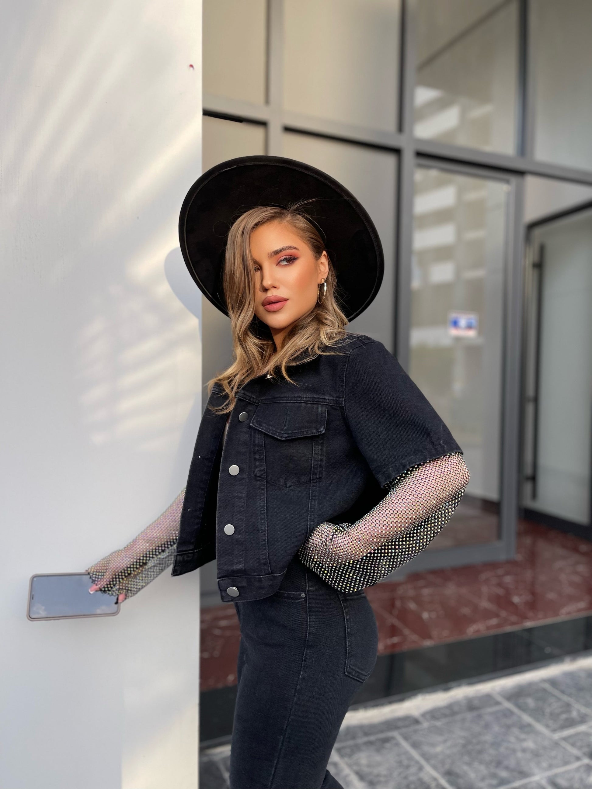 Xhaket me menge rrjet me gure. Mberthimi behet me kopsa ne pjesen e perparme. Xhaketa eshte me jake me kapak dhe xhepa te bollshem. Modeli vjen ne dy ngjyra: e zeze, blu.