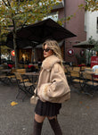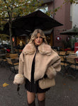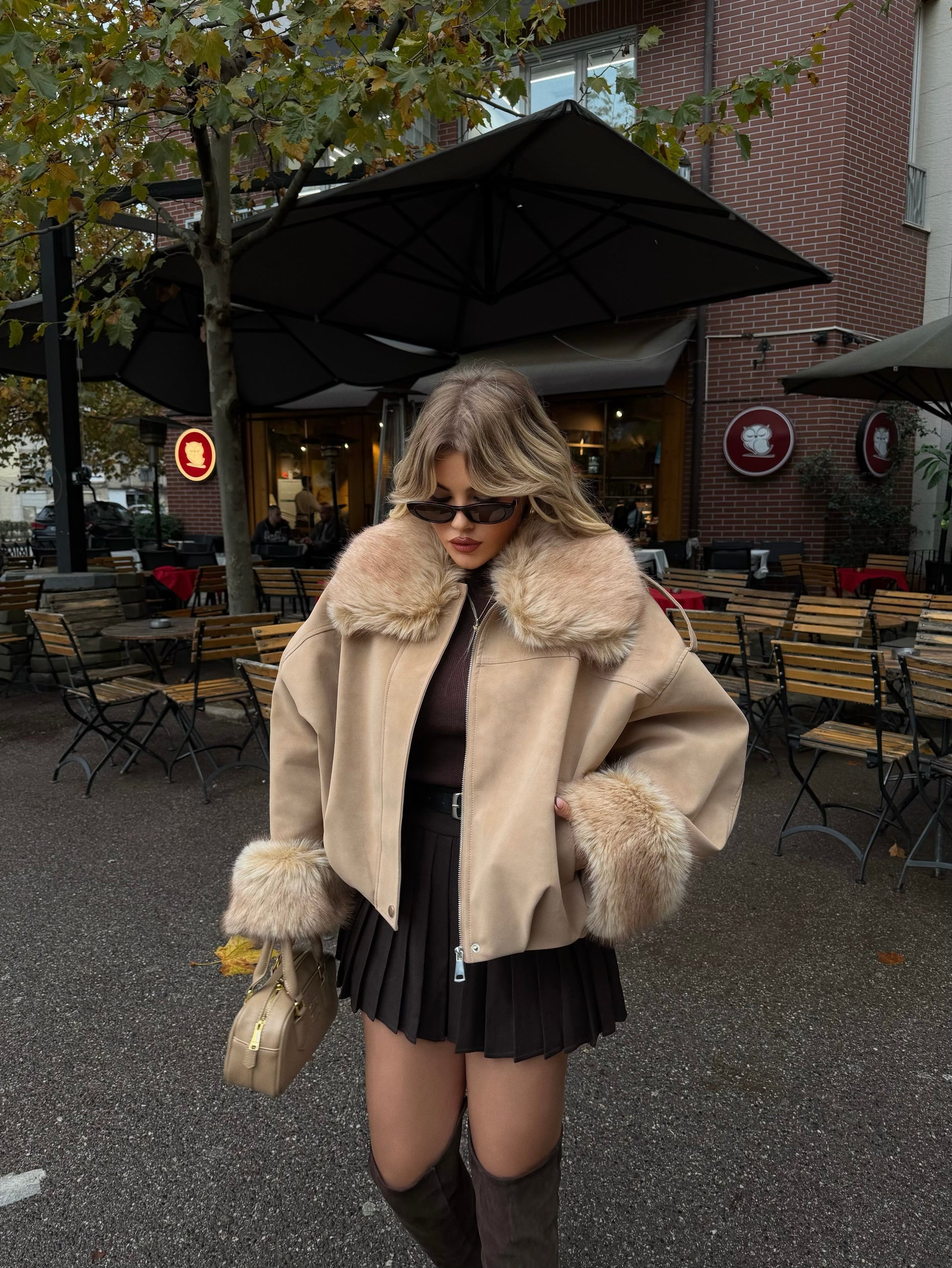 Xhakete e butë dhe e ngrohtë me pellush, në ngjyrë bezhe dhe kafe. Perfekte për ditët e ftohta, duke kombinuar rehati dhe stil të thjeshtë e modern.