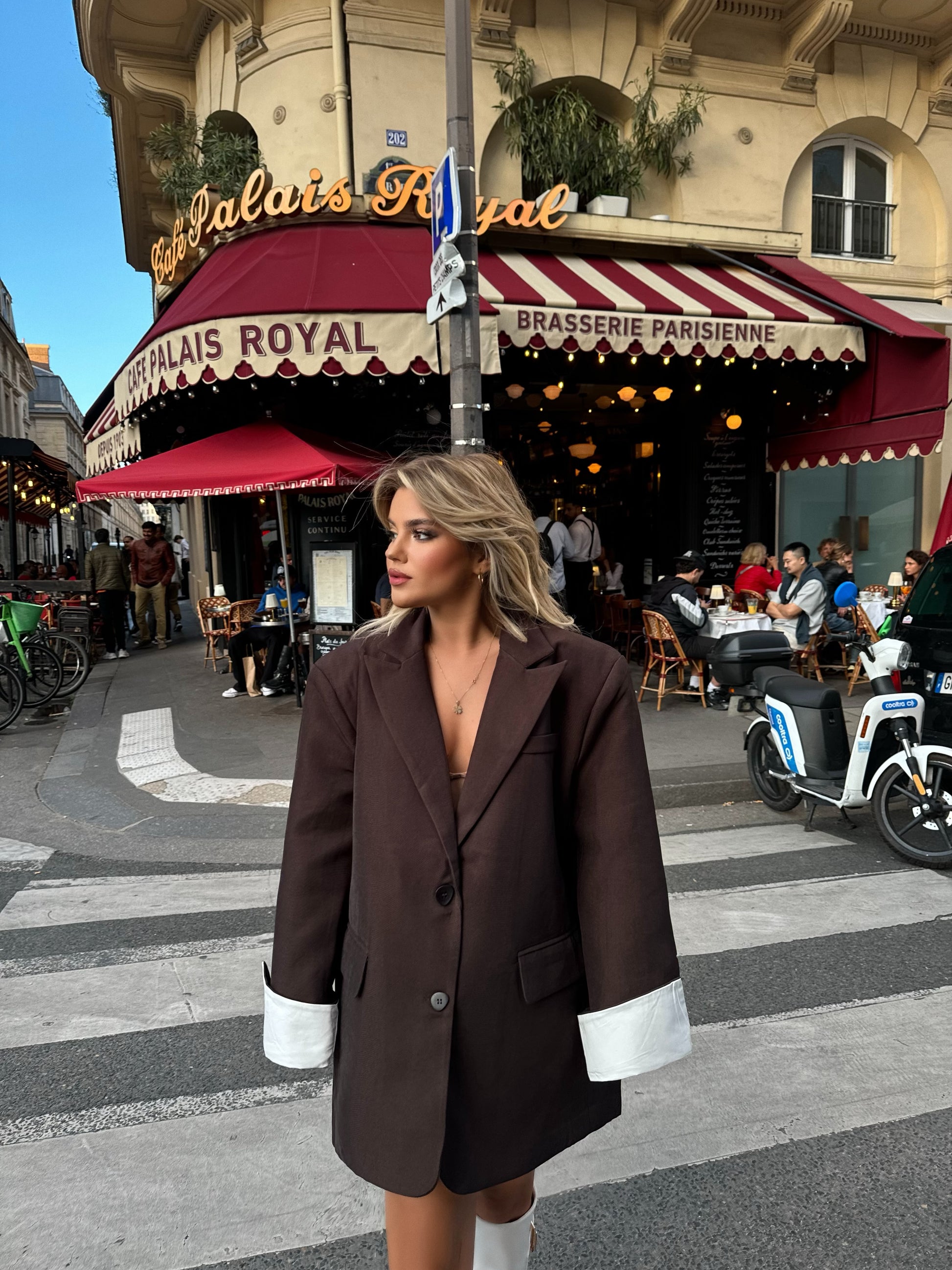 Xhakete oversize ne ngjyre kafe te erret, me menge te gjata dhe detaj kontrastuese ne ngjyre te bardhe. Model modern dhe elegant per nje stil te vecante.