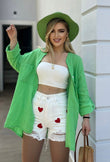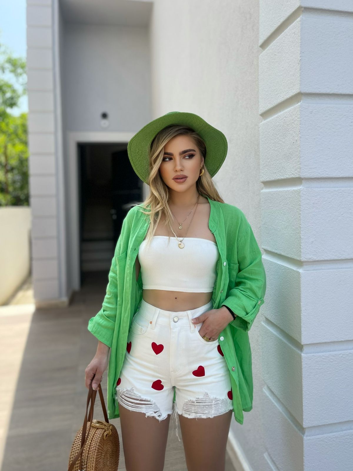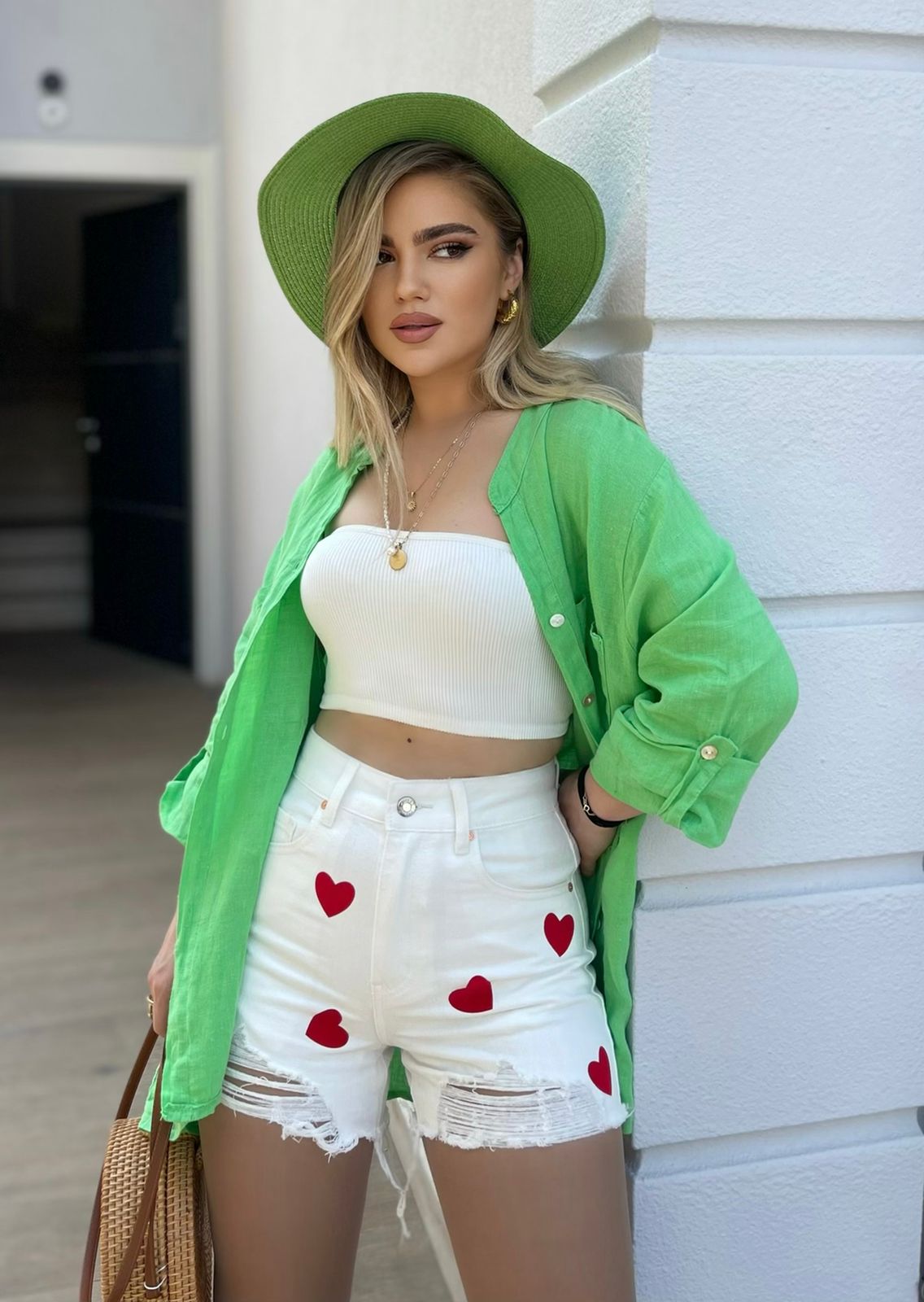 Xhinse te bardha me zemra te kuqe. Ne pjesen e parme jane te grisura. Kane bele te larte dhe xhepa te bollshem. Mberthimi behet me kops dhe zinxhire. Lehtesisht te kombinueshme dhe teper figurante.