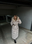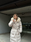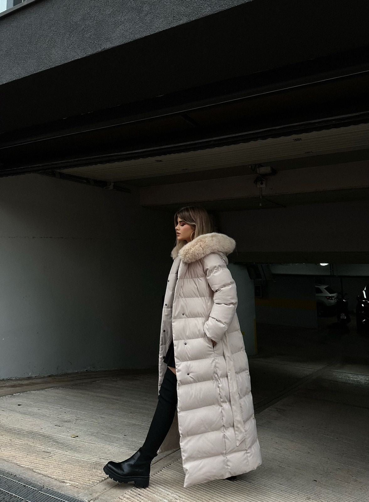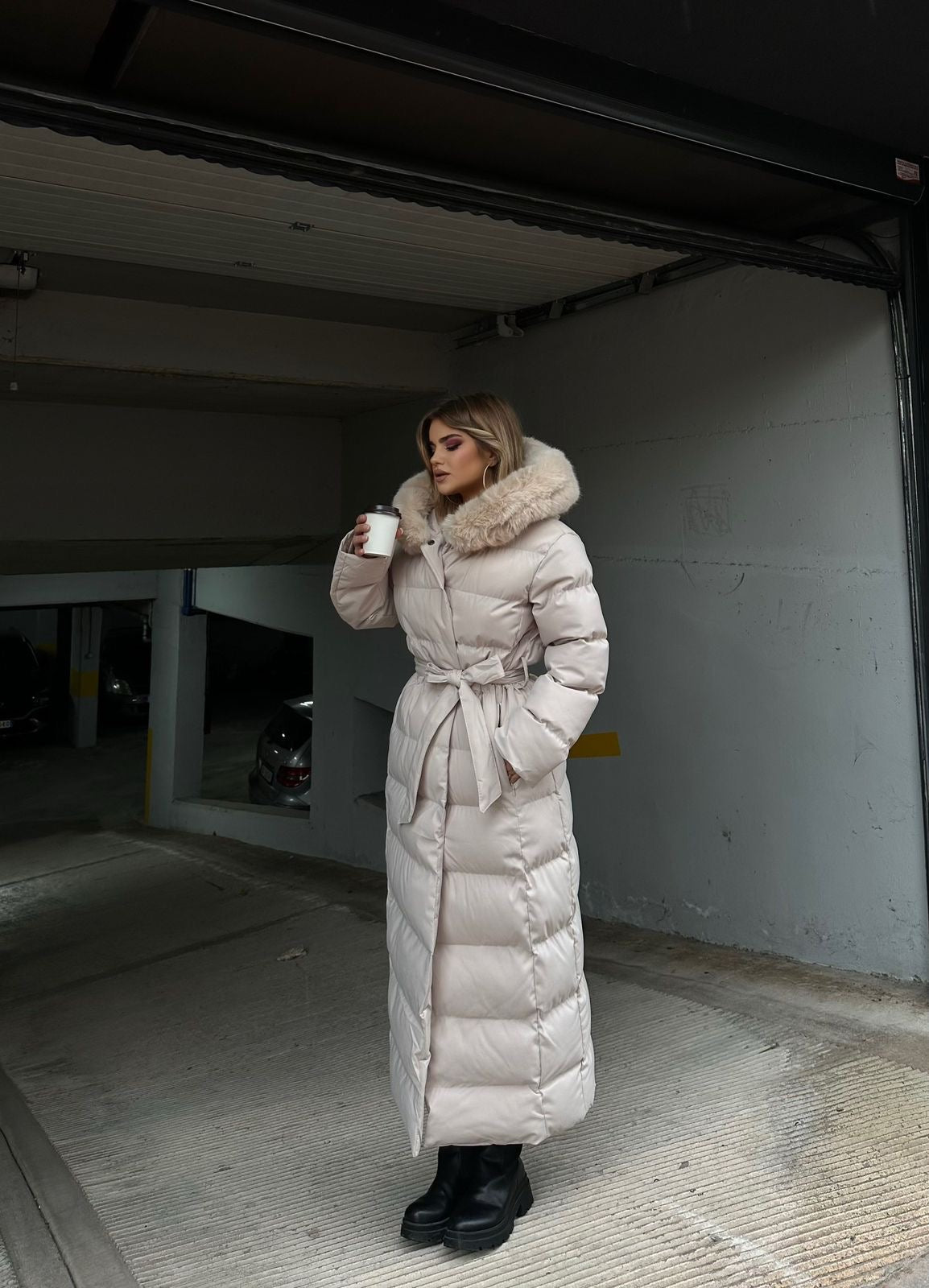 Xhup i gjate ne ngjyren bezhe. Xhupi eshte i shoqeruar me rripin dhe kapuc me pellush. Material cilesore dhe i ngrohte. Ideal per ditet e ftohta te dimrit.