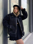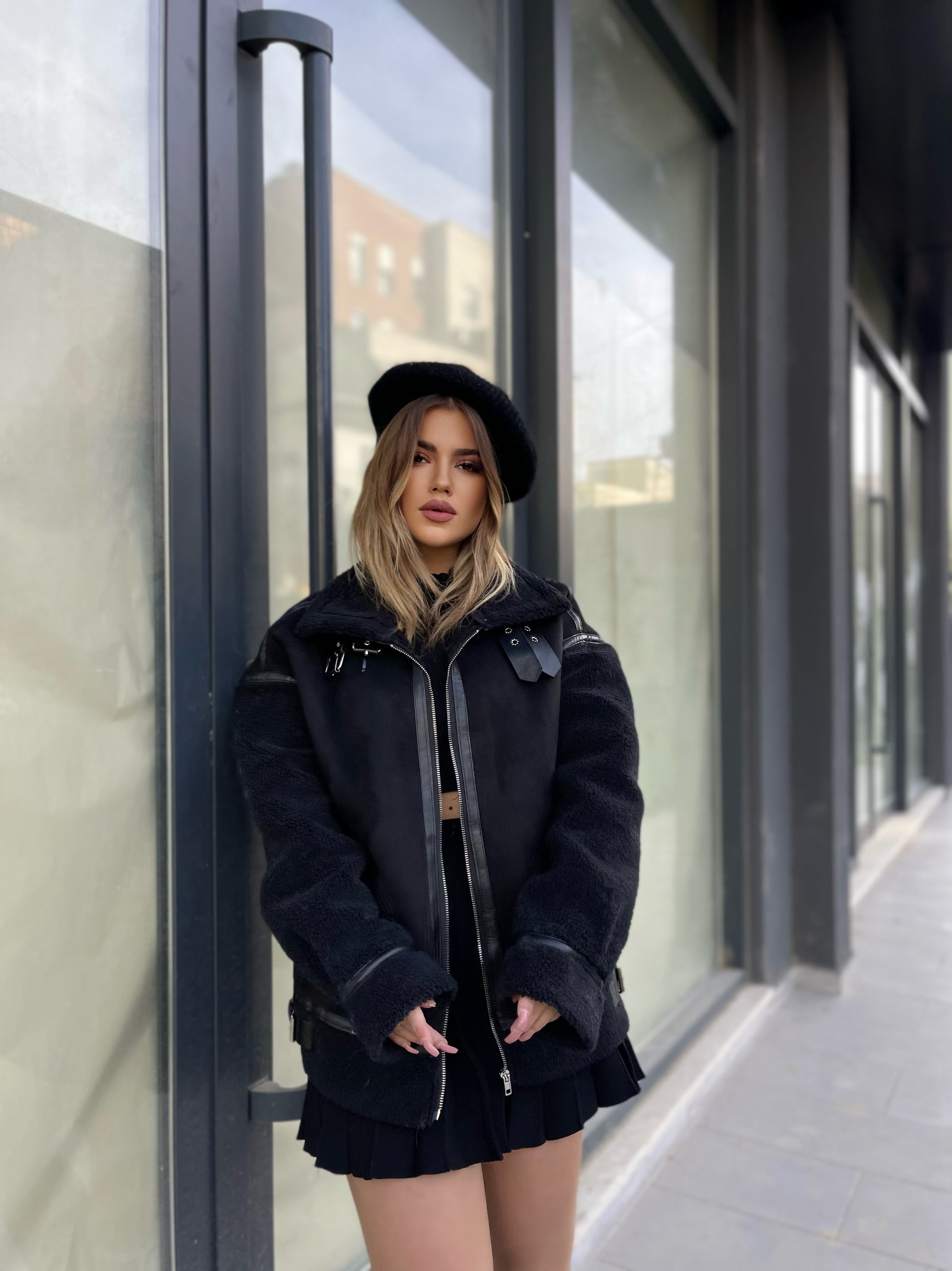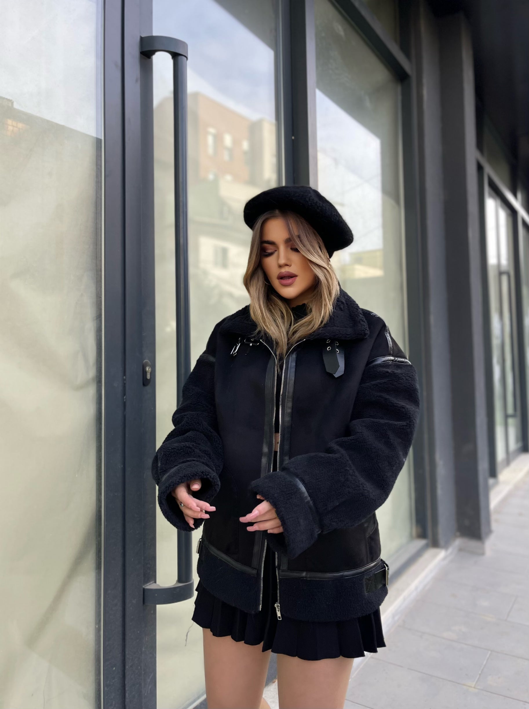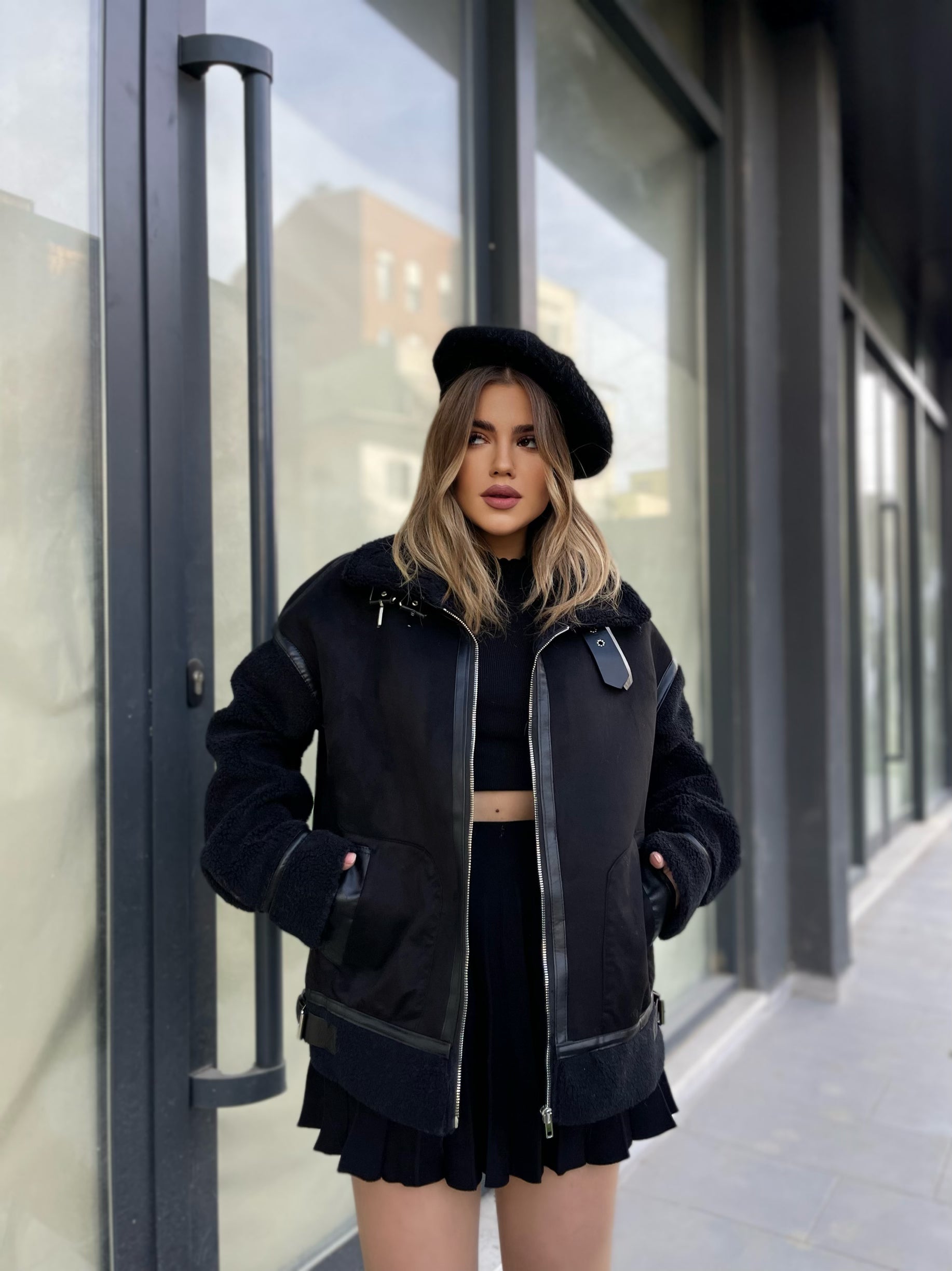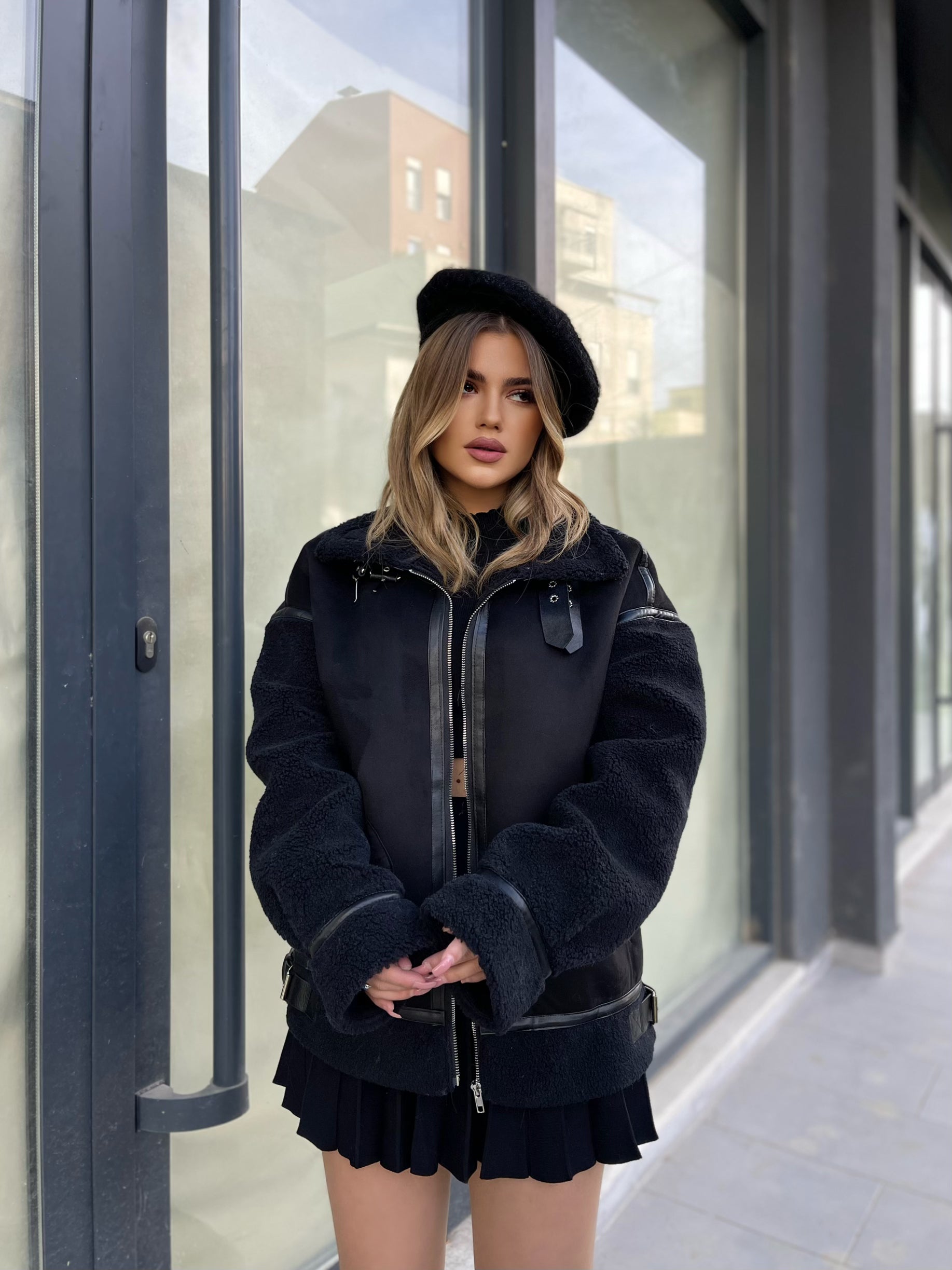 Xhup me menge me pellush me jake me kapak. Me rripa me togz ne pjesen e jakes. Me xhepa ne pjesen e perparme. Mberthimi behet me zinxhir ne pjesen e perparme.
