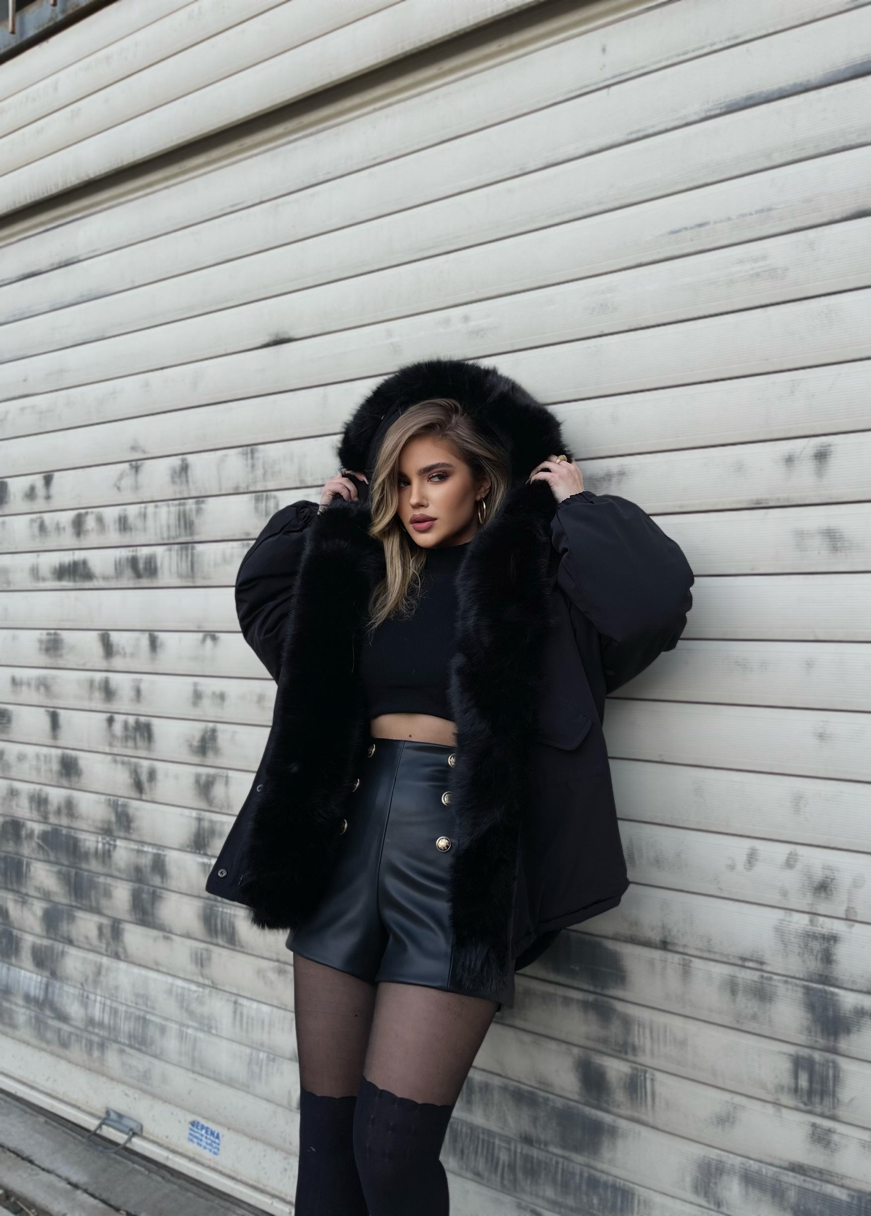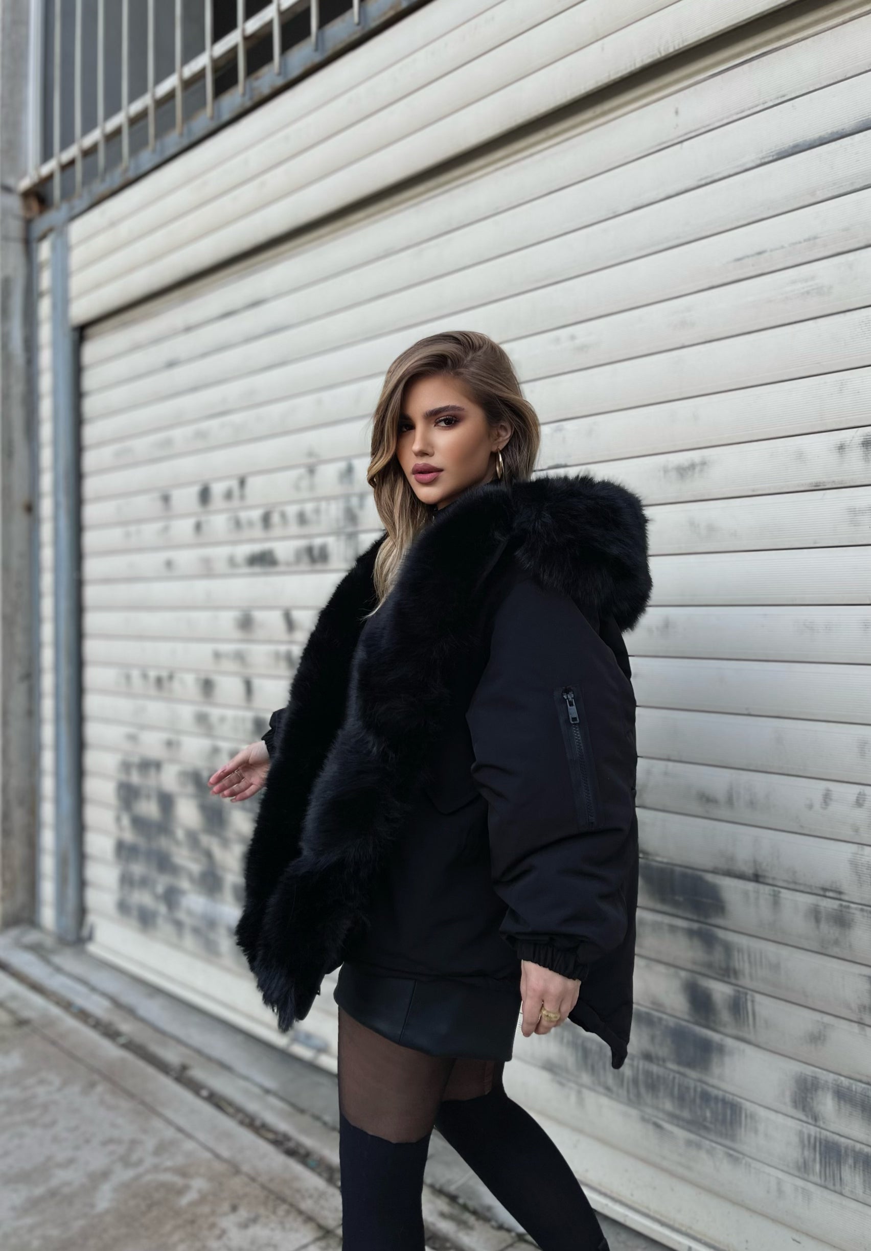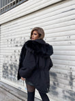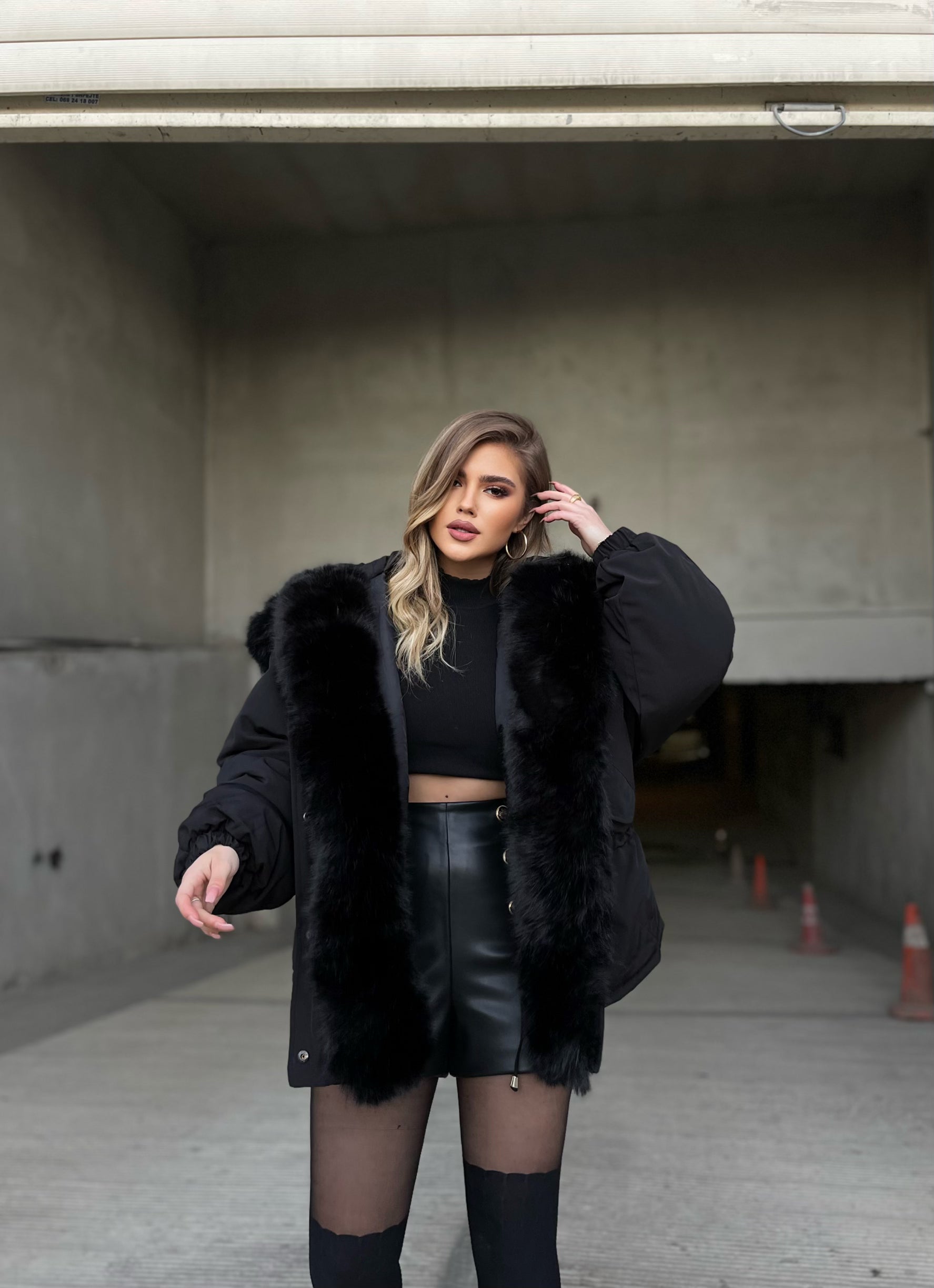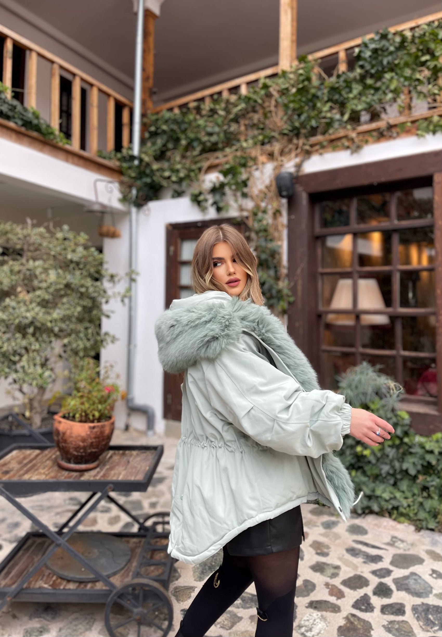 Xhup pellush me menge te gjata me llastik ne pjesen e mengeve. Me xhep ne pjesen e mengeve. Me llastik ne pjesen e belit. Mberthimi behet me zinxhir dhe precin te brendshme.