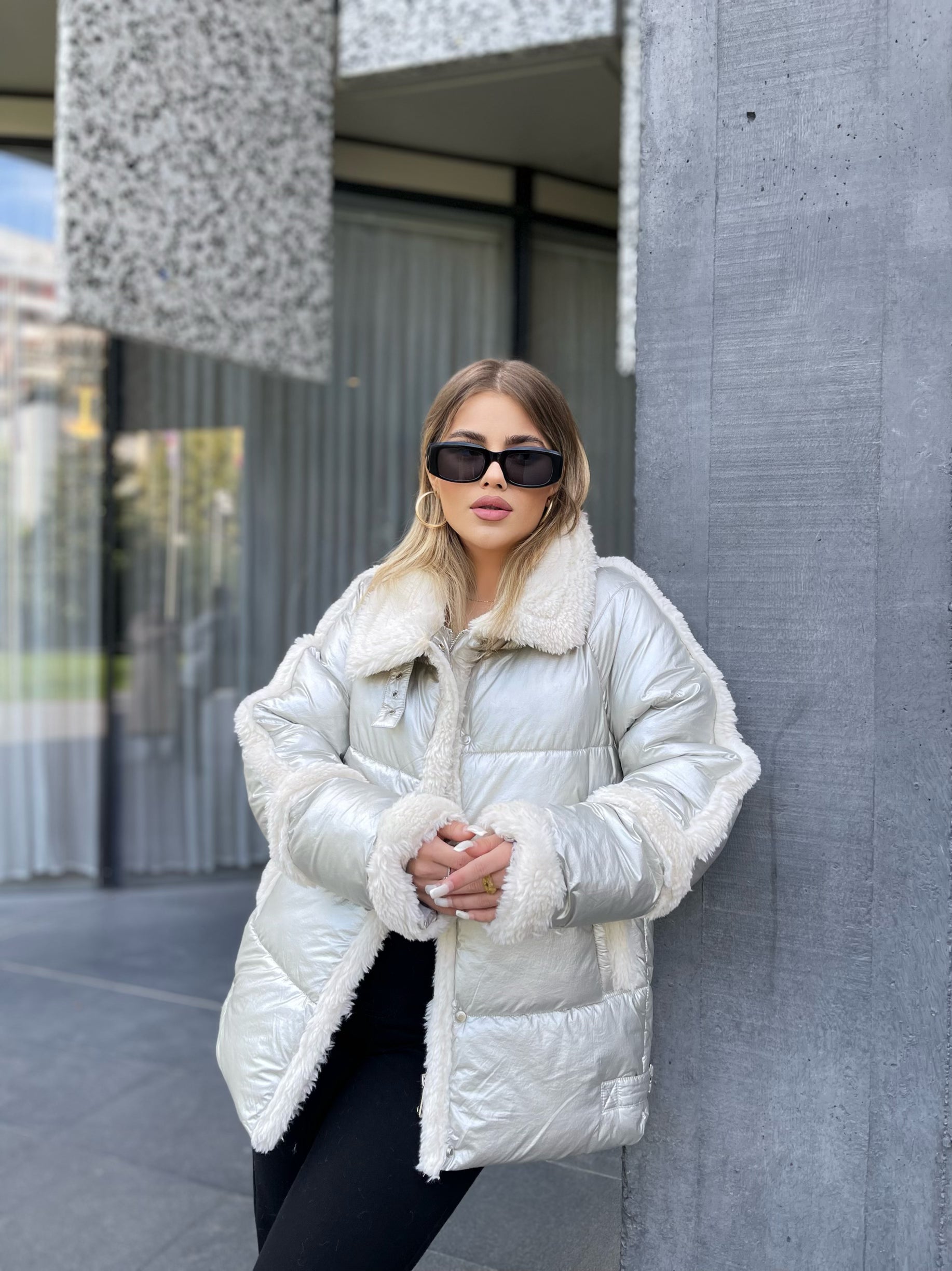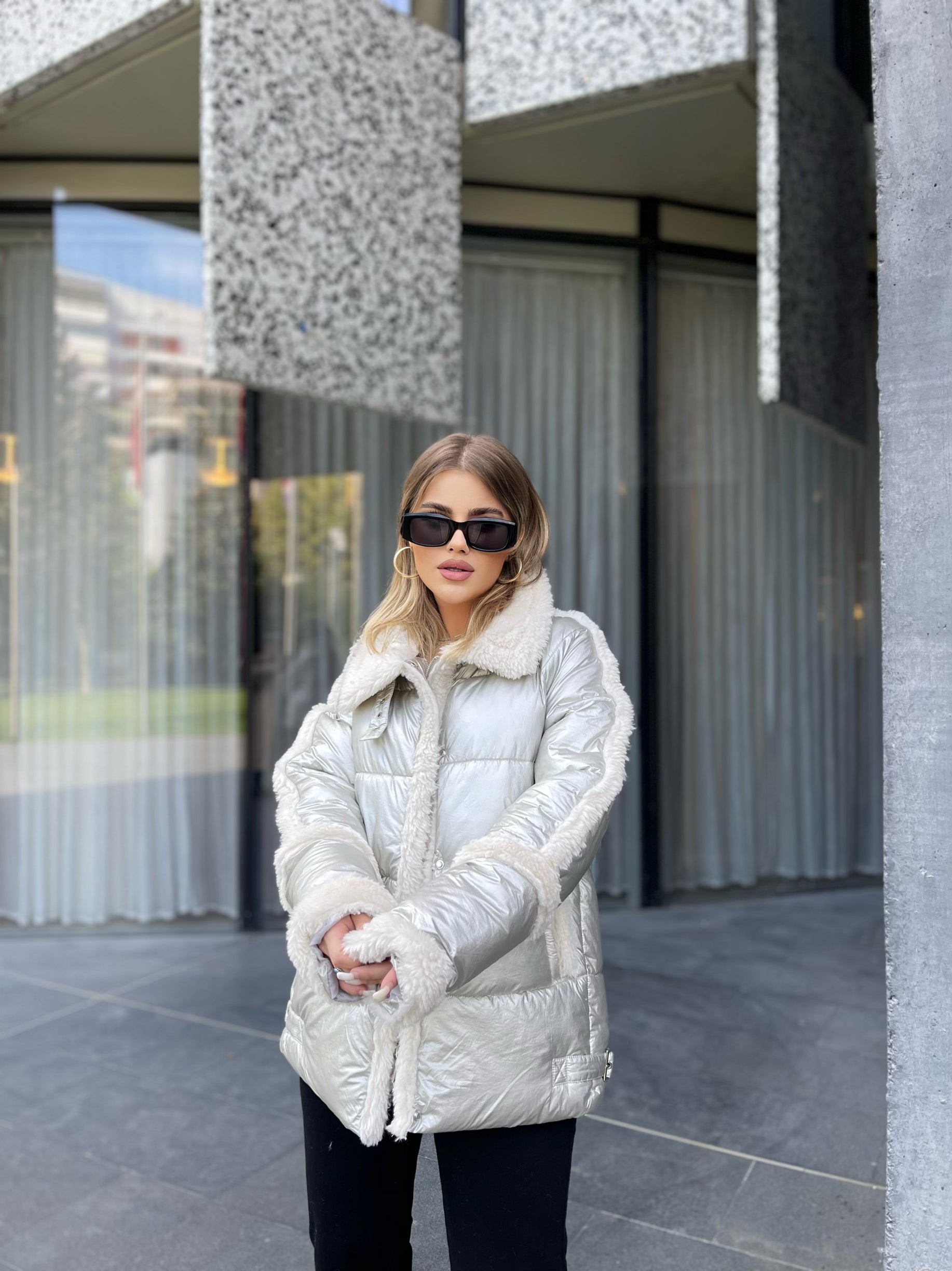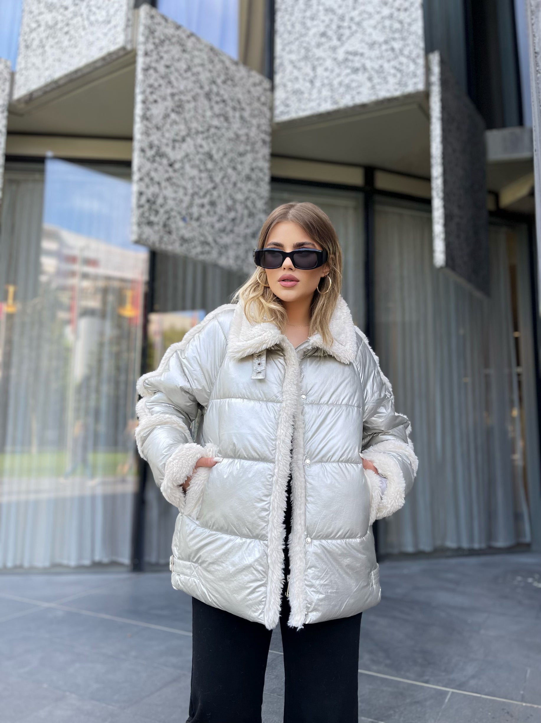 Xhup metalizzato me pellush me jake me kapak me menge te gjata. Me xhepa te bollshem. Mberthimi behet me zinxhir te brendshem dhe precina te brenshme.