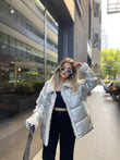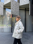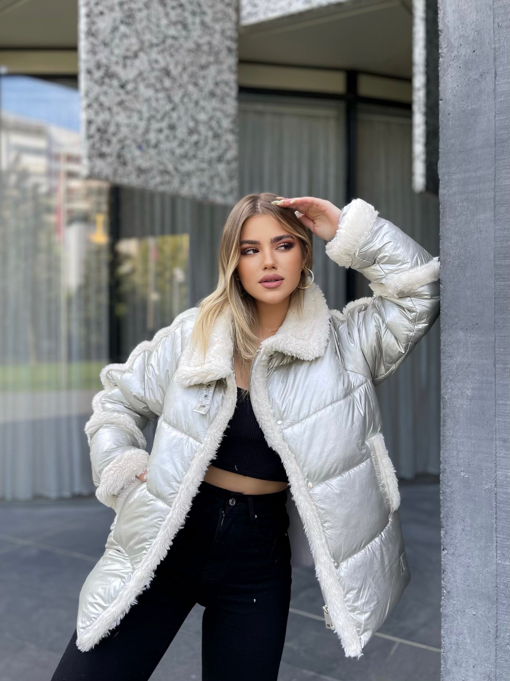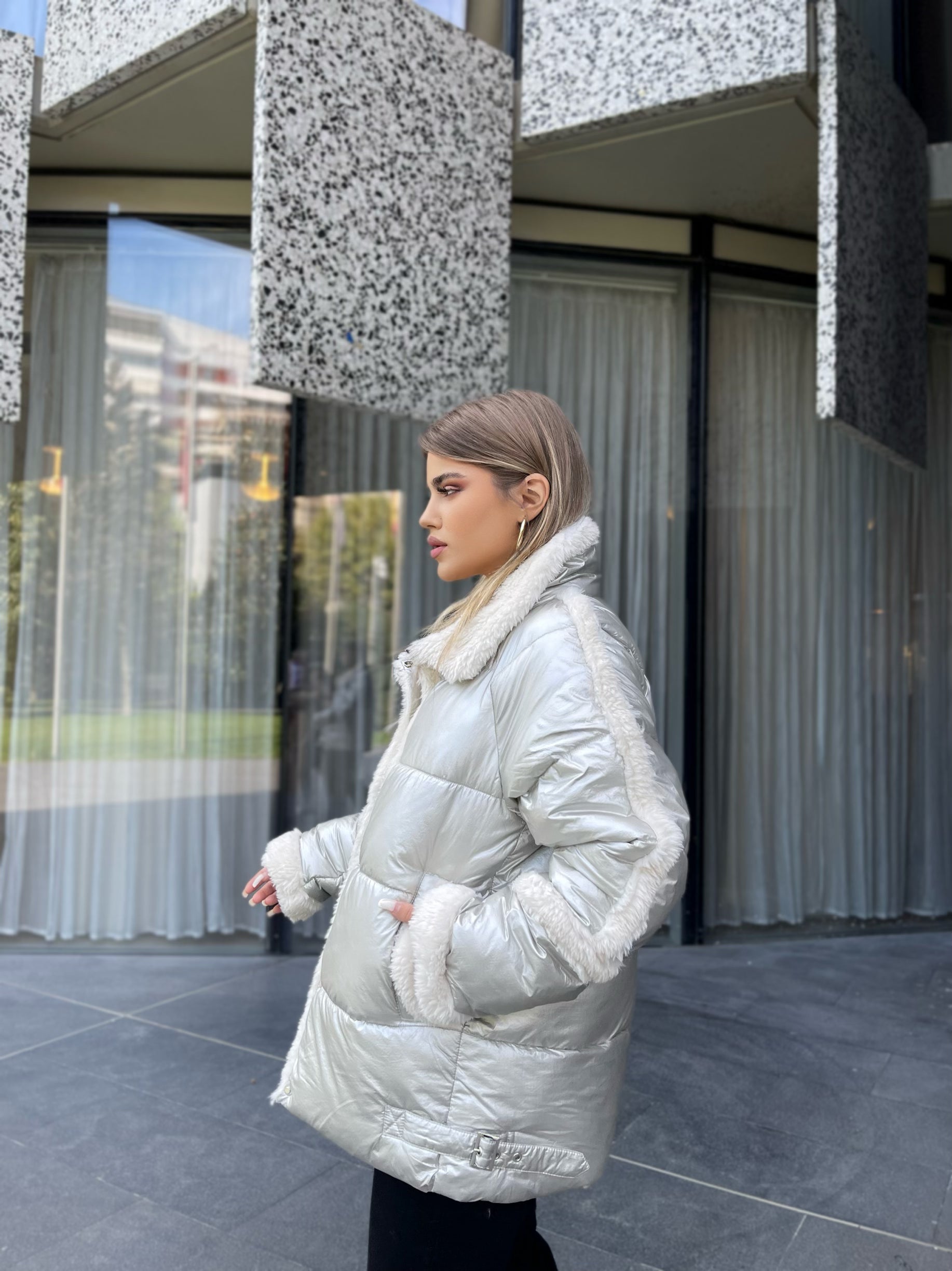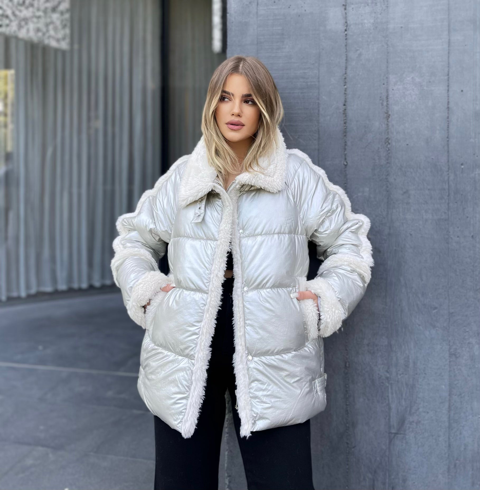 Xhup metalizzato me pellush me jake me kapak me menge te gjata. Me xhepa te bollshem. Mberthimi behet me zinxhir te brendshem dhe precina te brenshme.