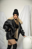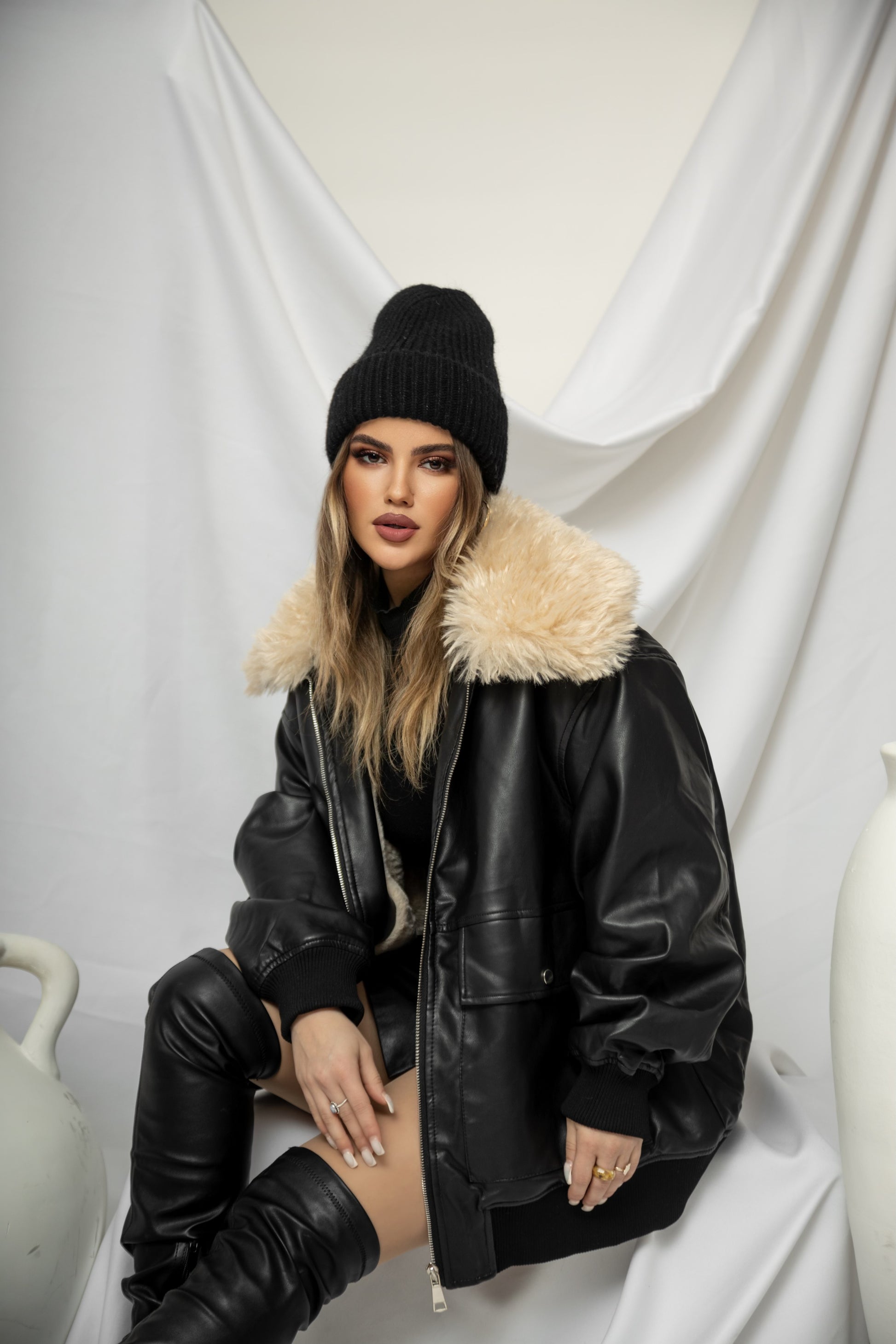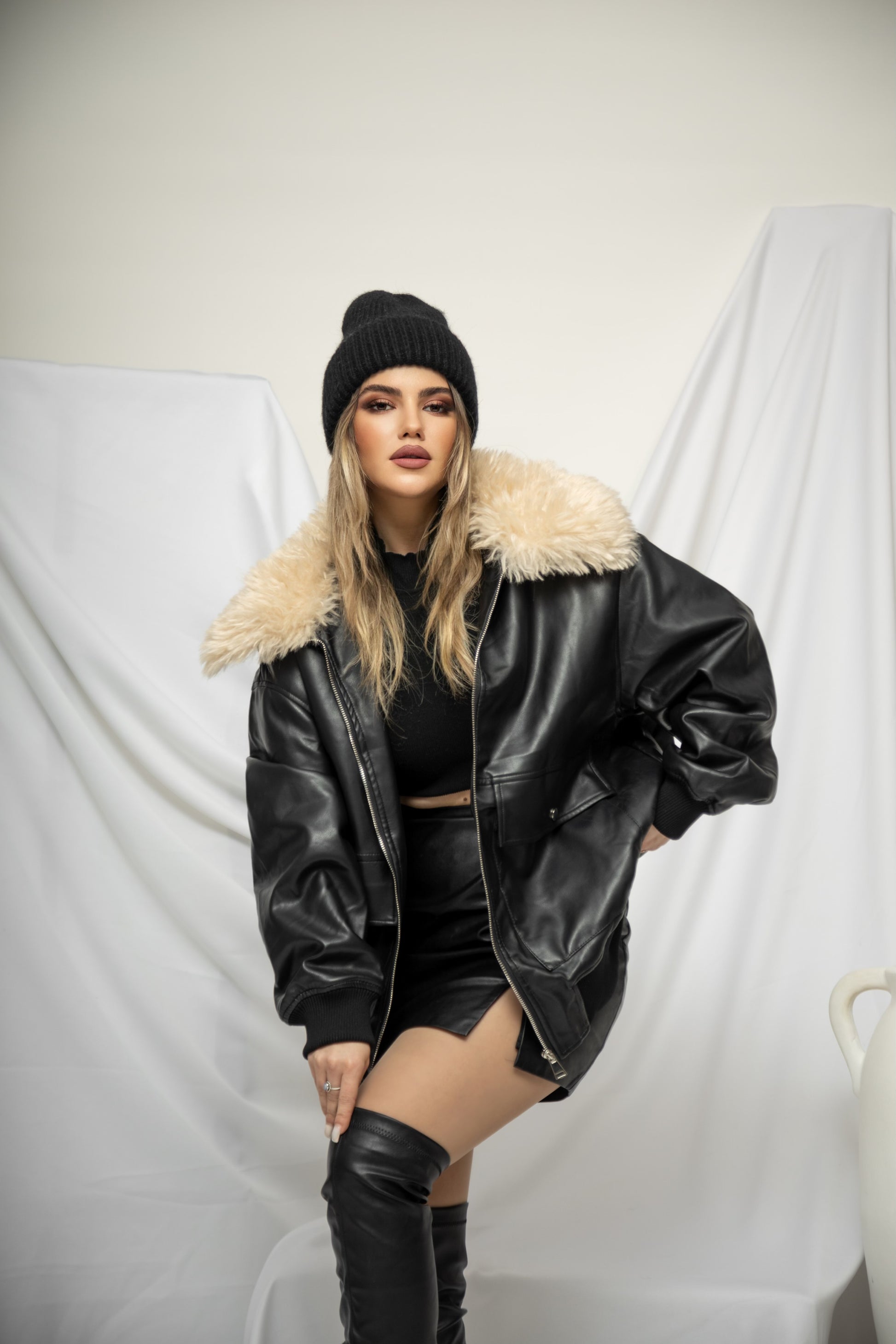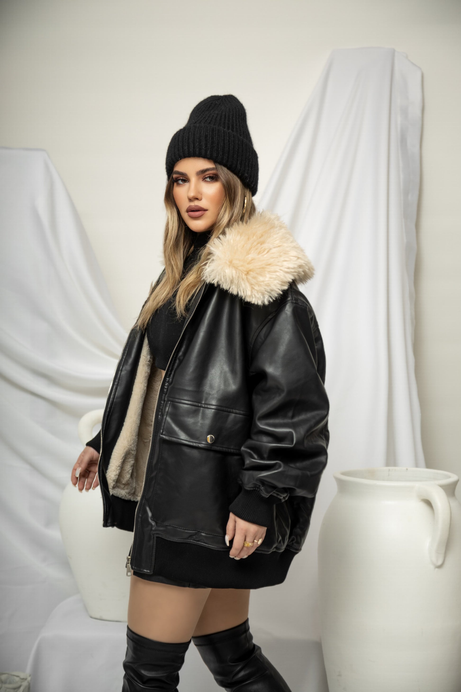 Xhup pellush i shkurter me jake me kapak me pellush me menge te gjata. Me xhepa pllak ne pjesen e perparme.. Mberthimi behet me zinxhir ne pjesen e perparme.