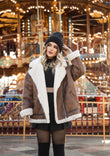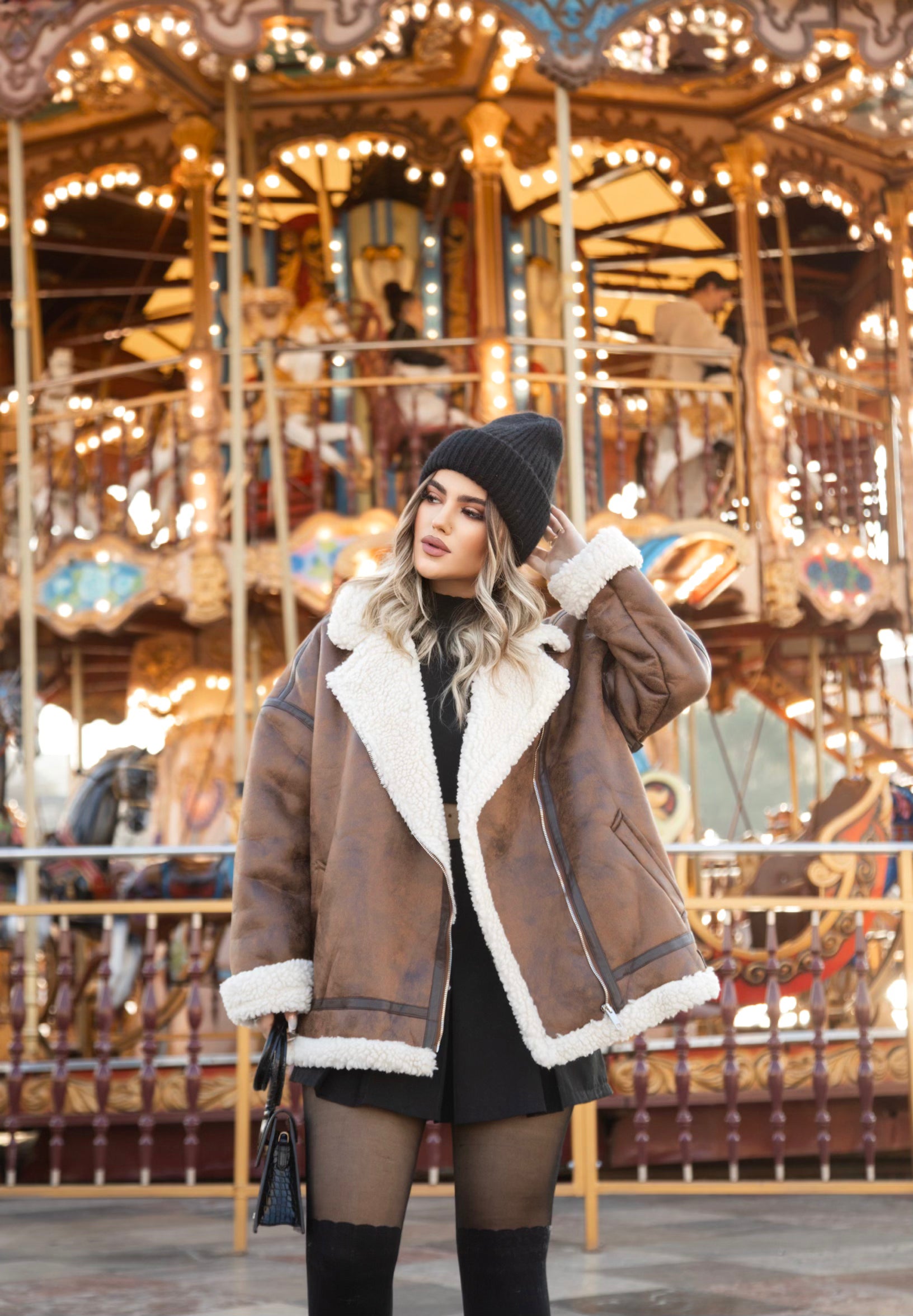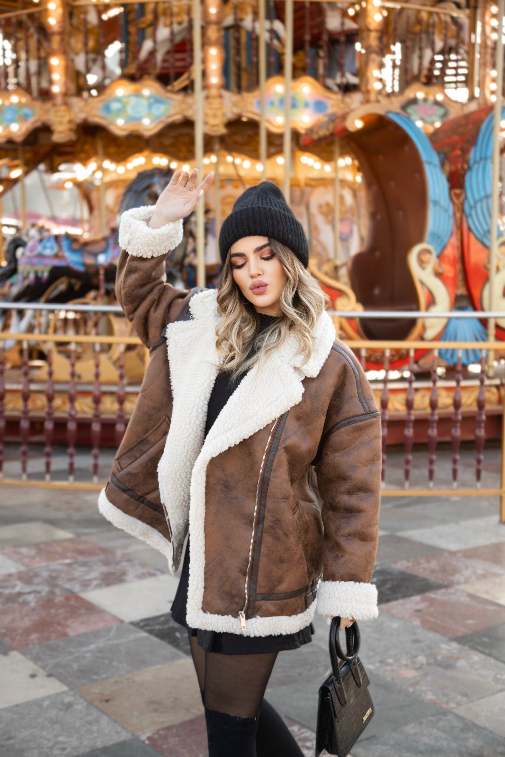 Pellush ne ngjyre kafe. Brenda eshte i gjithi pellush, ne ngjyre bezhe. Eshte me pellush tek jaka dhe me xhepa.