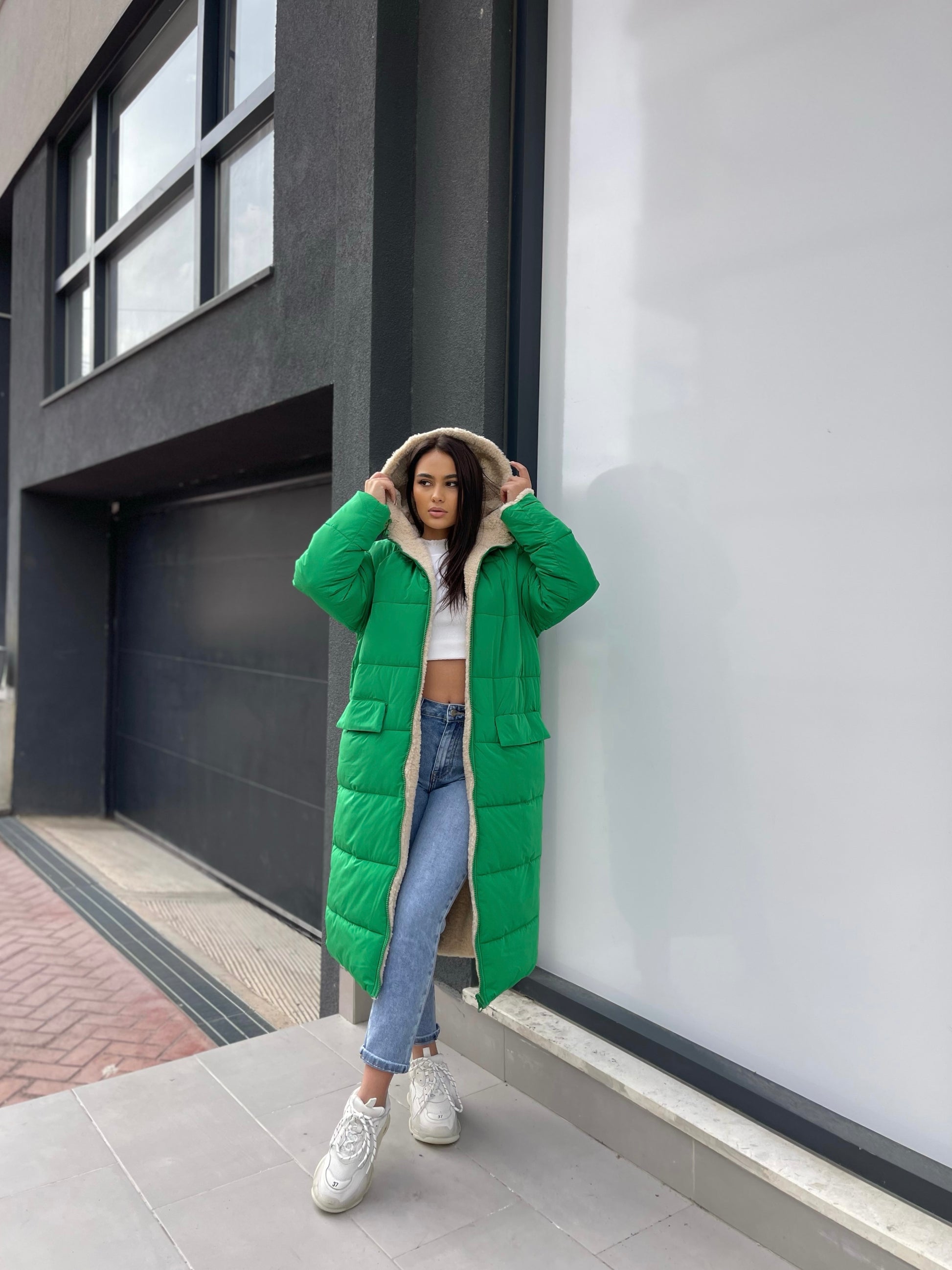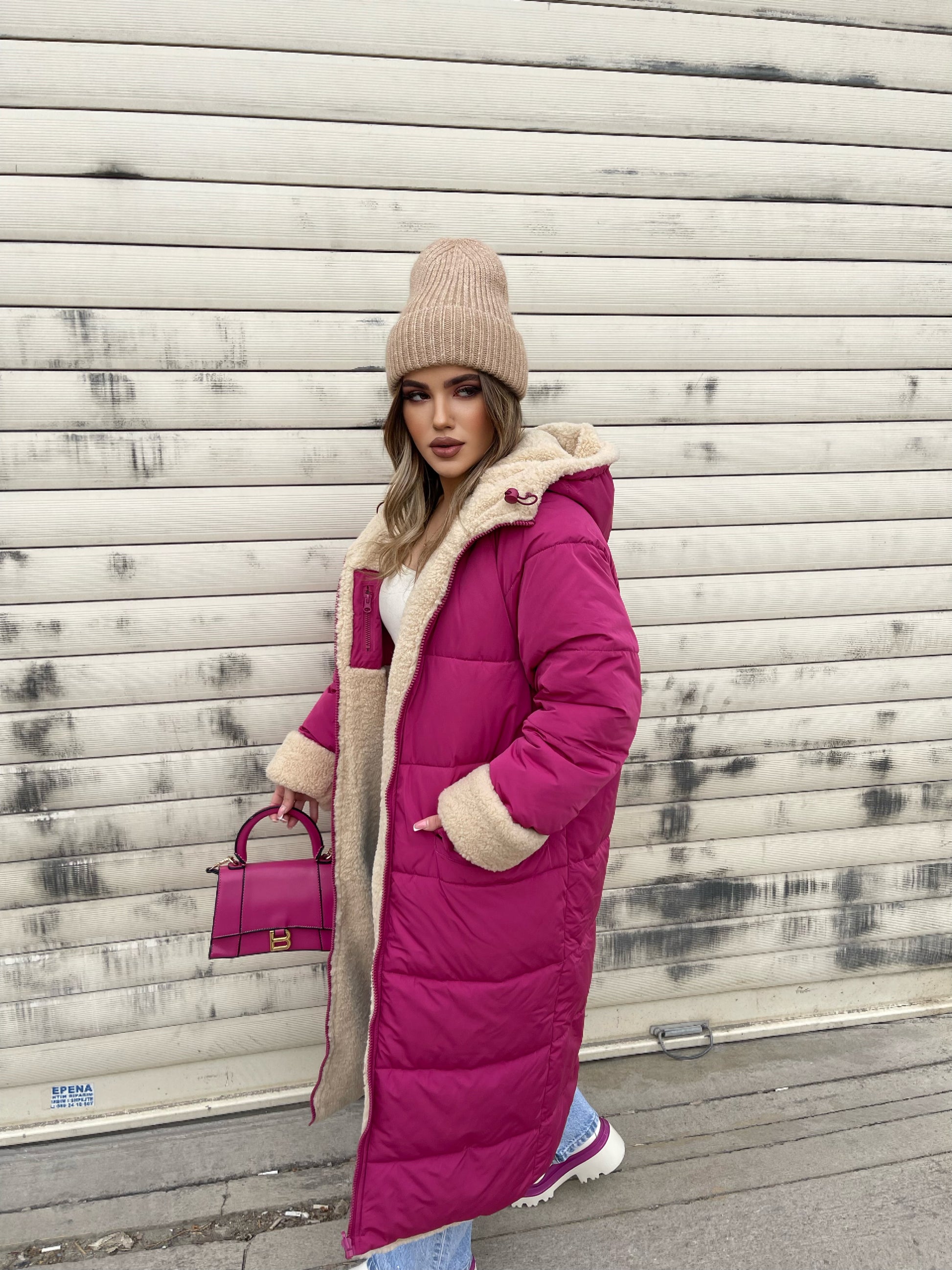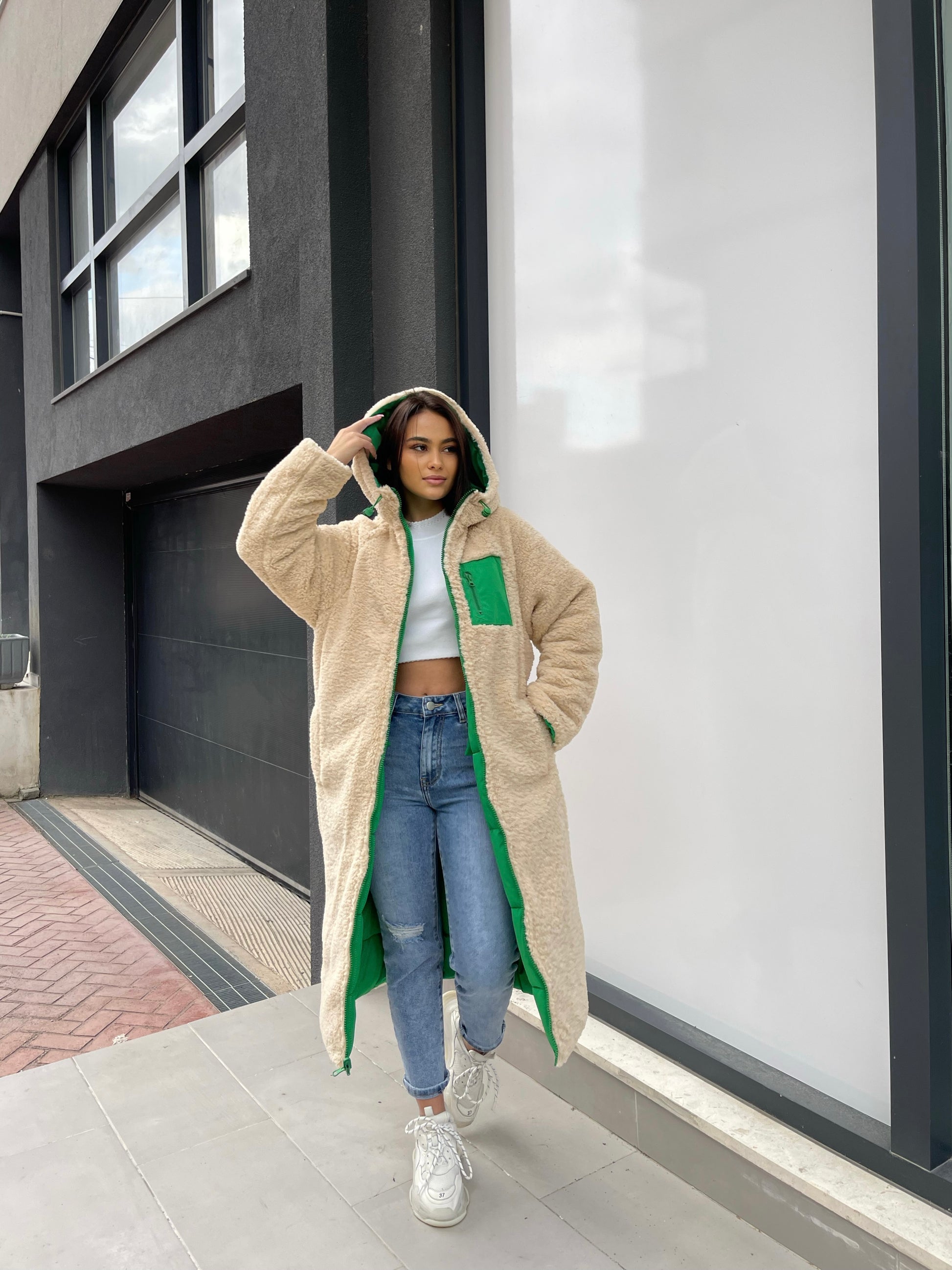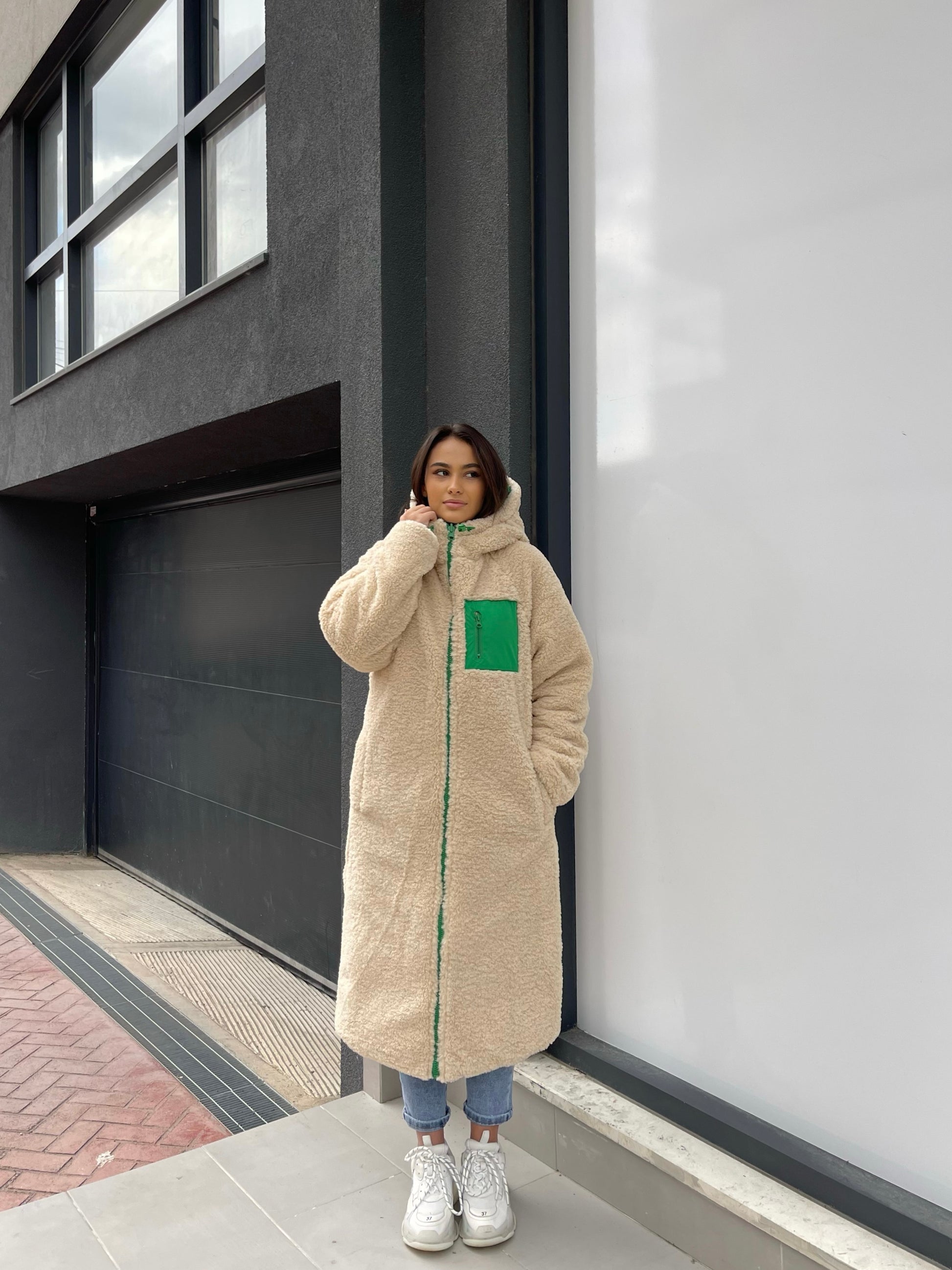 Xhup pellush i gjate me menge te gjata. Me xhepa pllak ne pjesen e perparme. Xhupi vishet nga te dyja anet. Me kapuc te bollshem dhe llastik ne pjesen e kapucit. Teper komod dhe i rehatshem.